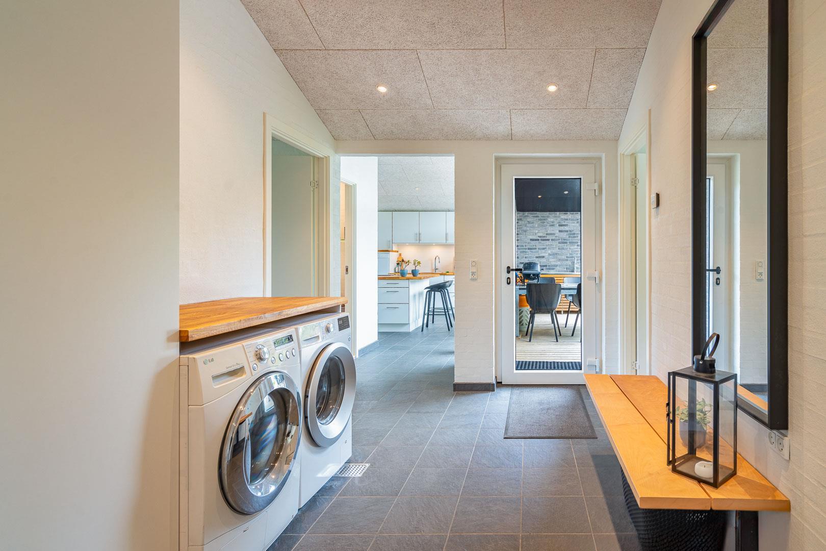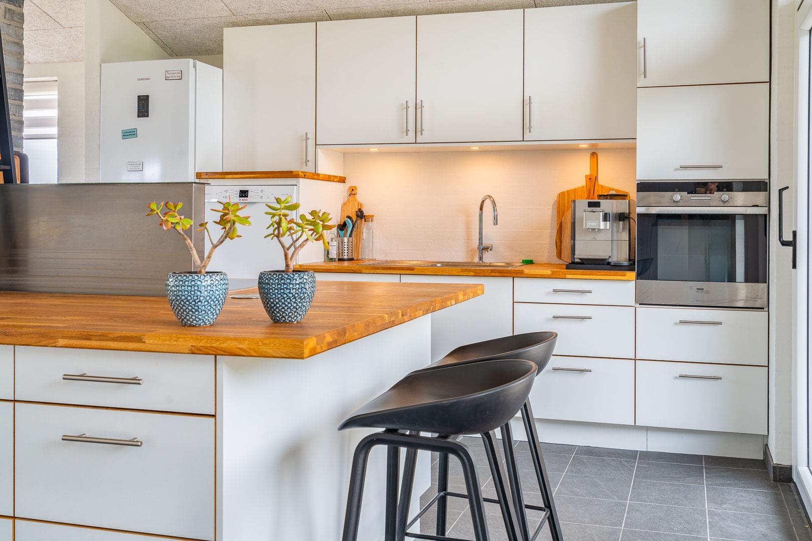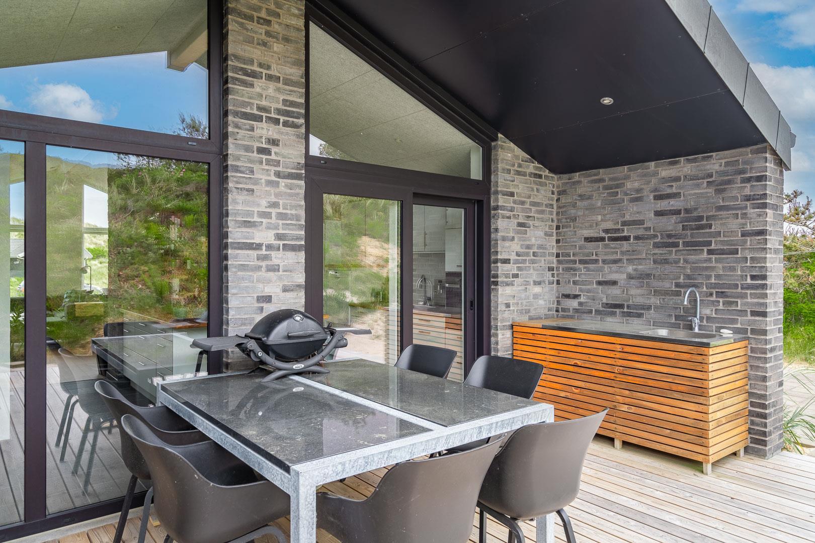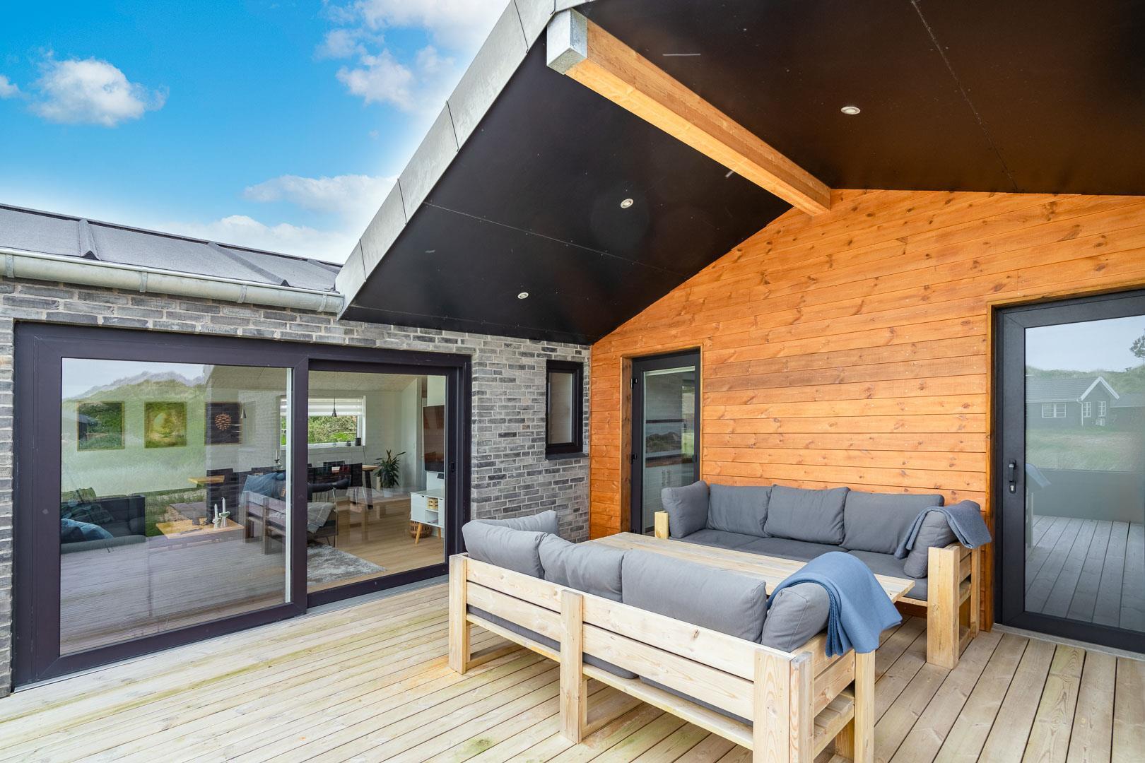 Køkkenet har udgang til endnu en overdækket terrasse, perfekt til at tage maden med ud og nyde hyggelige grillaftener. De overdækkede terrasser skaber ideelle rammer for udendørs ophold, uanset vejret.