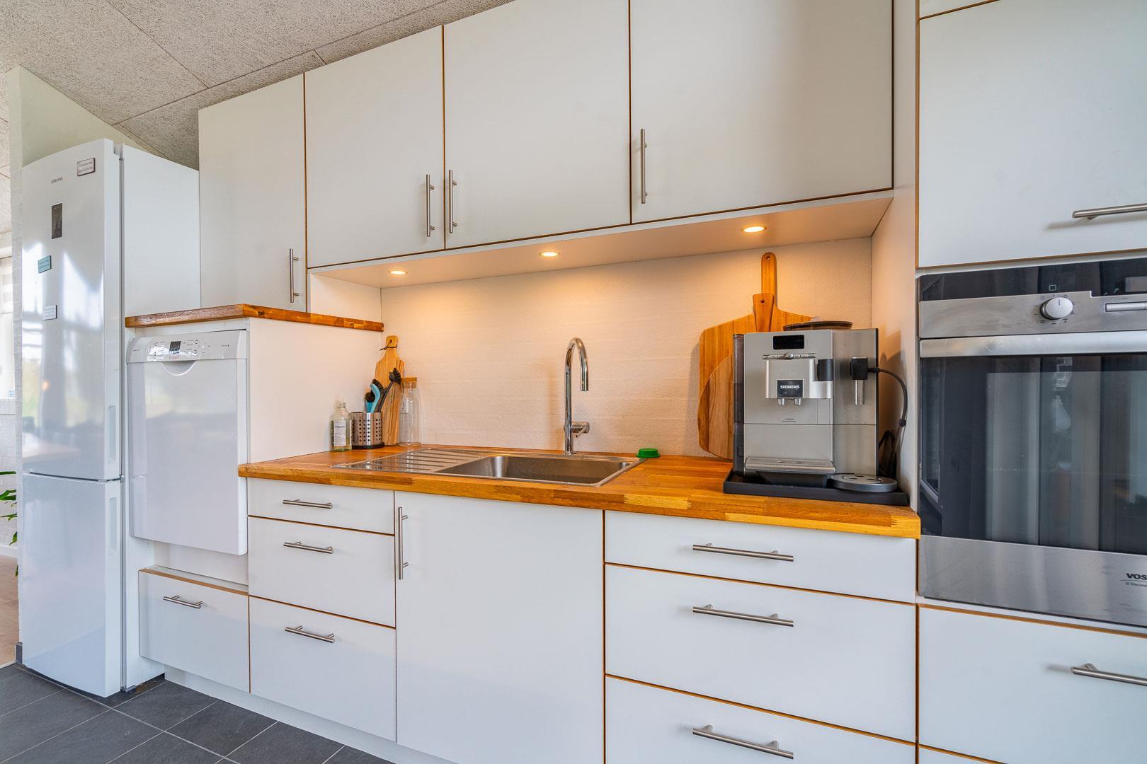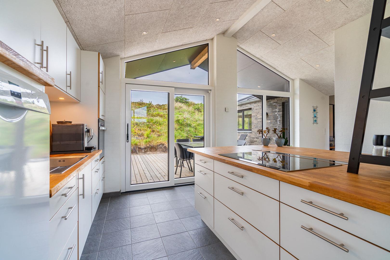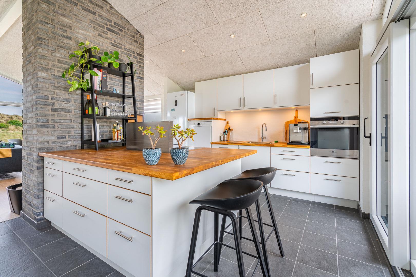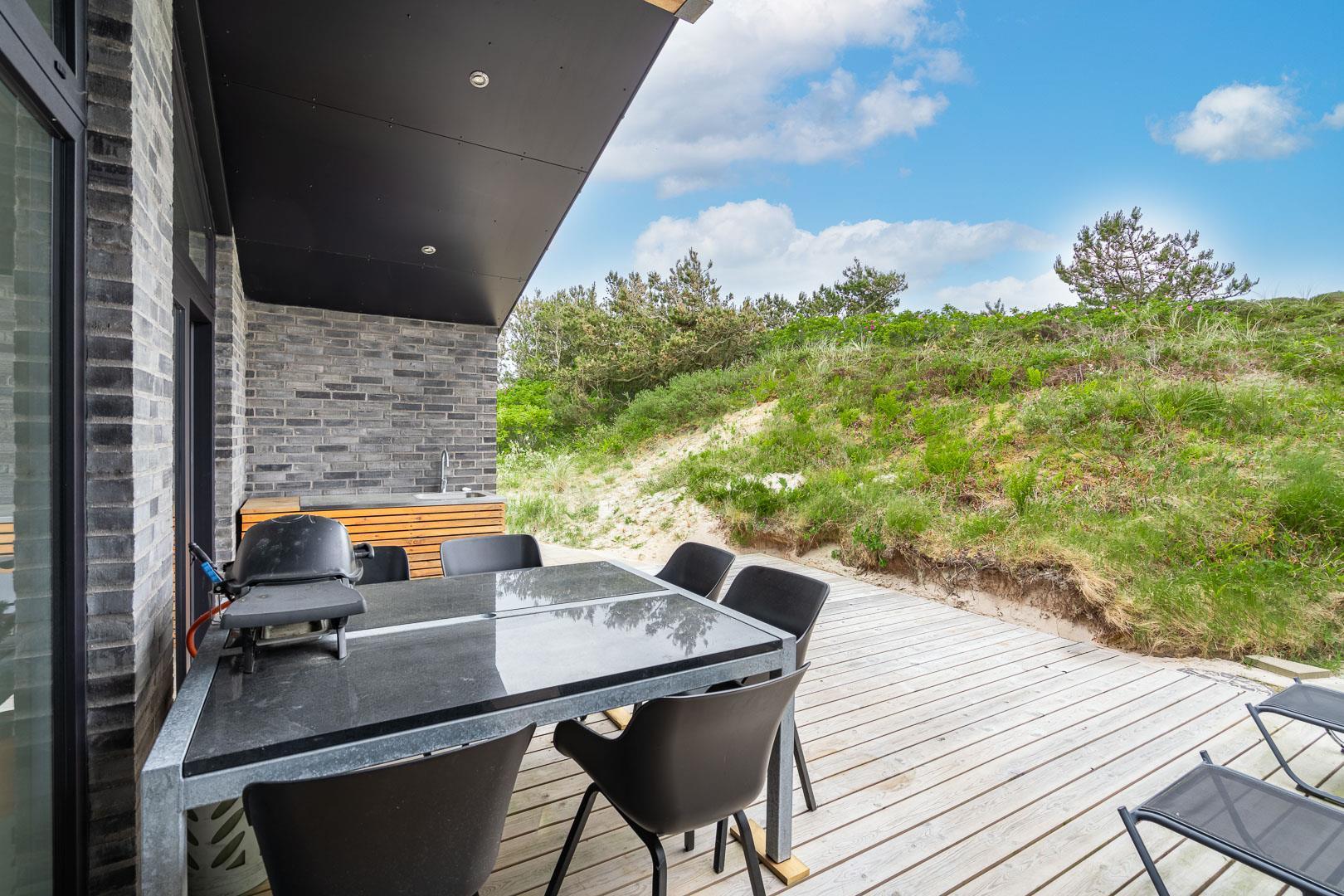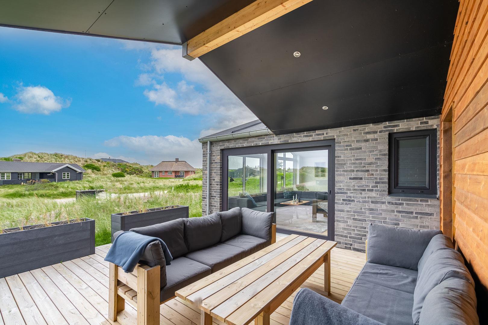 Køkkenet har udgang til endnu en overdækket terrasse, perfekt til at tage maden med ud og nyde hyggelige grillaftener. De overdækkede terrasser skaber ideelle rammer for udendørs ophold, uanset vejret.