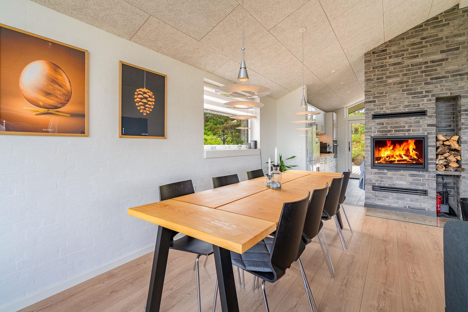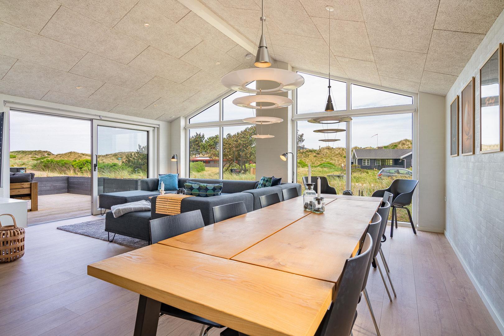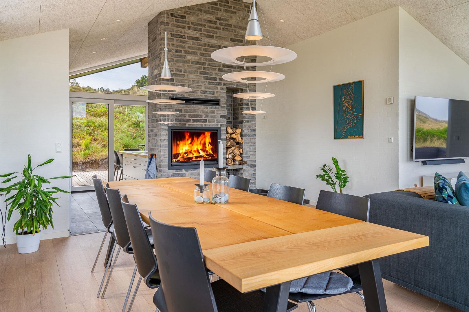Huset er designet til at rumme op til 8 personer og byder på et moderne køkken, der smelter sammen med stuen, kun adskilt af en stilfuld murstensvæg med en indbygget pejs. Denne smarte opdeling skaber en hyggelig atmosfære. Den lyse stue har højt til loftet og store vinduespartier, som lader dagslyset strømme ind. Herfra kan du åbne den store skydedør og træde ud på en af de overdækkede terrasser, udstyret med komfortable havemøbler, hvor du kan nyde din morgenkaffe og den smukke natur.