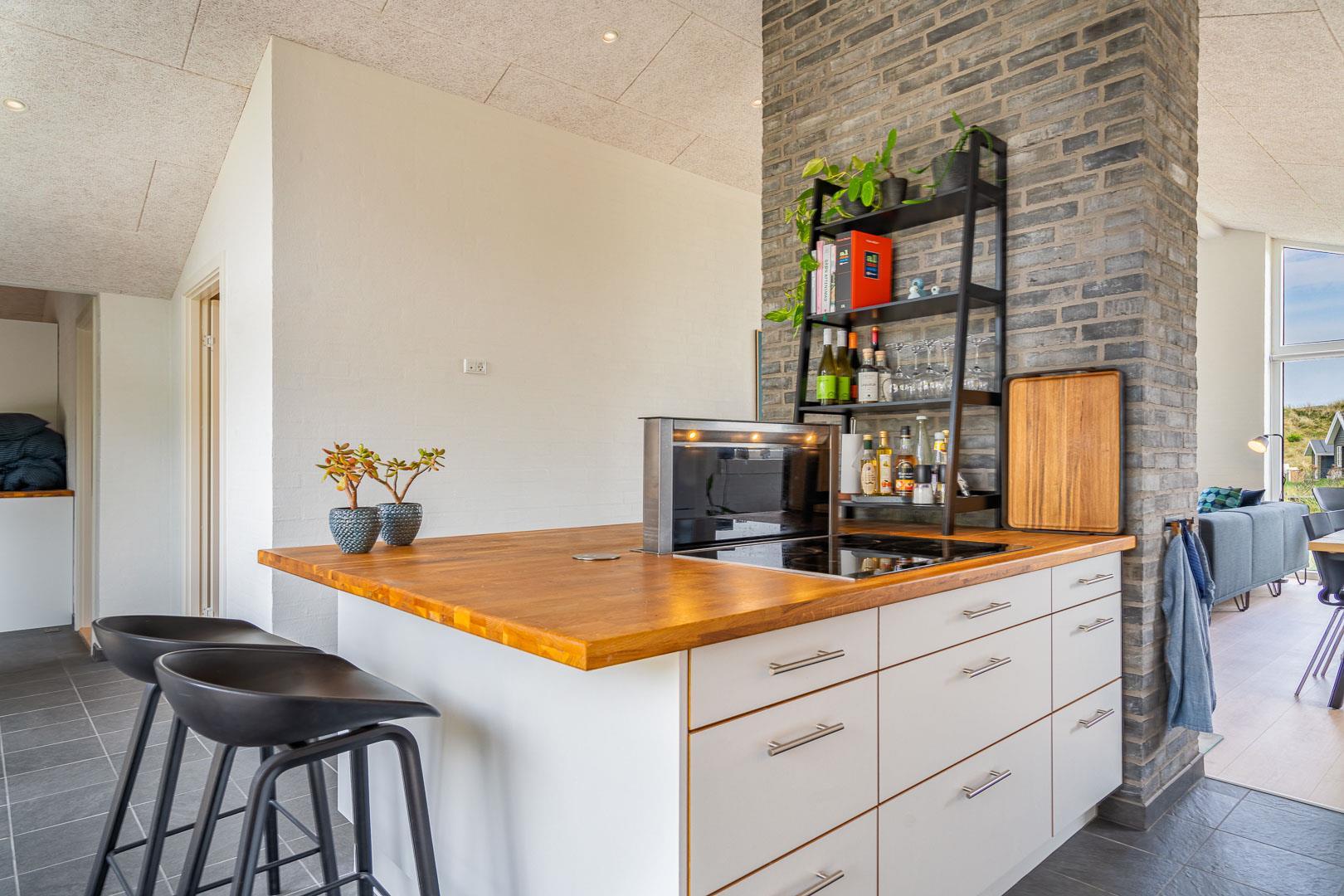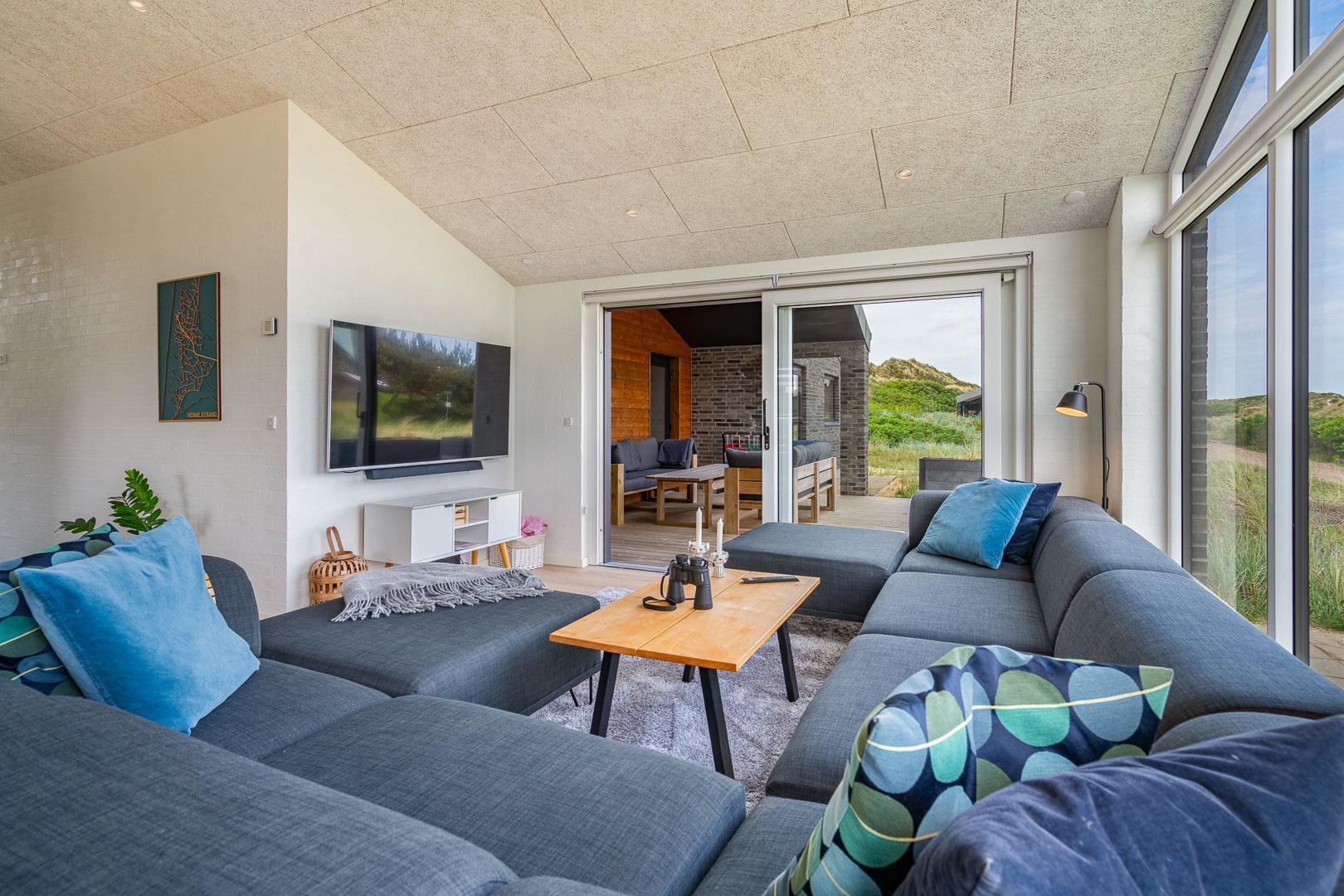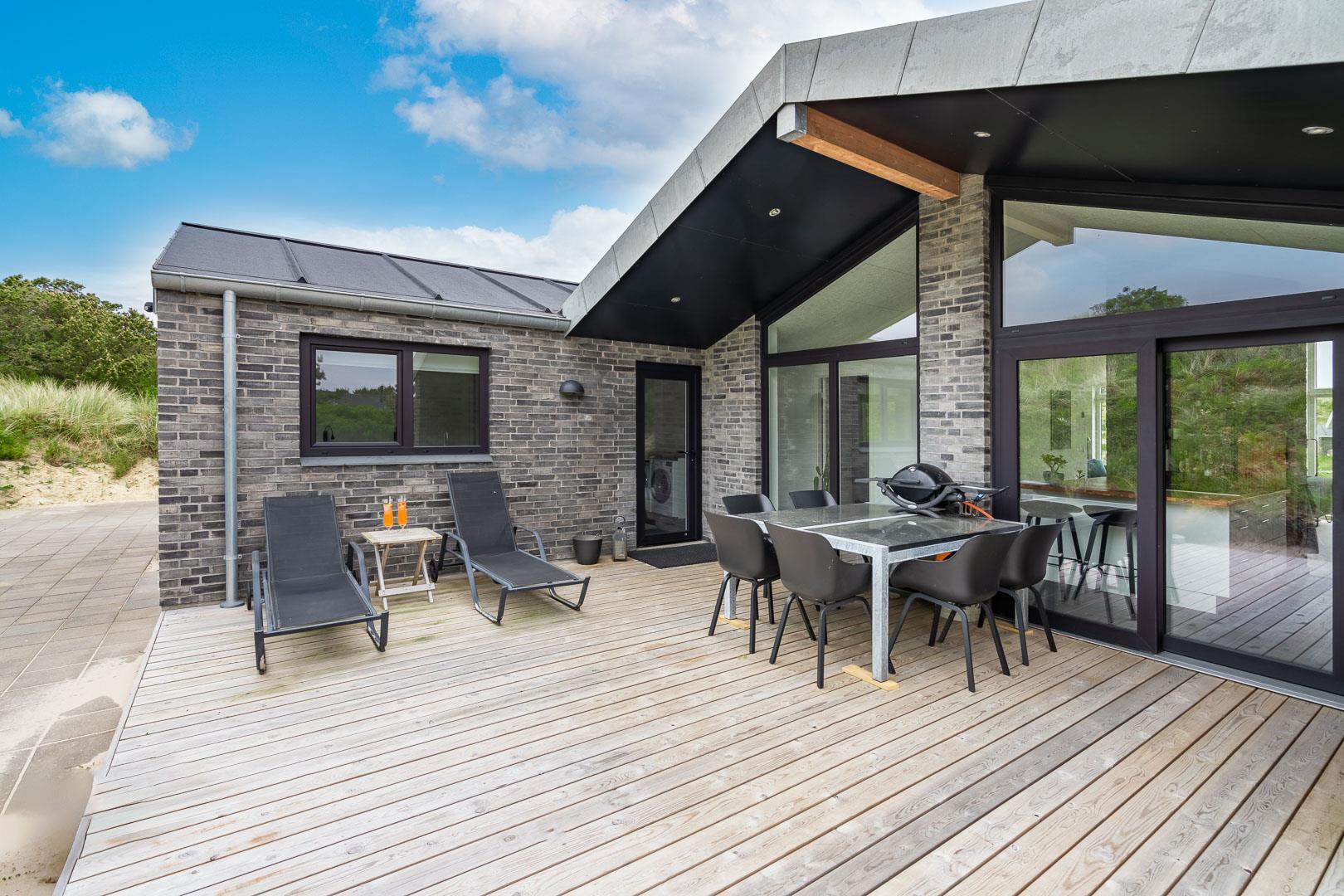 Huset er designet til at rumme op til 8 personer og byder på et moderne køkken, der smelter sammen med stuen, kun adskilt af en stilfuld murstensvæg med en indbygget pejs. Denne smarte opdeling skaber en hyggelig atmosfære. Den lyse stue har højt til loftet og store vinduespartier, som lader dagslyset strømme ind. Herfra kan du åbne den store skydedør og træde ud på en af de overdækkede terrasser, udstyret med komfortable havemøbler, hvor du kan nyde din morgenkaffe og den smukke natur.