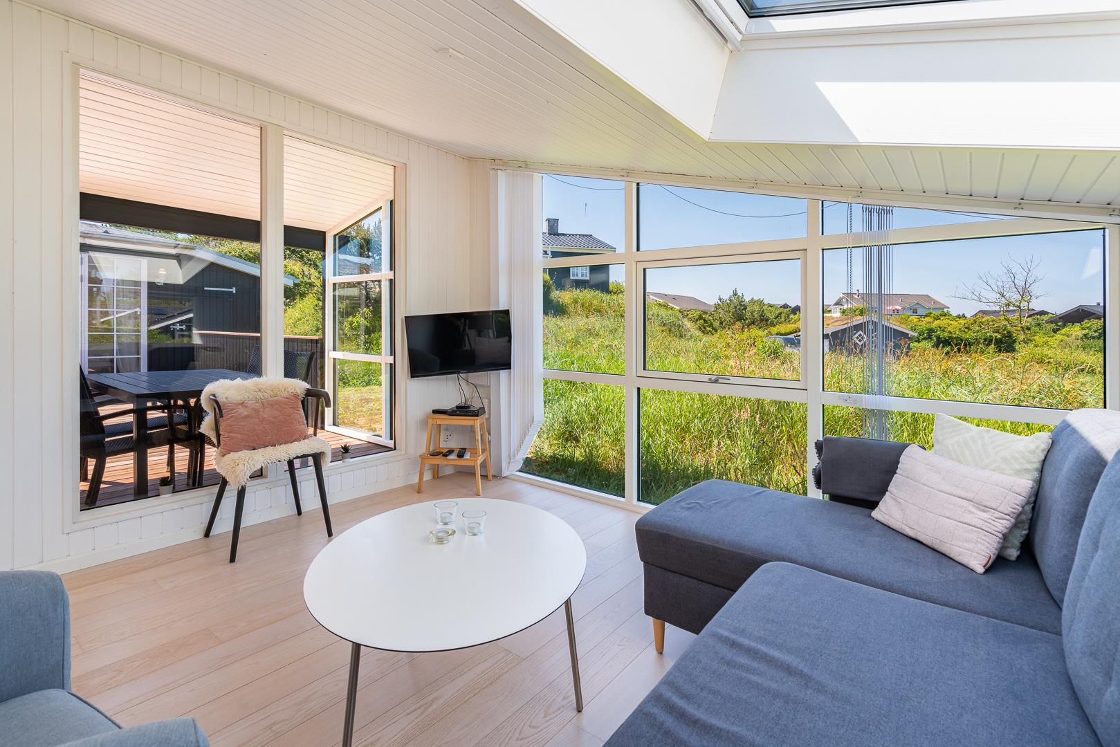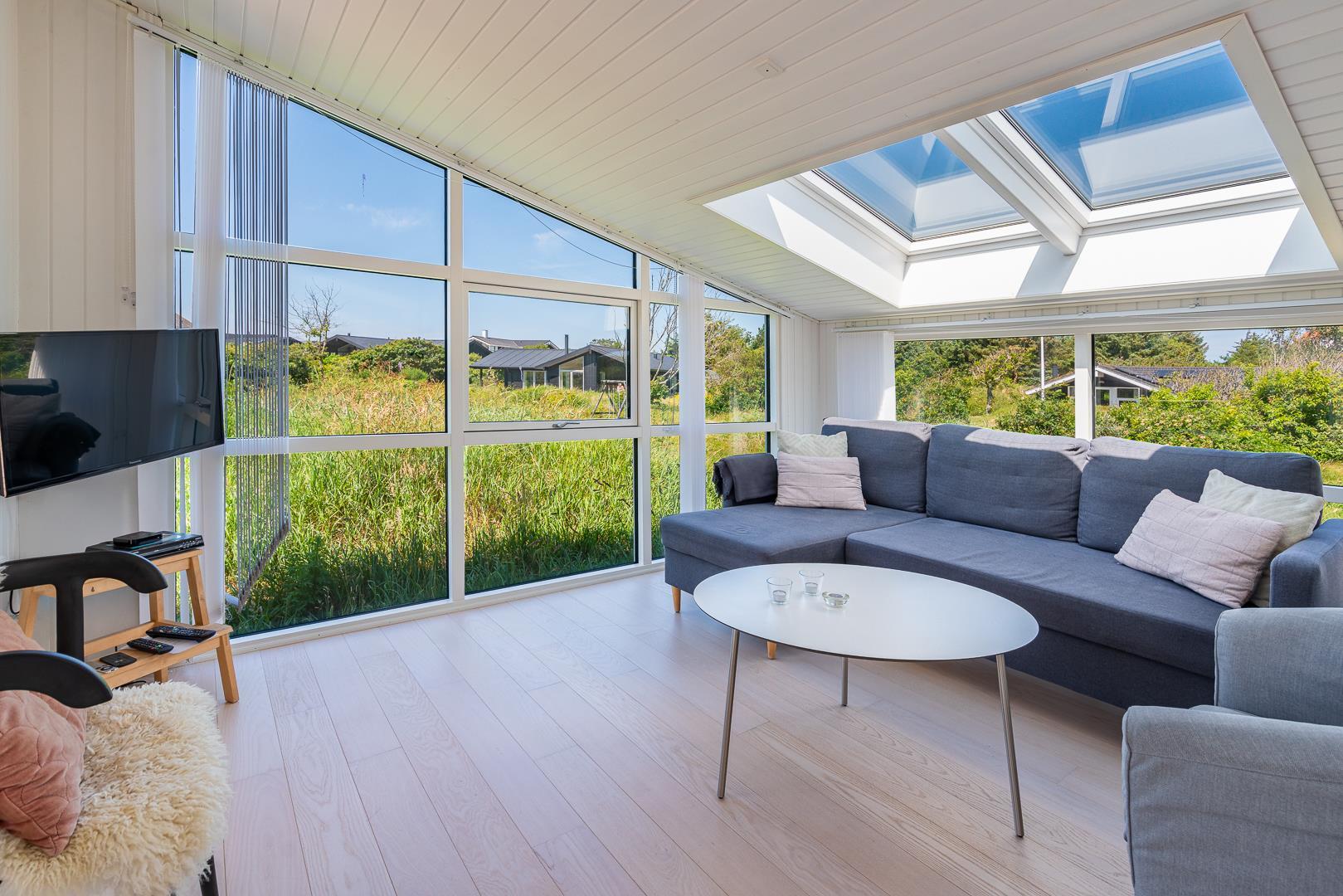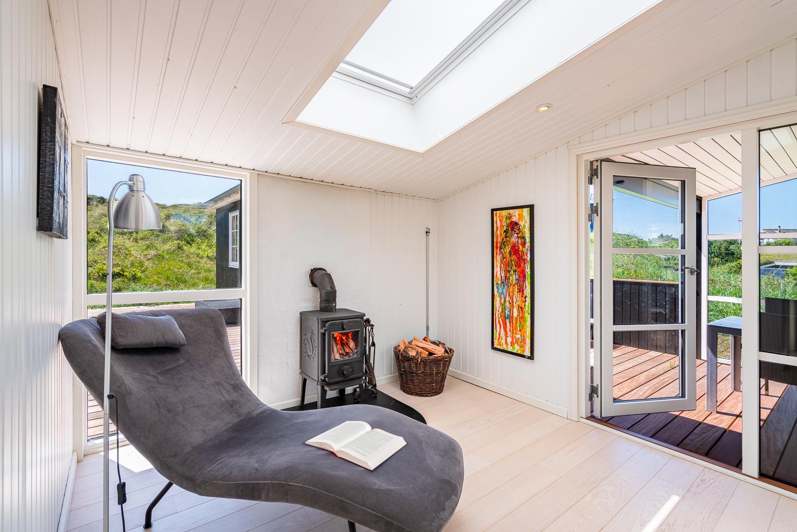 Stuen byder på hyggelig stemning med brændeovn og store panoramavinduer, hvor du kan nyde udsigten til klitterne og slappe helt af efter en frisk gåtur på stranden.