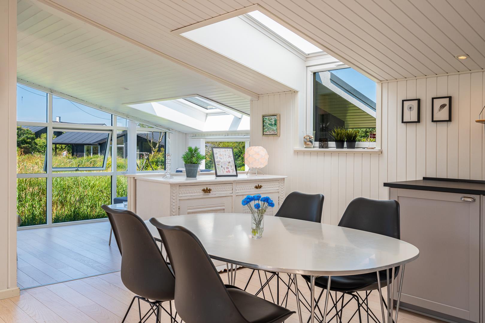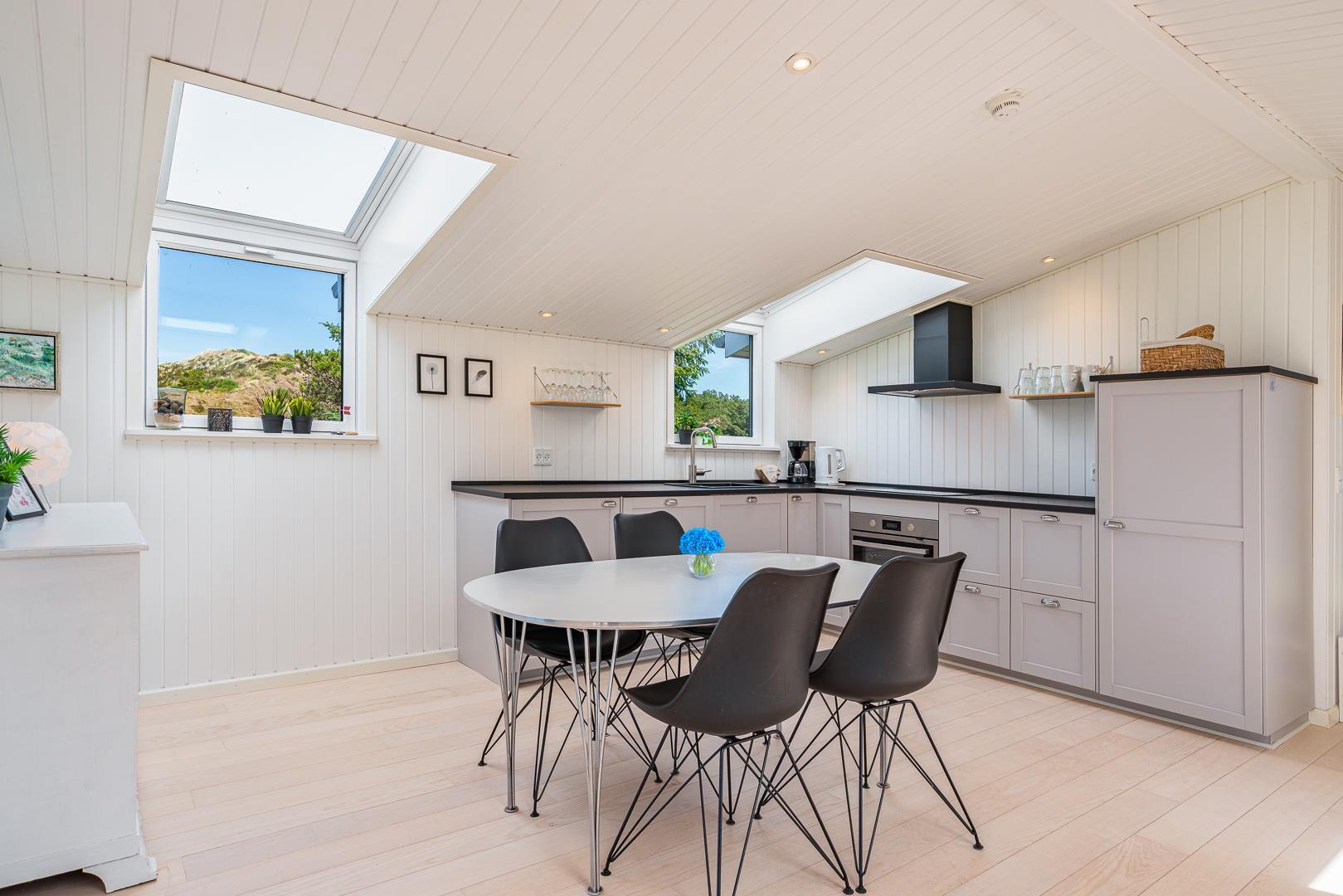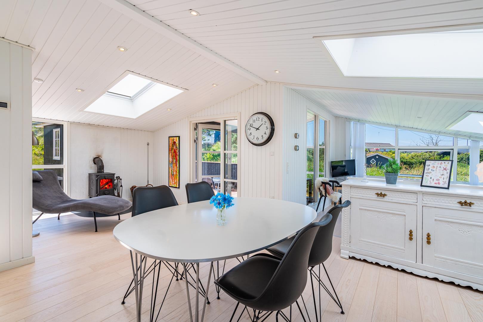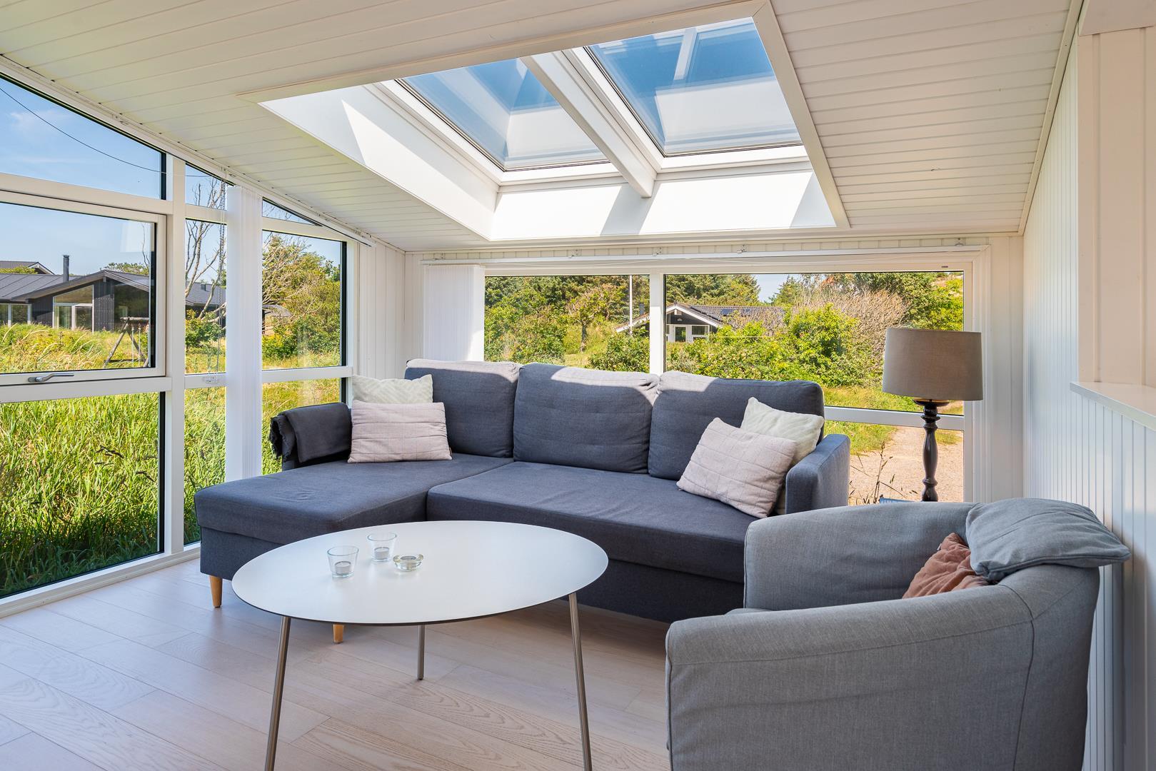 Stuen byder på hyggelig stemning med brændeovn og store panoramavinduer, hvor du kan nyde udsigten til klitterne og slappe helt af efter en frisk gåtur på stranden.