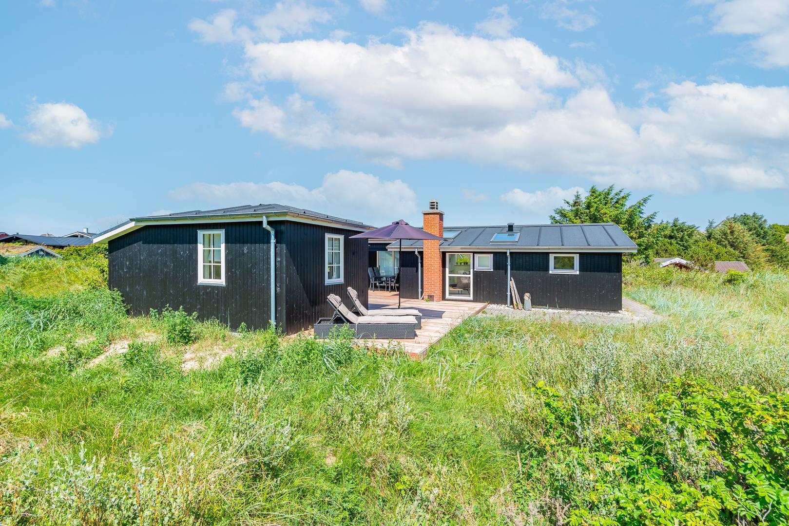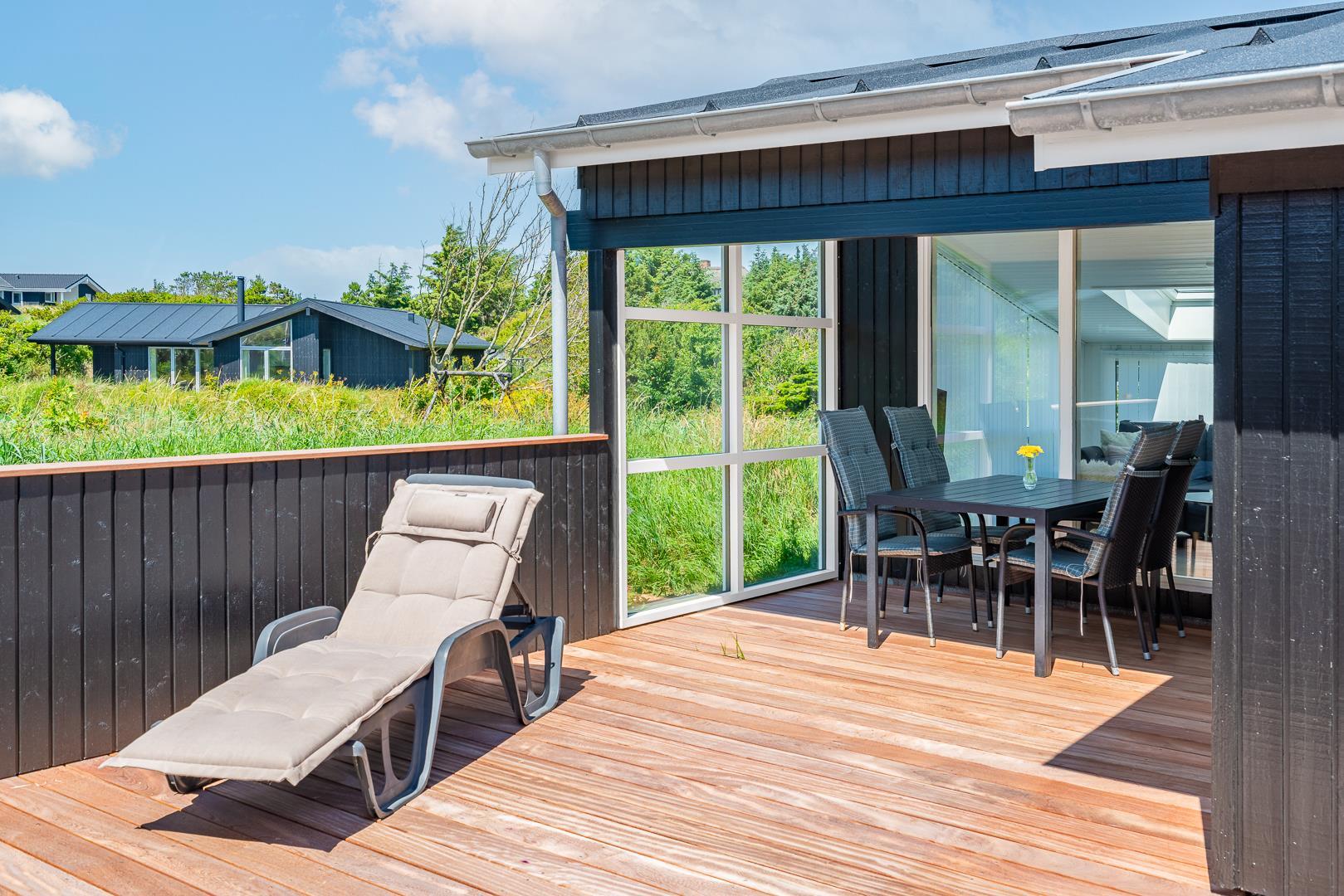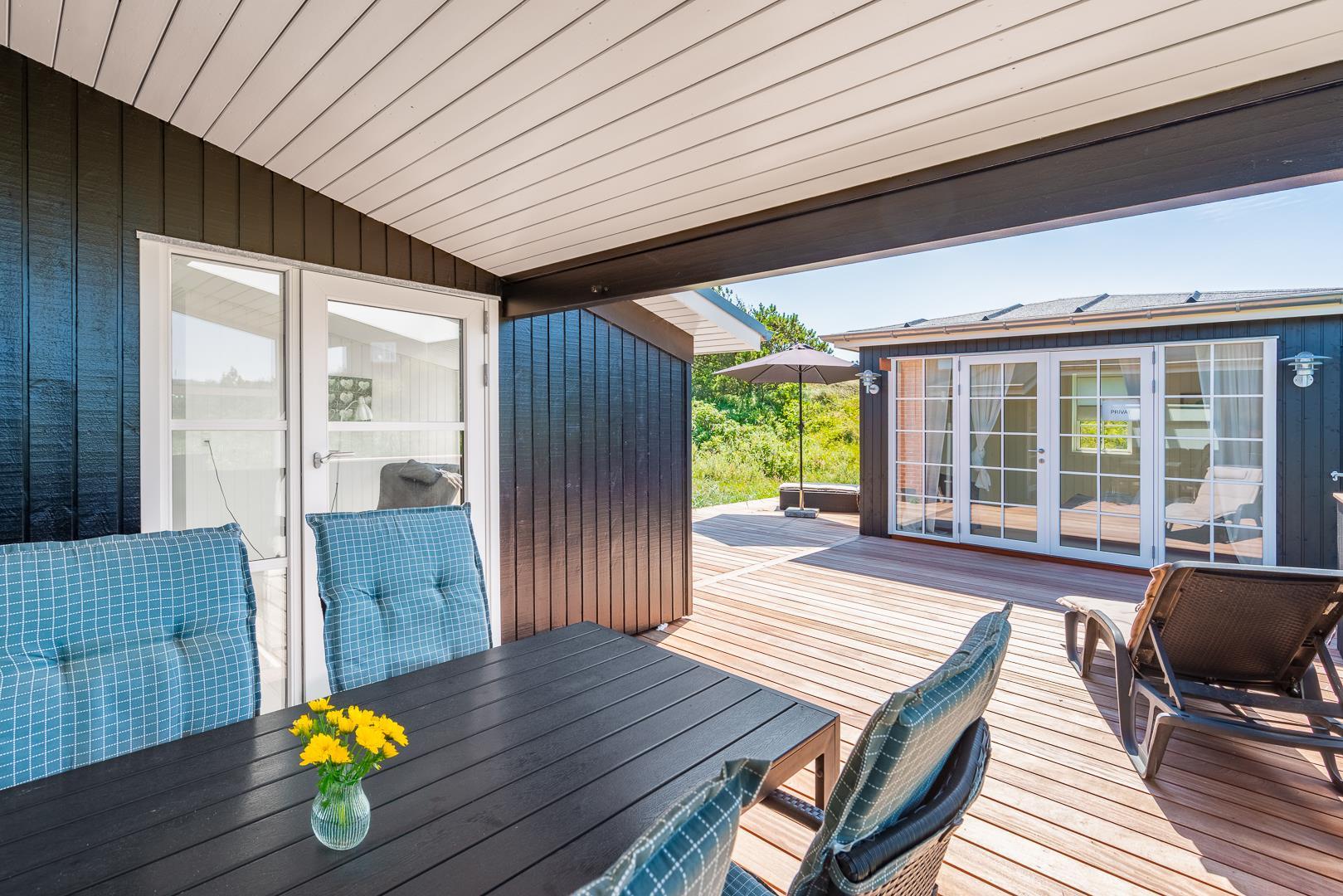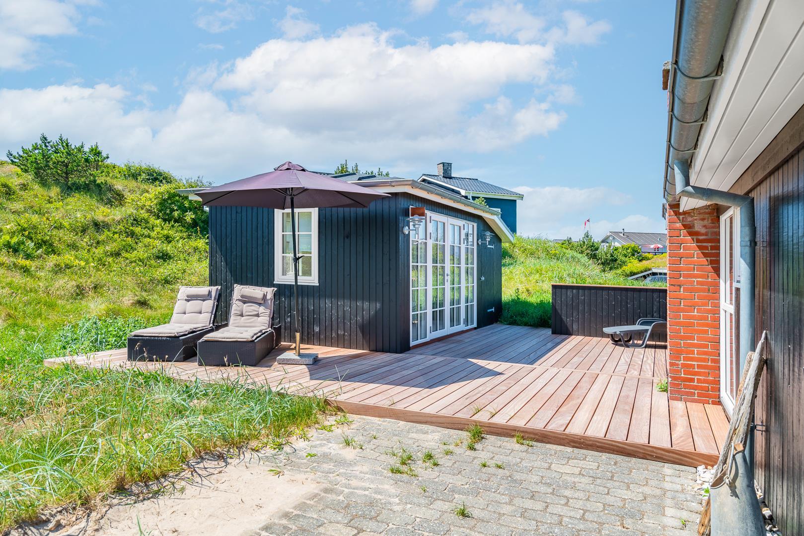 Den delvist overdækkede terrasse er perfekt til hyggelige stunder udendørs – både til morgenkaffen i solen og til middage med udsigt over klitlandskabet. Haven er rummelig og børnevenlig, så der er god plads til leg og afslapning.
