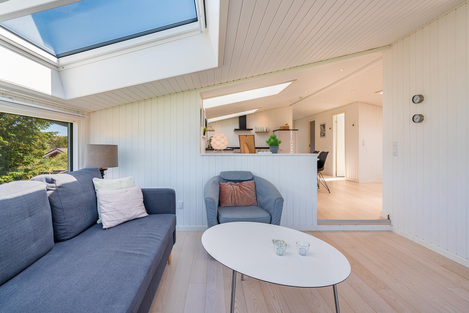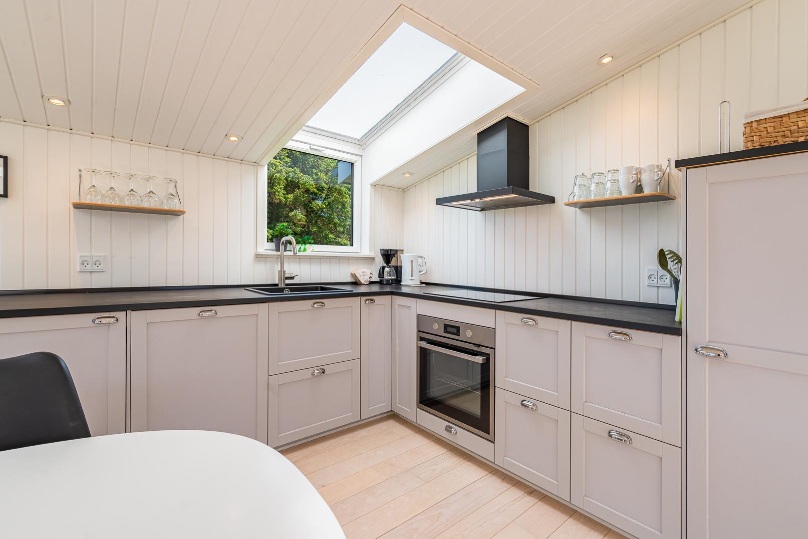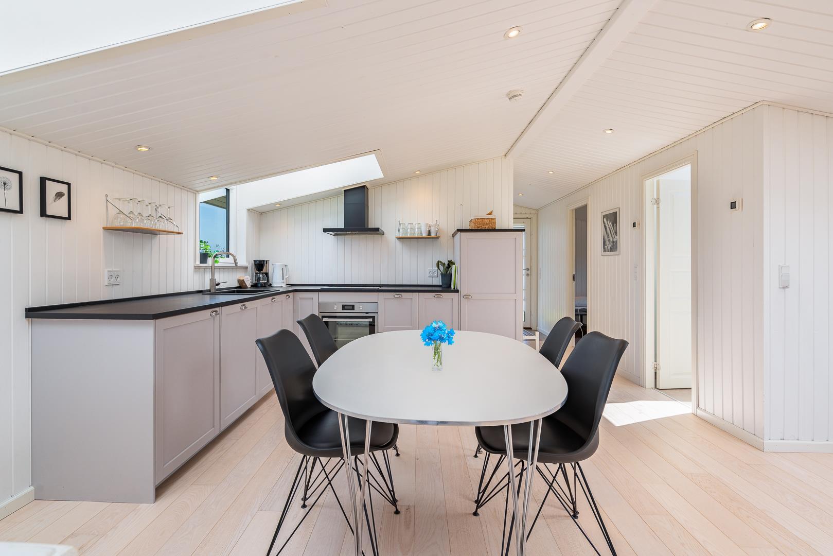 Det åbne køkken er en naturlig del af opholdsrummet og har opvaskemaskine, så I kan bruge tiden på hygge frem for opvask.