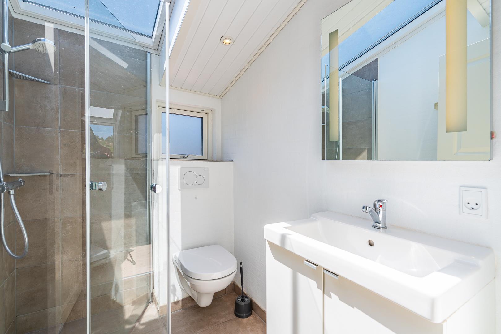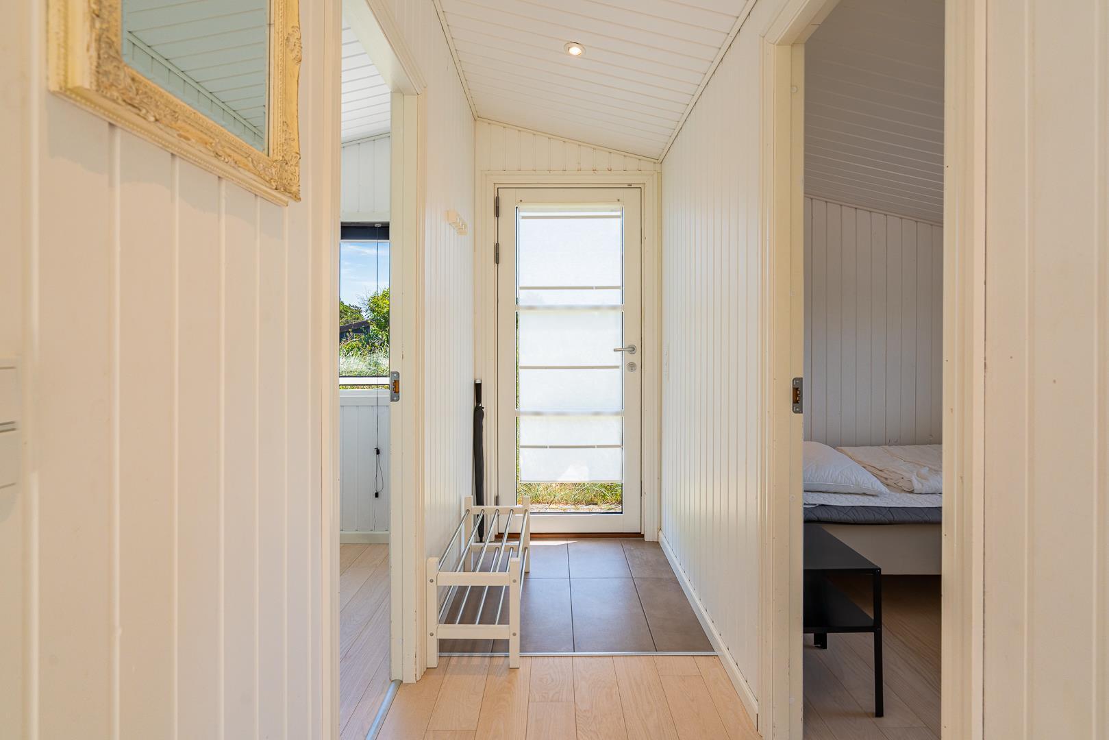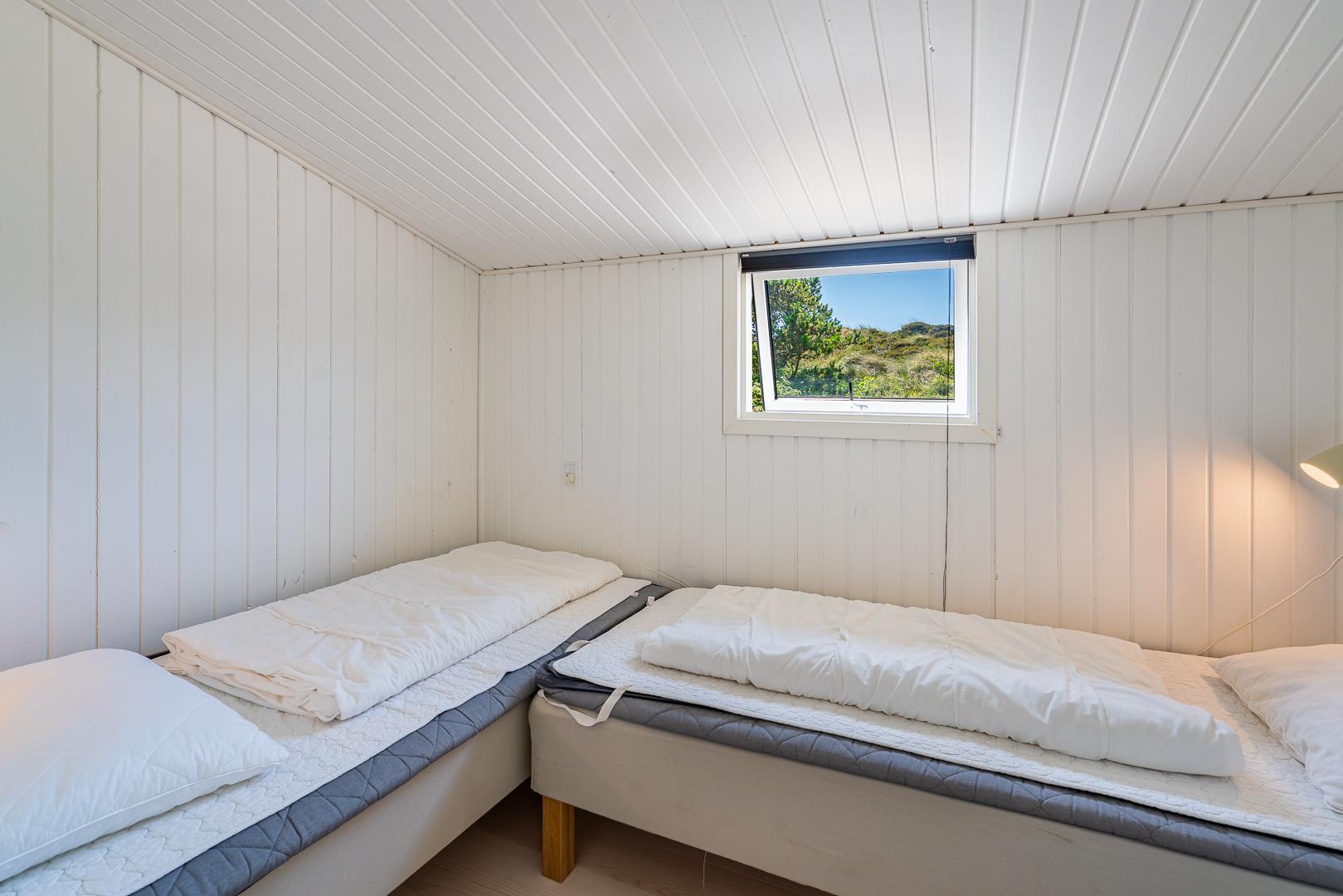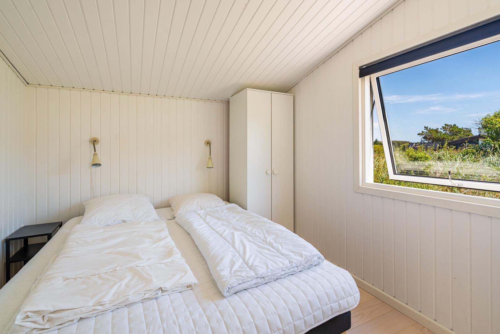 Sommerhuset har to soveværelser – et med dobbeltseng og et med to enkeltsenge. Gulvvarme i både soveværelser, køkken og badeværelse sikrer en behagelig temperatur året rundt. Badeværelset er lyst og funktionelt indrettet.