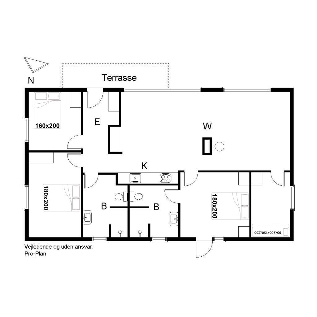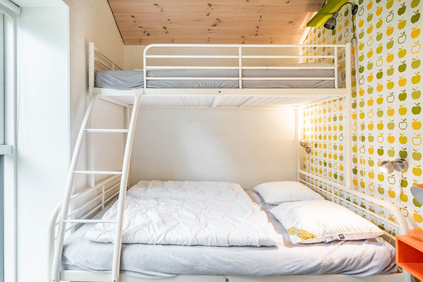Sengestørrelser: 2 dobbeltsenge 180 x 200 cm + 1 dobbeltseng 160 x 200 cm + 1 køjeseng, hvor underkøjen er 150 x 200 cm og overkøjen er 90 x 200 cm.