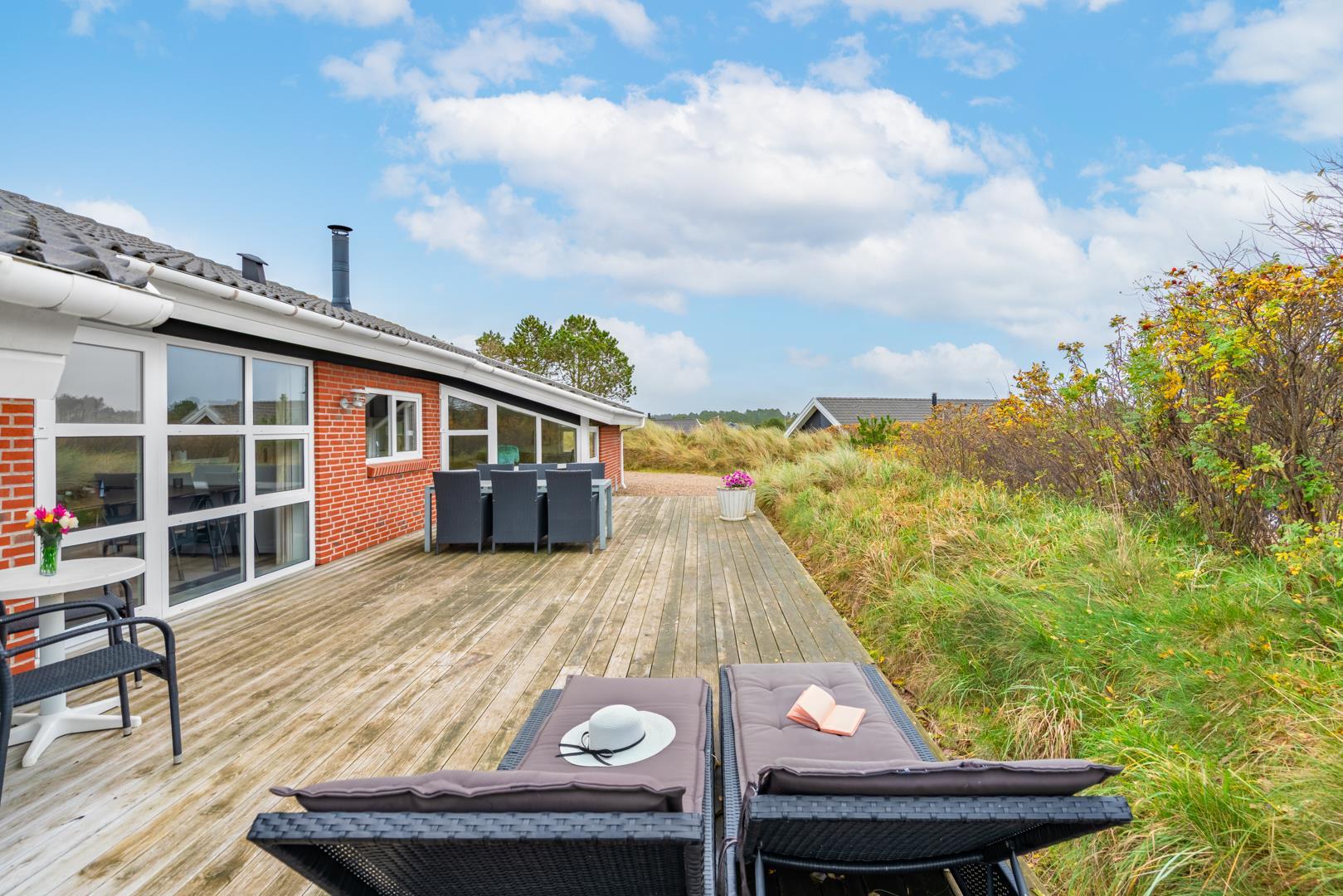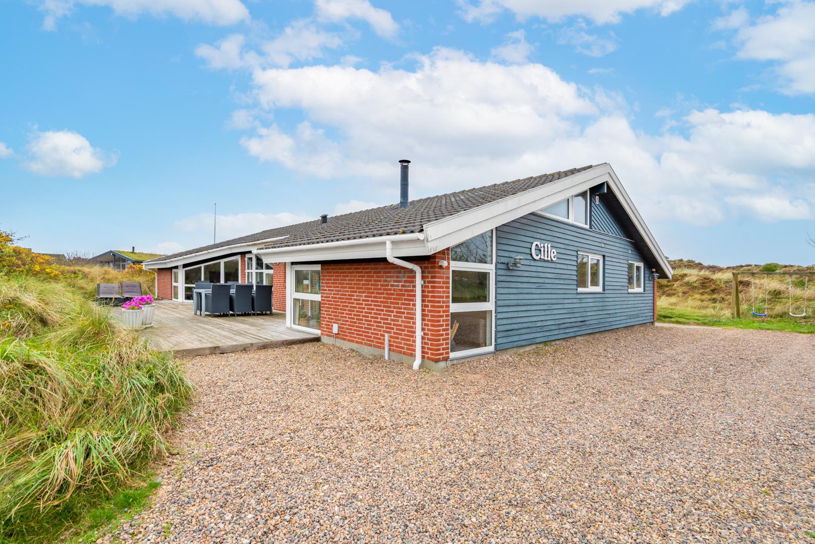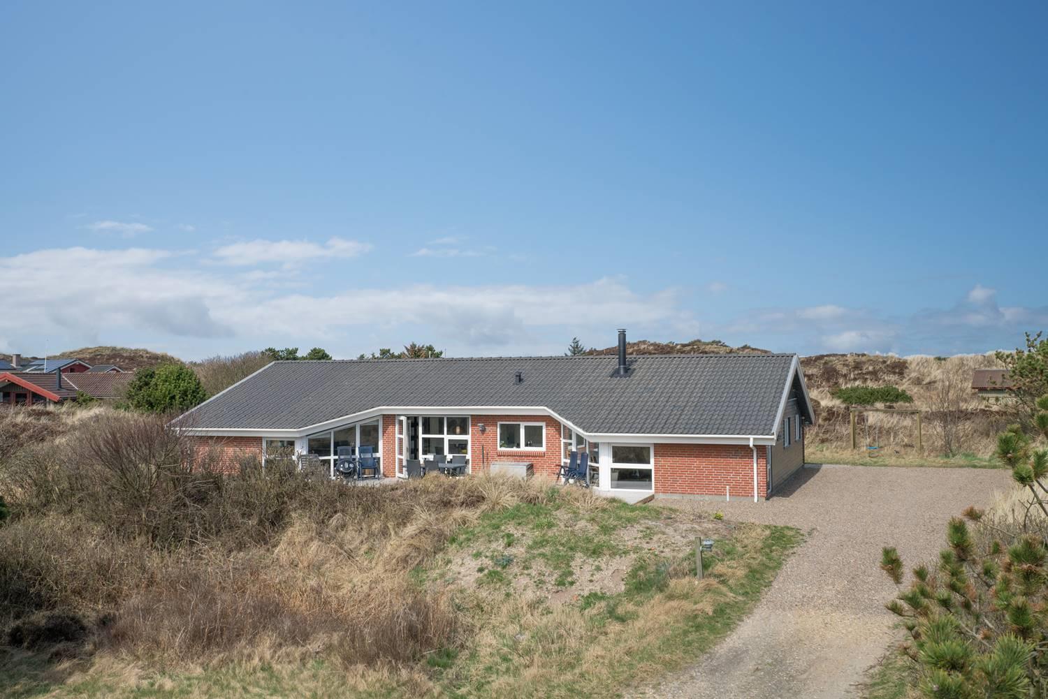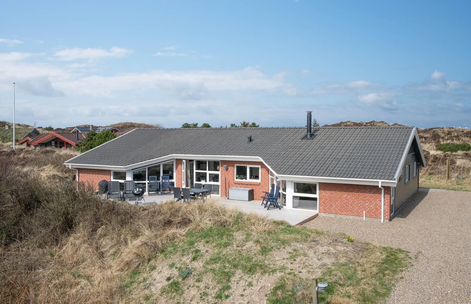 På en klitgrund og for enden af blind vej ligger dette pragtfulde feriehus. Fremhæves kan først og fremmest aktivitetsrum med, pool bord, bordtennis og bordfodbold. Lækkert nyt køkken som er i åben forbindelse med den flot indrettede stue. Huset fremstår overalt lyst, lækkert og stilfuldt indrettet. 4 lyse soverum, samt hems. 2 flotte badeværelser med bruser, i det ene finder I husets spa og sauna. Ugeneret træterrasse. Et super lækkert feriehus hvor rammerne er skabt for en god ferie ved Henne Strand.