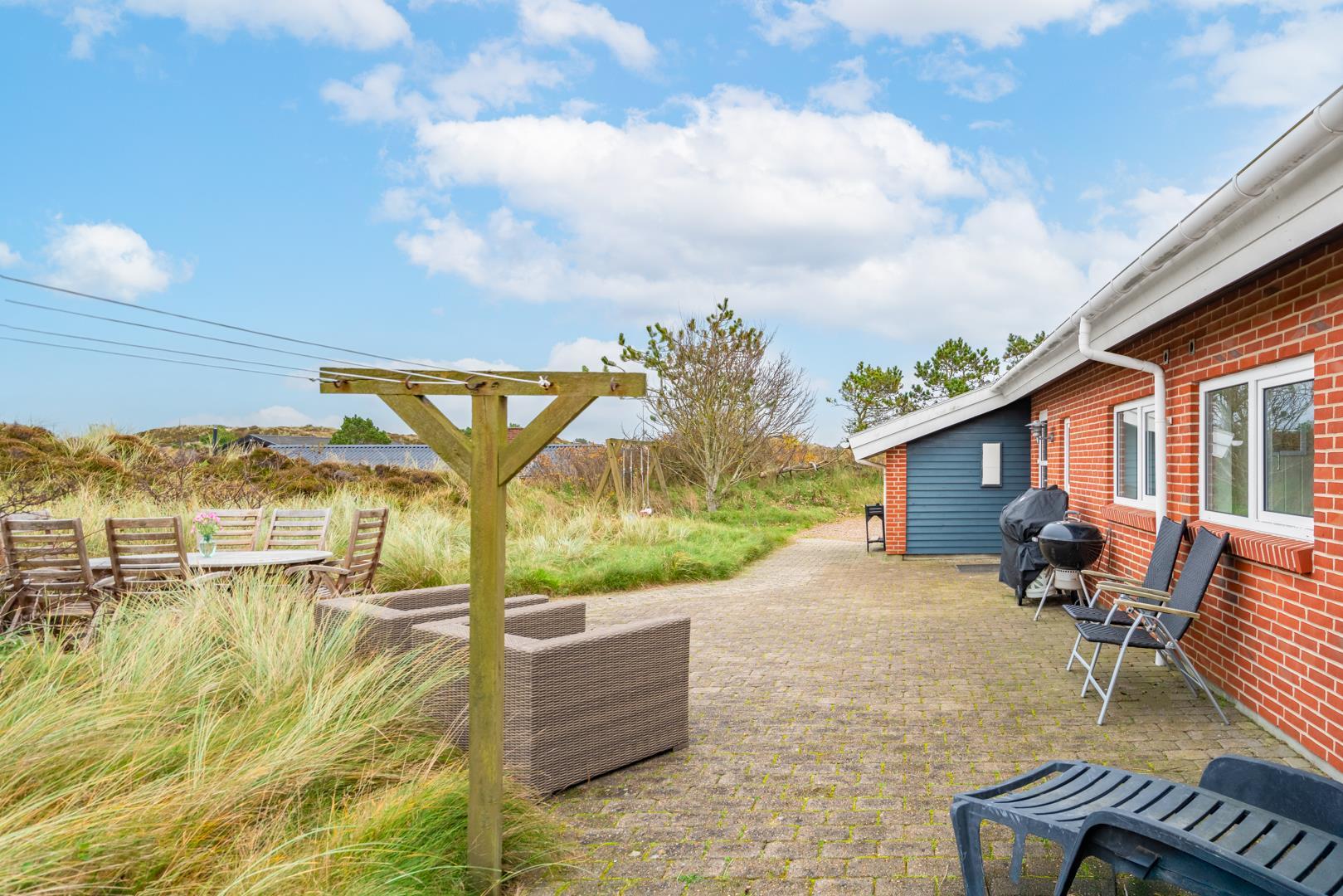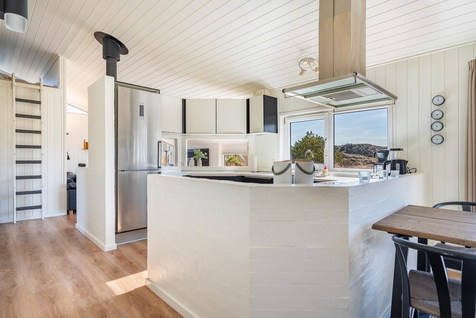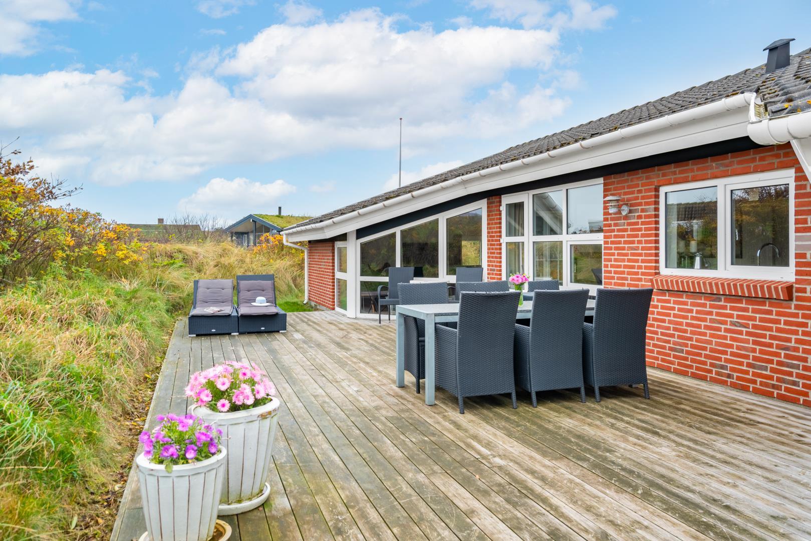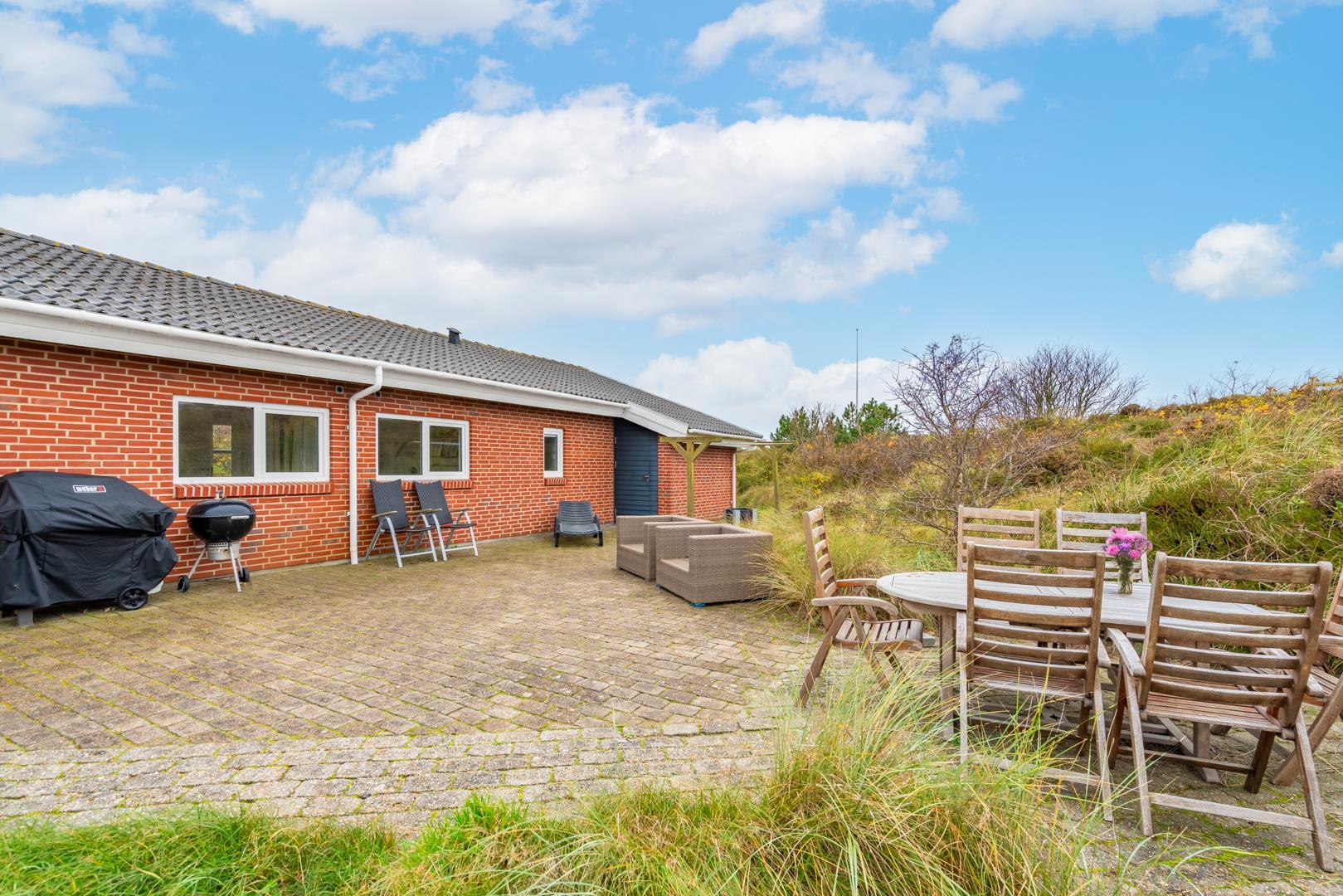 På en klitgrund og for enden af blind vej ligger dette pragtfulde feriehus. Fremhæves kan først og fremmest aktivitetsrum med, pool bord, bordtennis og bordfodbold. Lækkert nyt køkken som er i åben forbindelse med den flot indrettede stue. Huset fremstår overalt lyst, lækkert og stilfuldt indrettet. 4 lyse soverum, samt hems. 2 flotte badeværelser med bruser, i det ene finder I husets spa og sauna. Ugeneret træterrasse. Et super lækkert feriehus hvor rammerne er skabt for en god ferie ved Henne Strand.