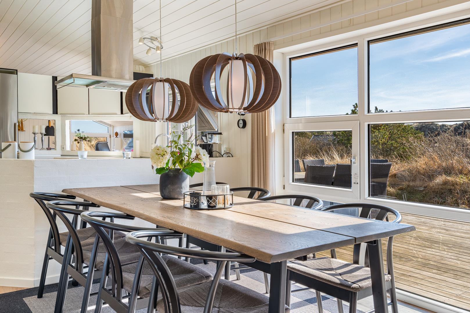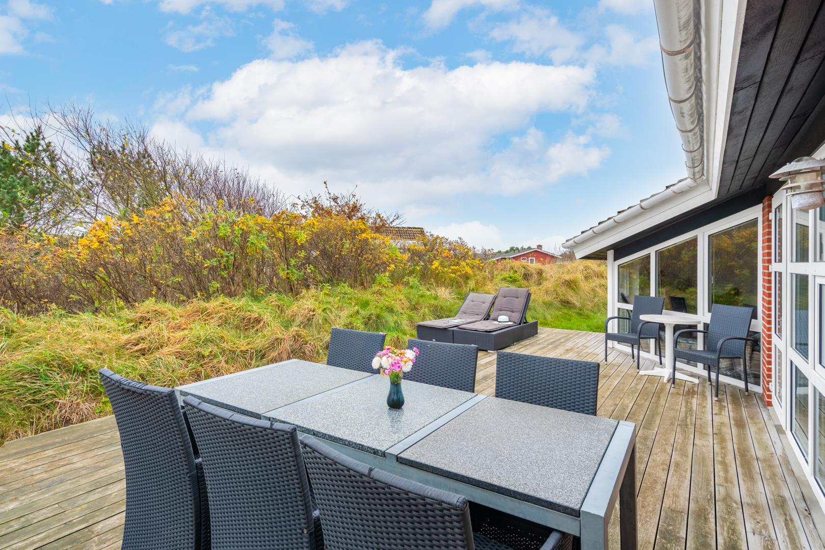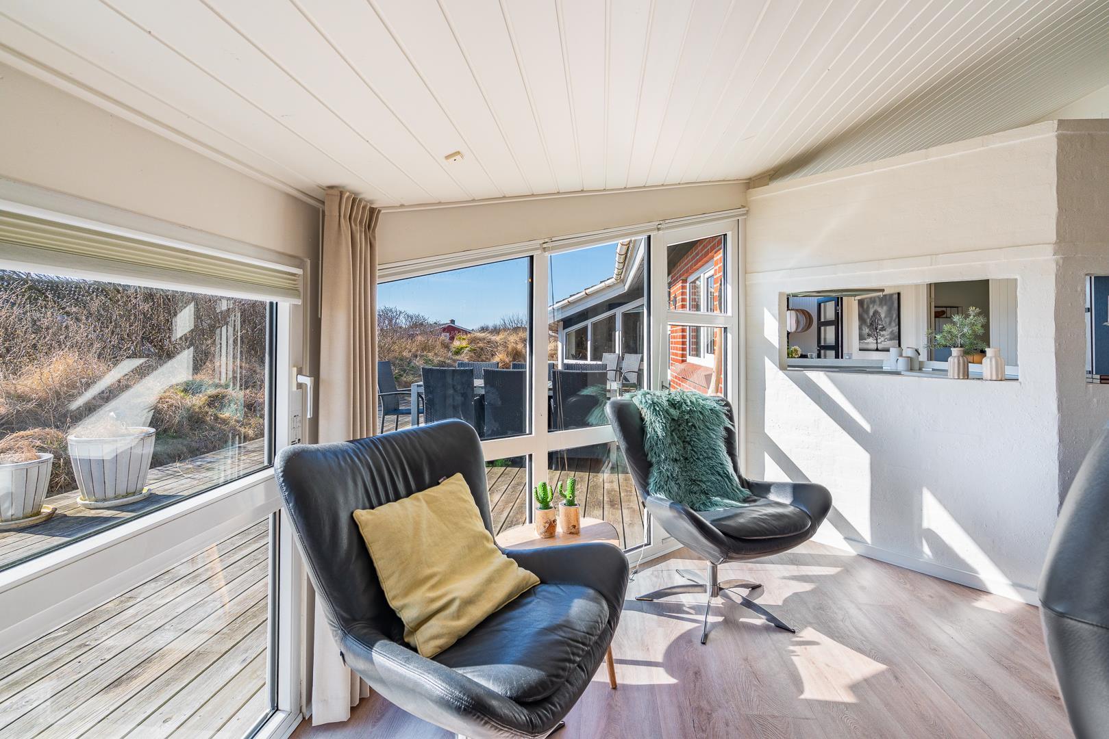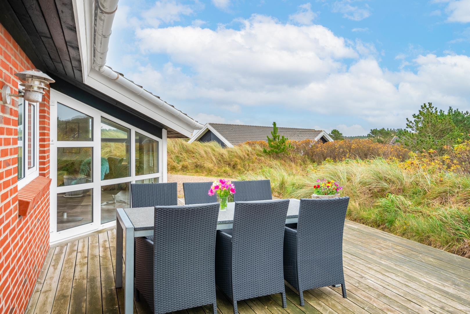 På en klitgrund og for enden af blind vej ligger dette pragtfulde feriehus. Fremhæves kan først og fremmest aktivitetsrum med, pool bord, bordtennis og bordfodbold. Lækkert nyt køkken som er i åben forbindelse med den flot indrettede stue. Huset fremstår overalt lyst, lækkert og stilfuldt indrettet. 4 lyse soverum, samt hems. 2 flotte badeværelser med bruser, i det ene finder I husets spa og sauna. Ugeneret træterrasse. Et super lækkert feriehus hvor rammerne er skabt for en god ferie ved Henne Strand.