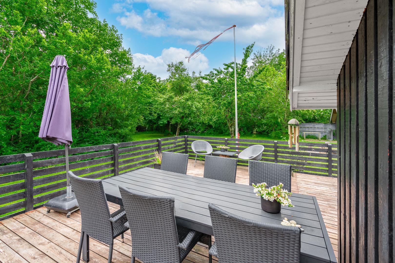 Indvendigt mødes du af lyse rum med hvide vægge og lyse gulve, hvor køkkenet smelter sammen med en hyggelig stue med brændeovn i en åben planløsning. Herfra er der udgang til den dejlige terrasse, som er indhegnet med et charmerende stakit, der giver ekstra privatliv og sikkerhed.