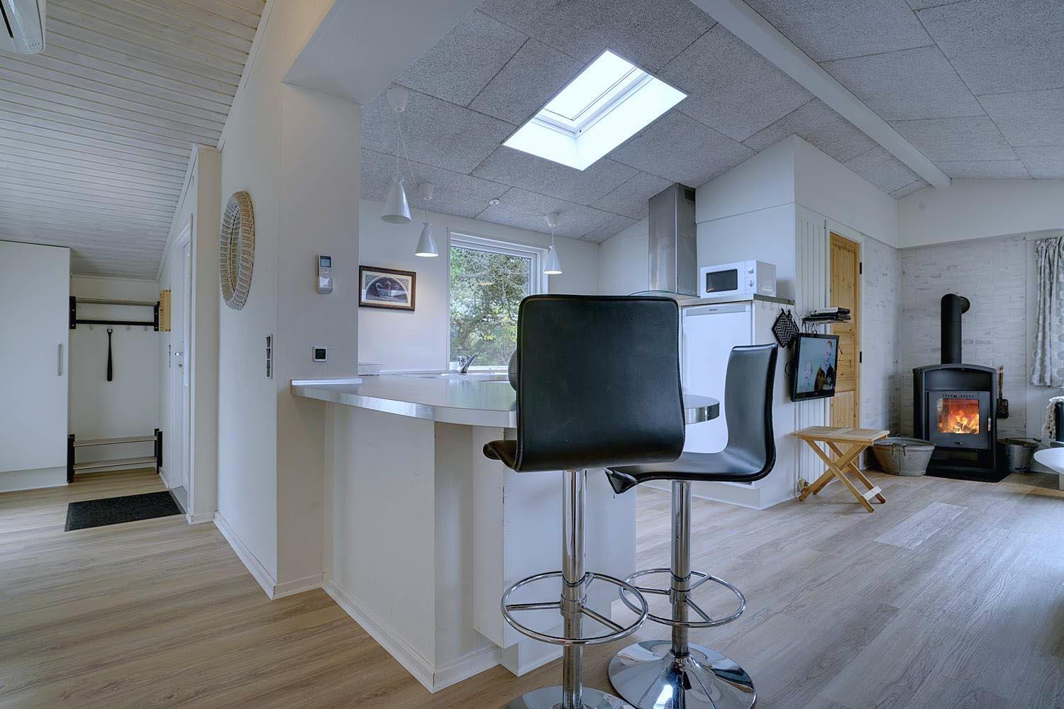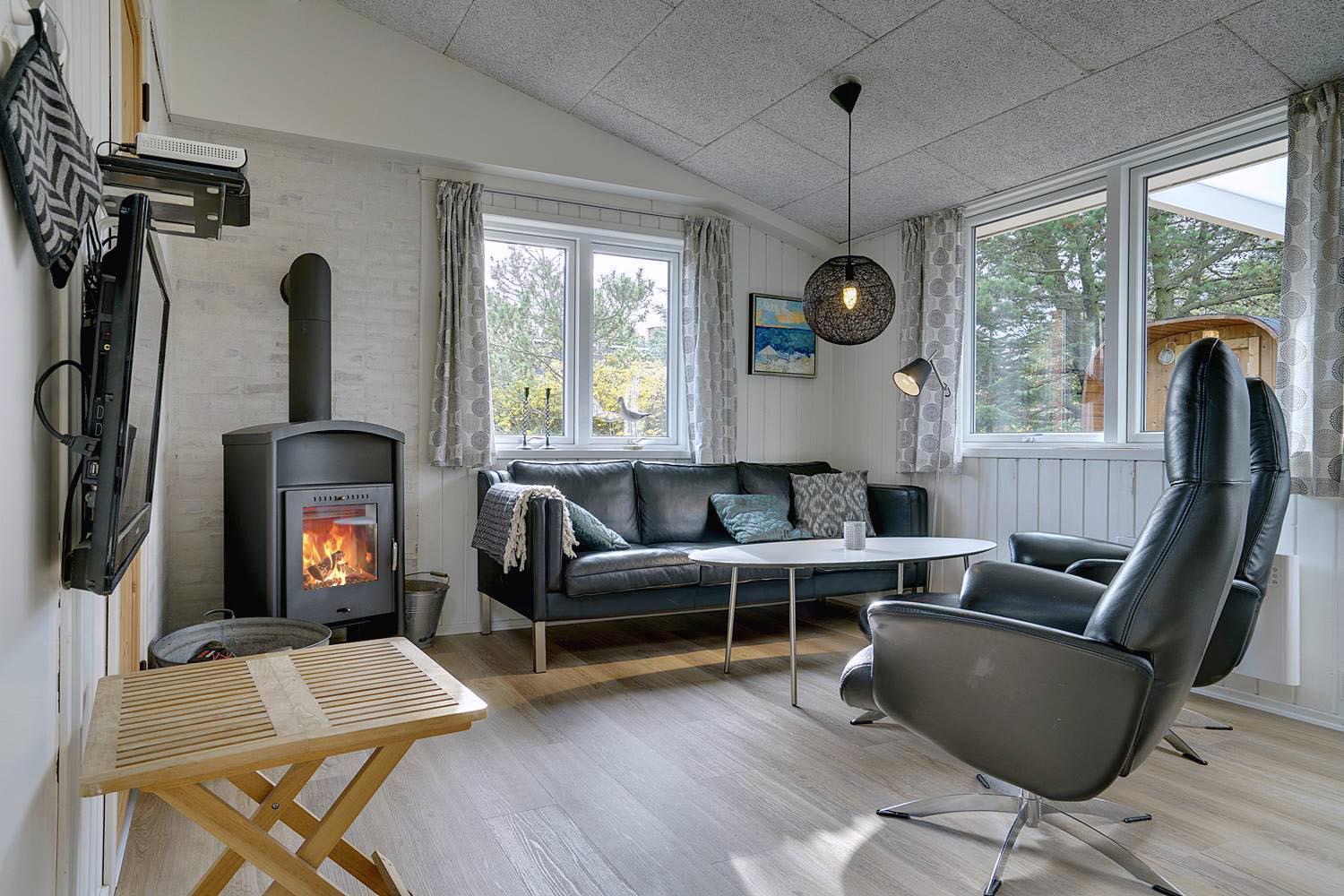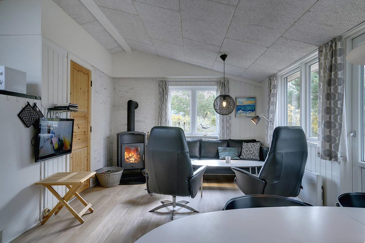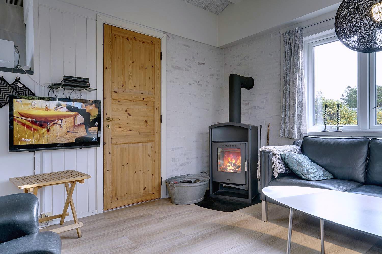 Inde i det blåmalede hus breder brændeovnens hyggelige varme sig i opholdsstuen. Her går lofterne helt til kip, og de er beklædt med lyddæmpende Troldtekt-plader, som sørger for at begejstrede barnestemmer altid er behagelige at lytte til.