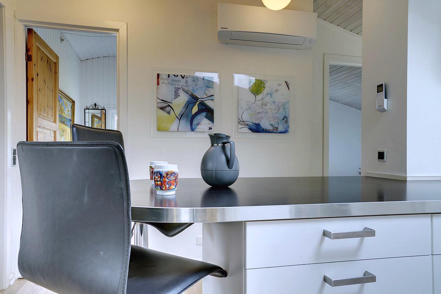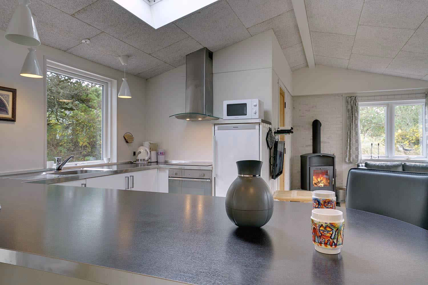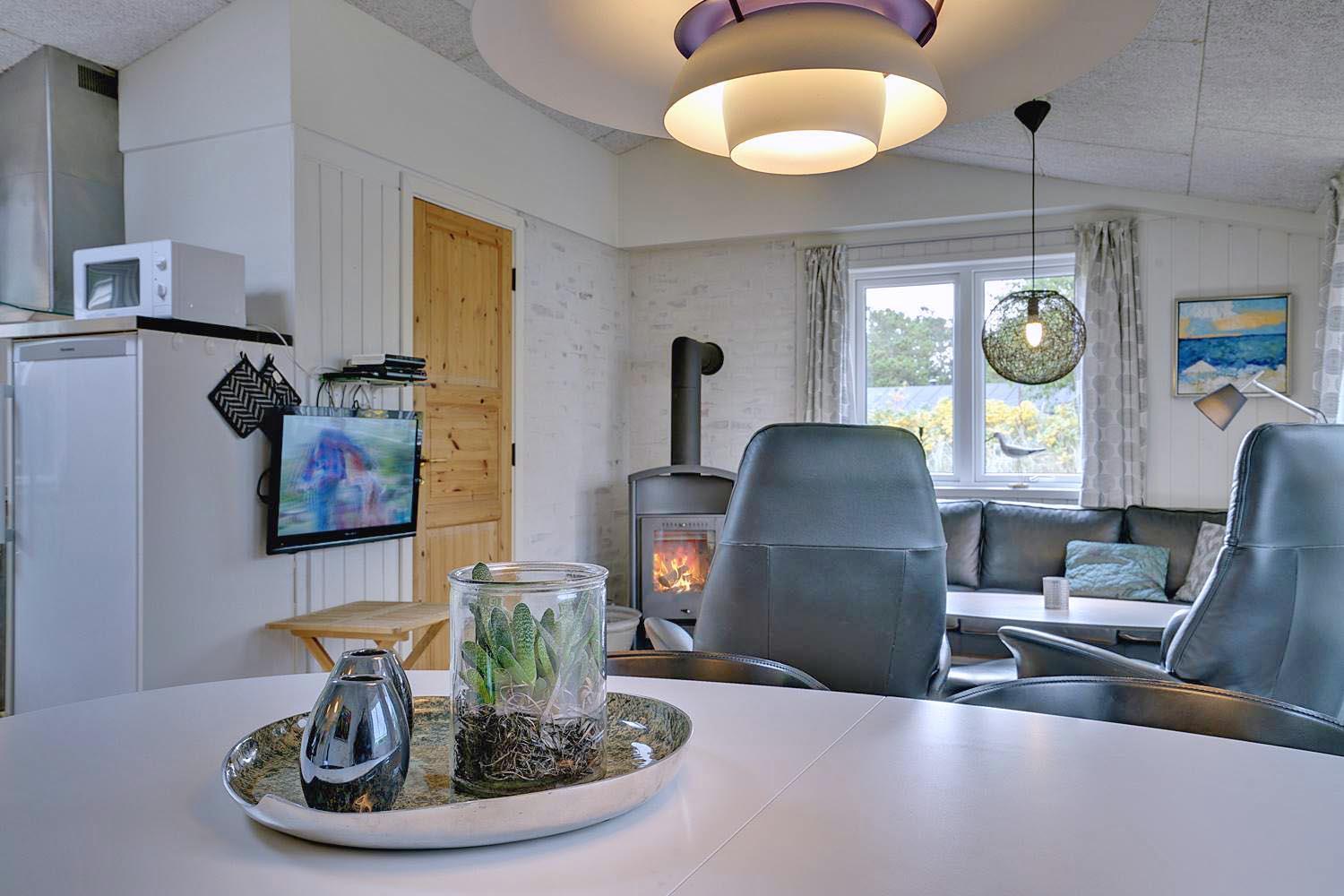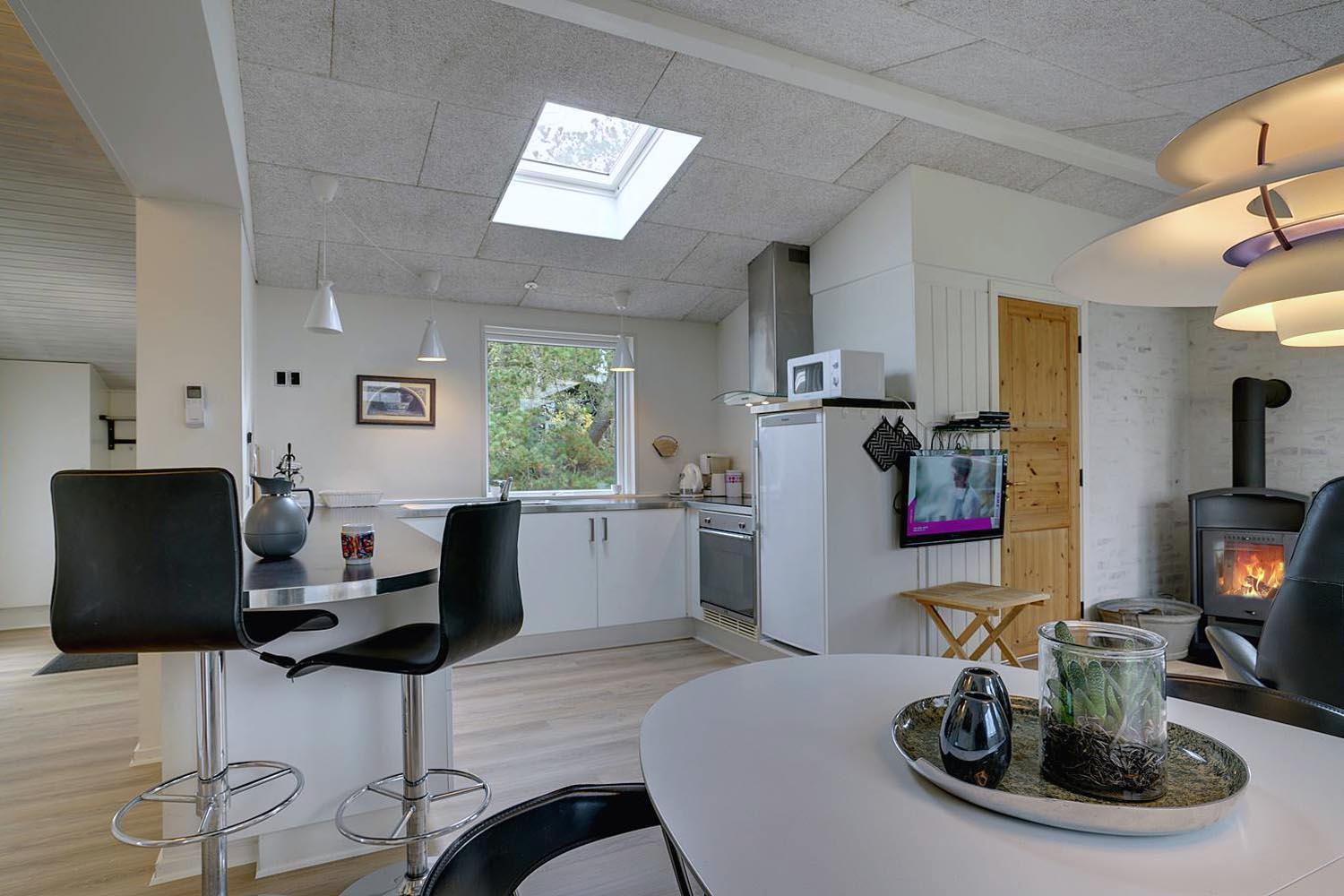 Inde i det blåmalede hus breder brændeovnens hyggelige varme sig i opholdsstuen. Her går lofterne helt til kip, og de er beklædt med lyddæmpende Troldtekt-plader, som sørger for at begejstrede barnestemmer altid er behagelige at lytte til.