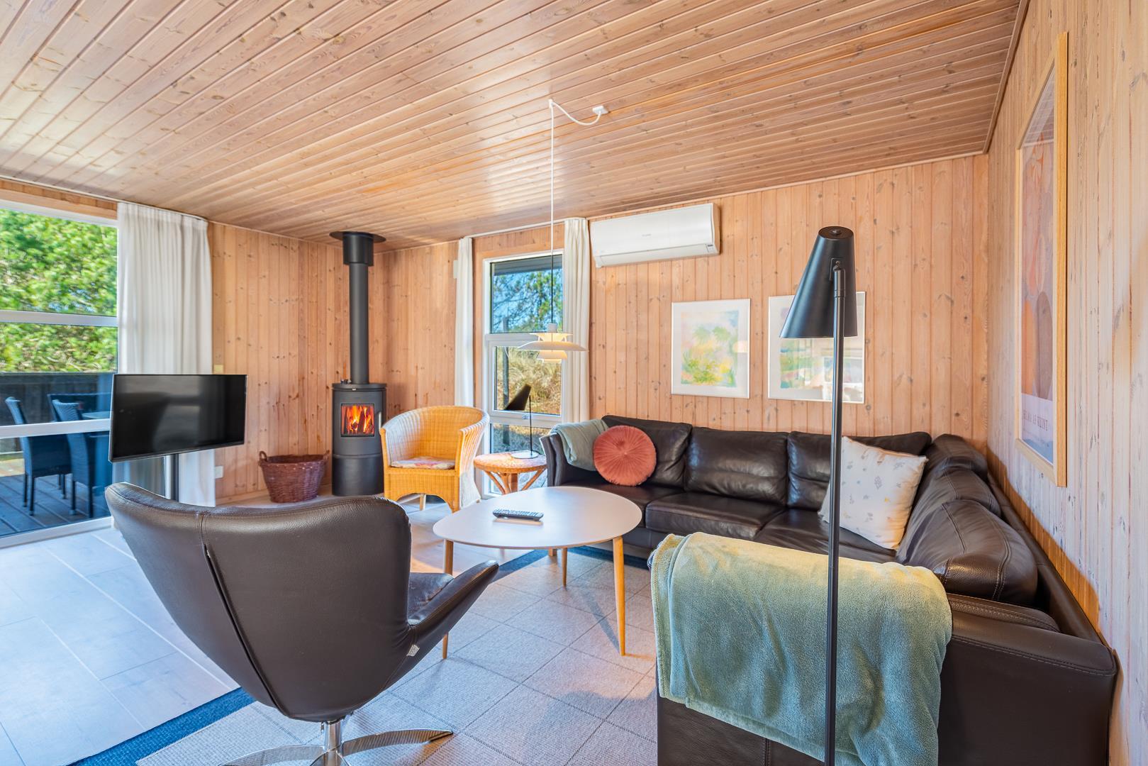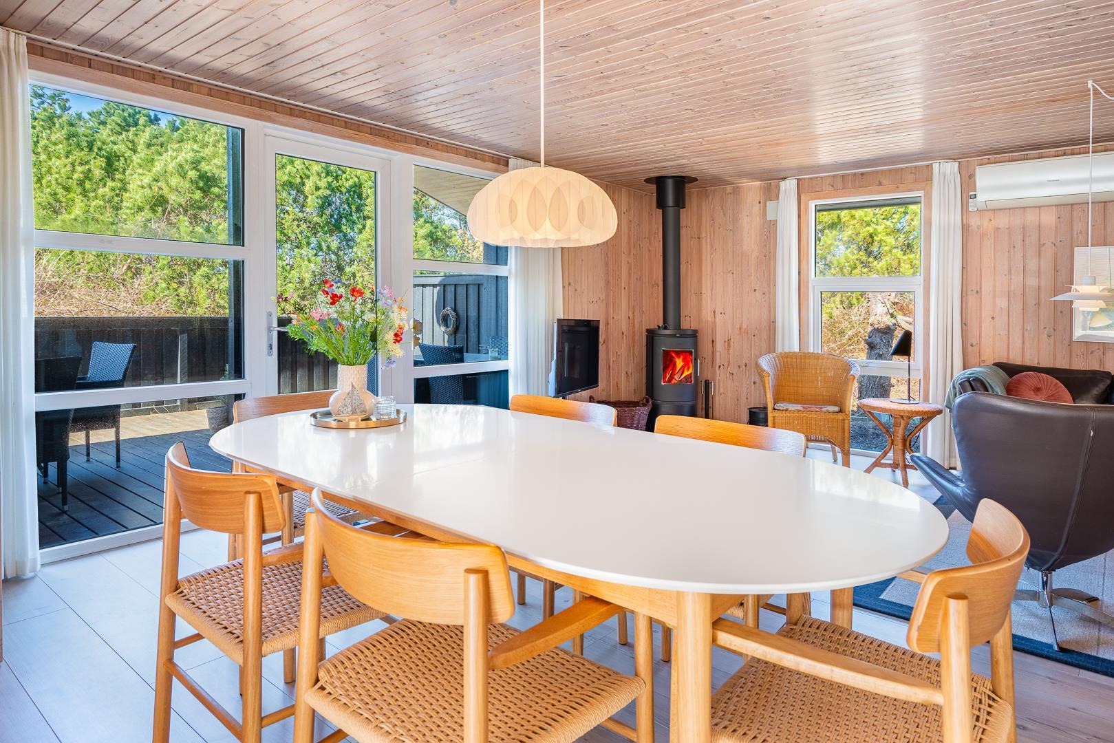 Dette sommerhus i Henne Strand danner de perfekte rammer om en afslappende ferie ved den danske vestkyst. Husets samlingspunkt er det lyse opholds- og spiseområde, hvor familien kan samles efter en dag i naturen. Tænd op i brændeovnen og nyd den hyggelige stemning, mens vinden blæser over klitterne udenfor. En energivenlig varmepumpe sørger samtidig for et behageligt indeklima hele året.