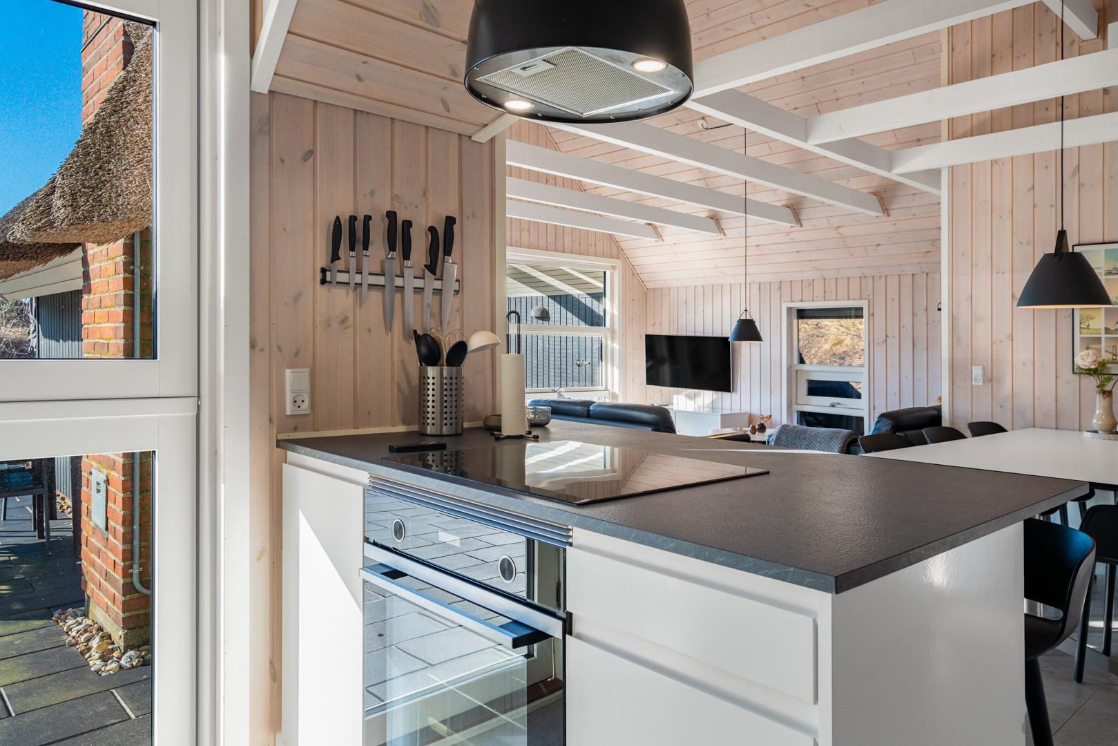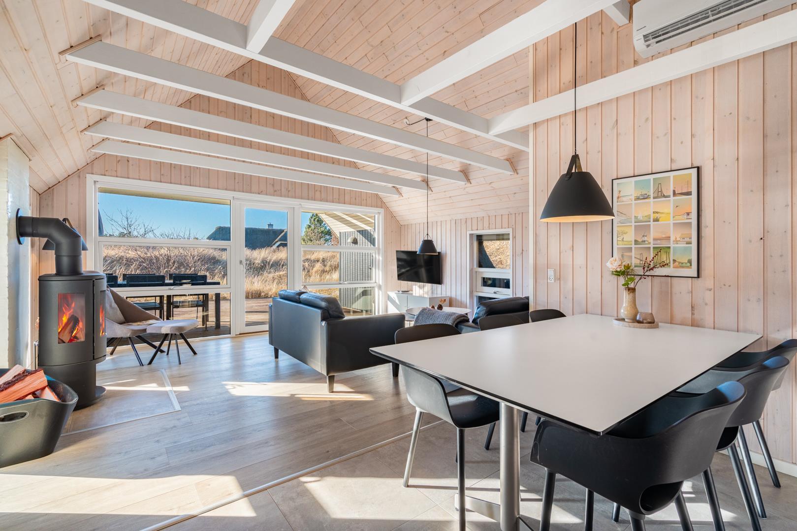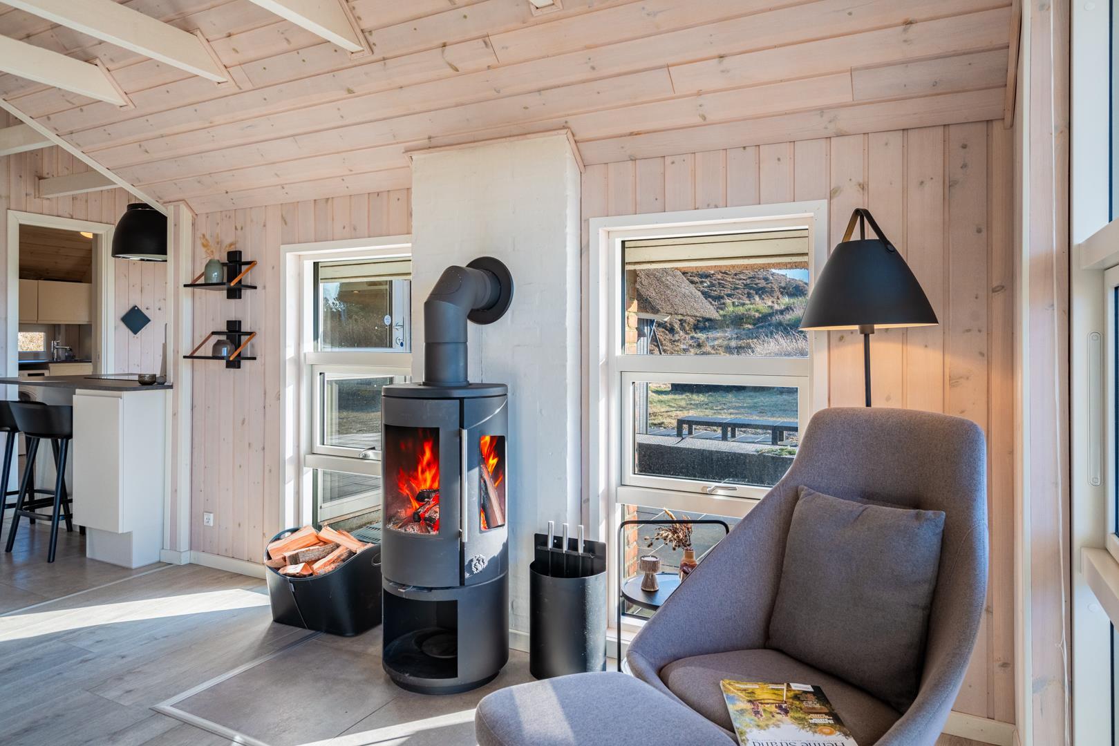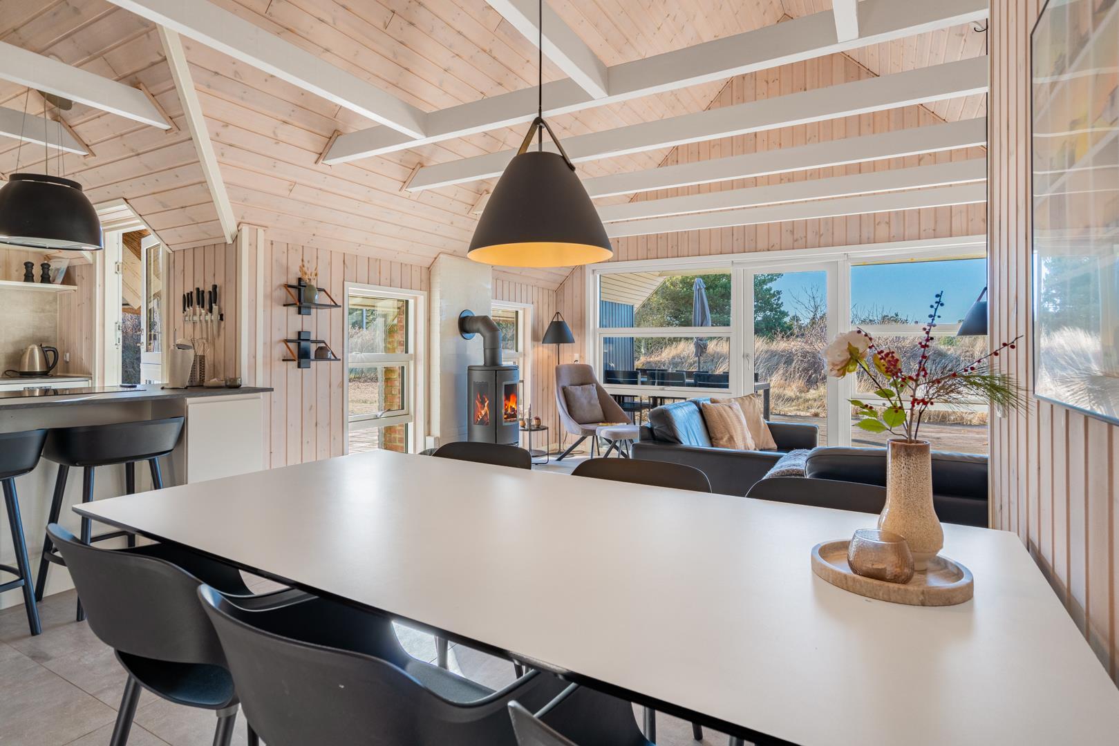Den lyse opholdsstue er husets hjerte og indbyder til hyggelige aftener med ild i brændeovn og udsigt til de omkringliggende klitter. Det åbne køkken er veludstyret og ideelt til fælles madlavning og hyggelige måltider.