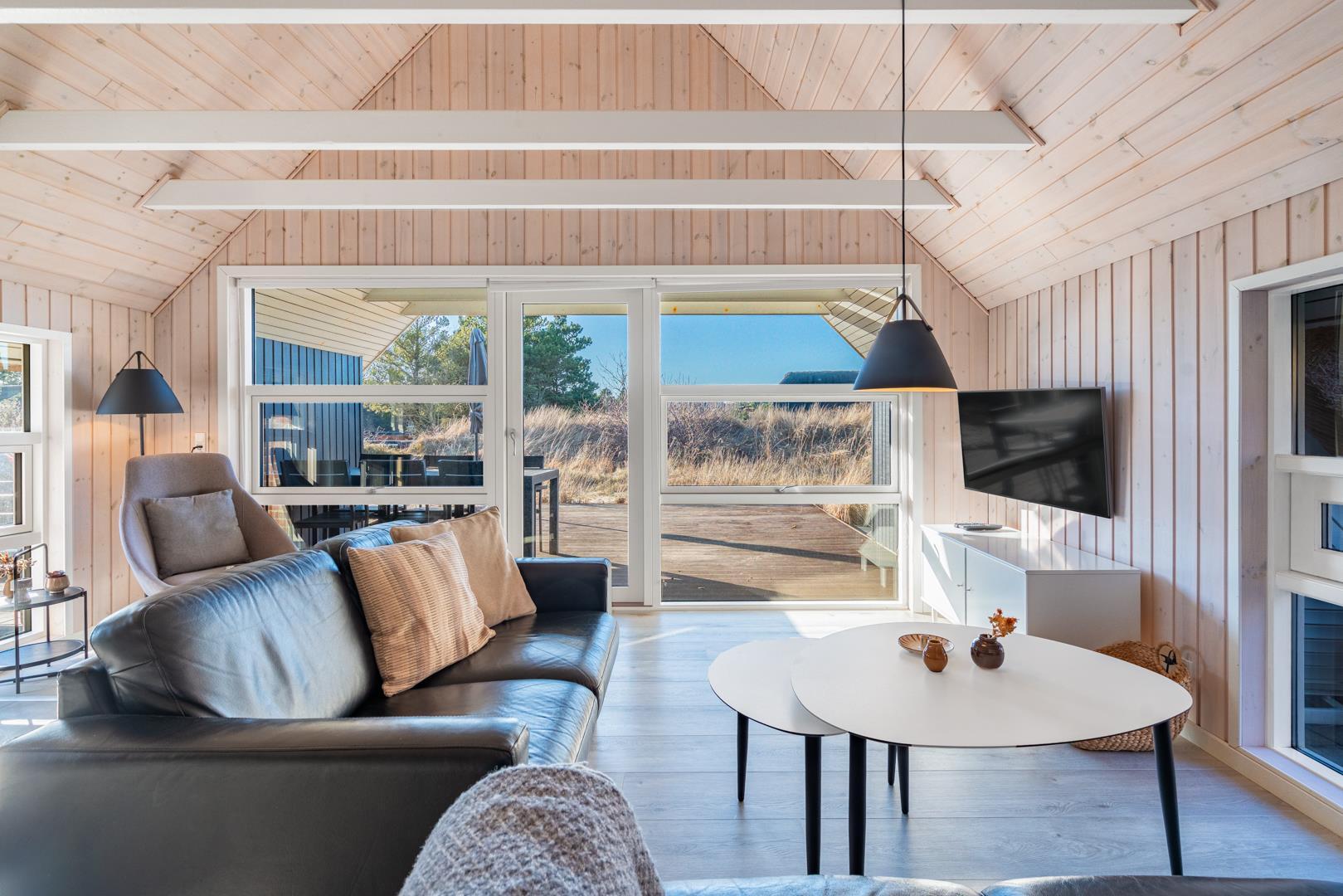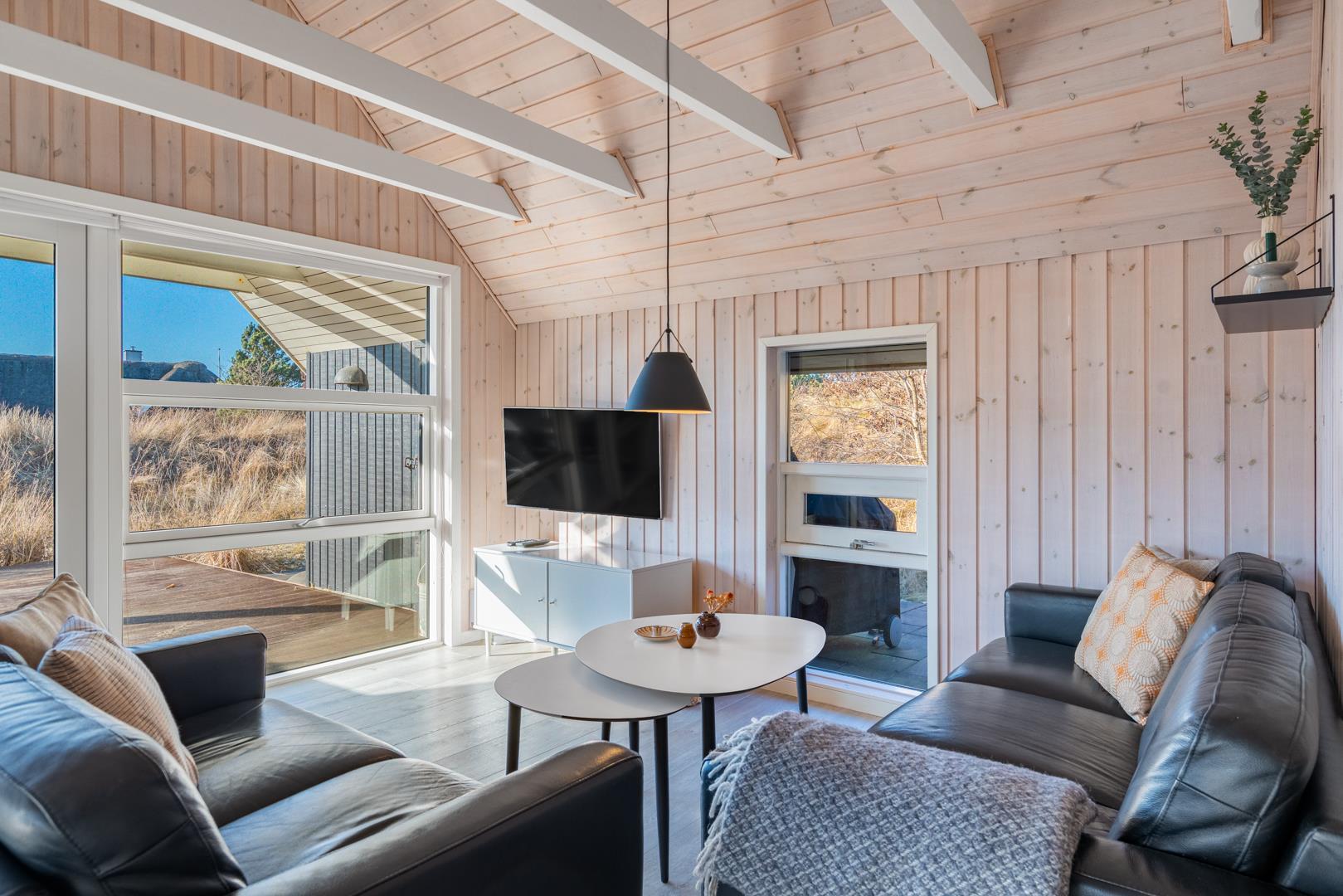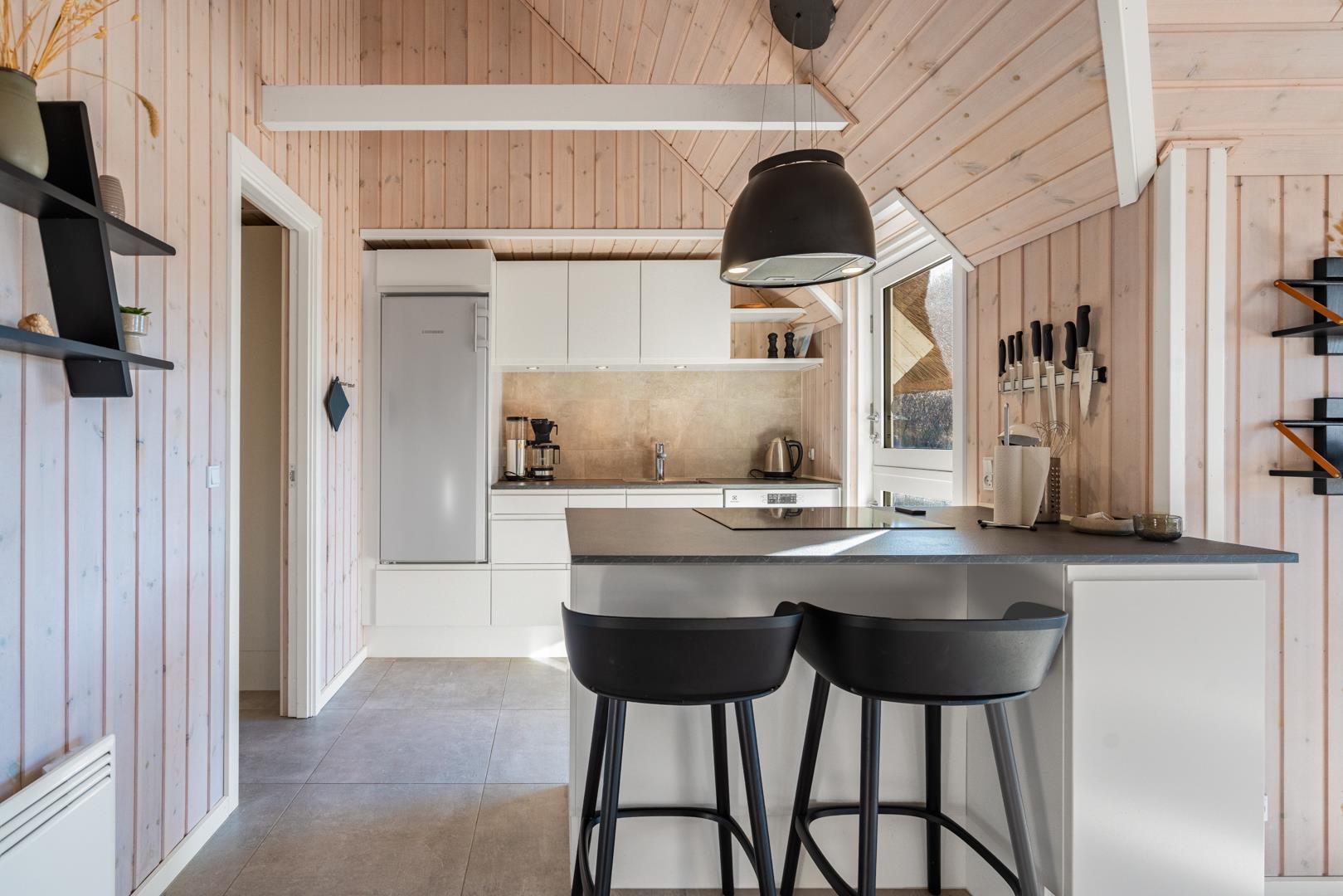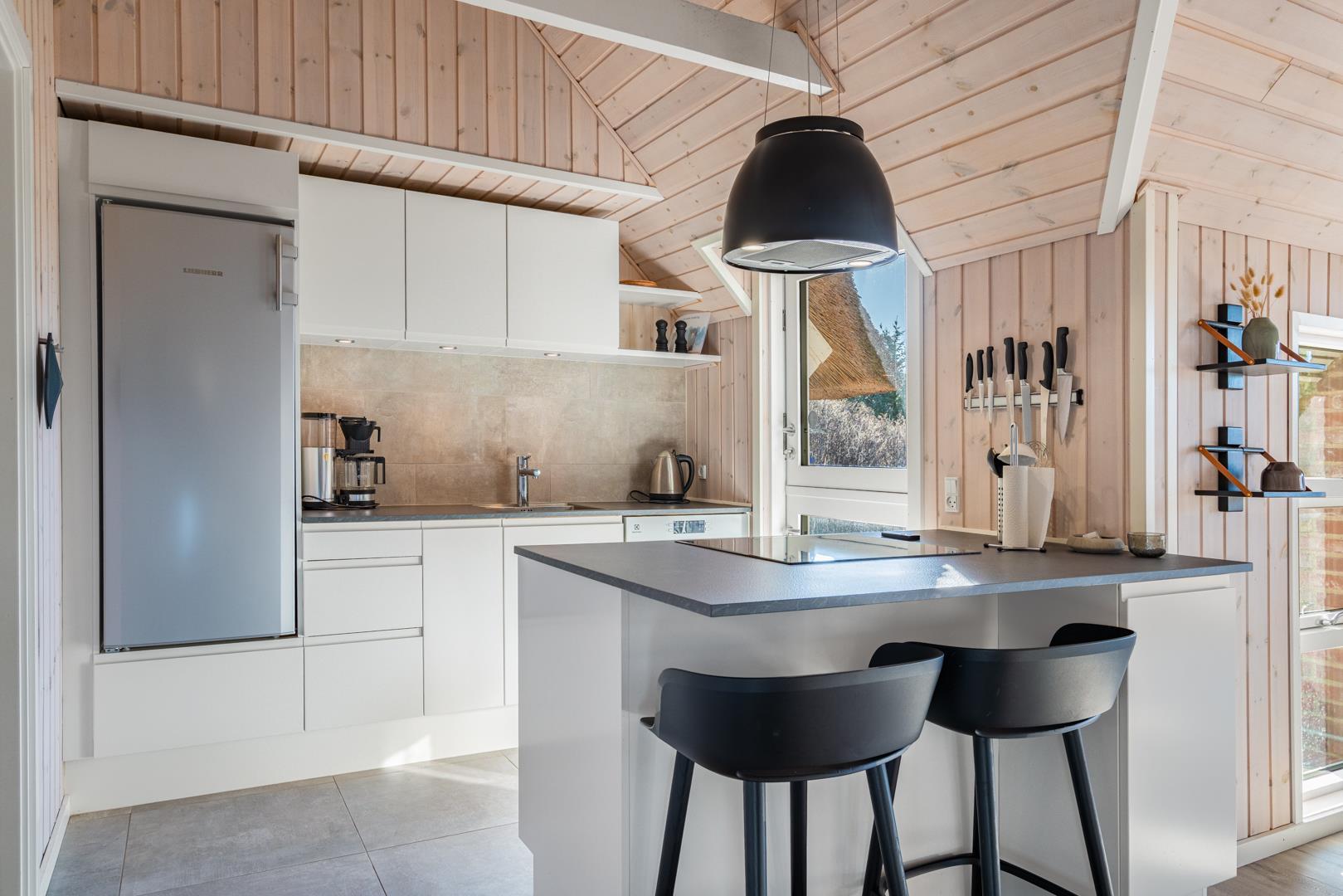 Den lyse opholdsstue er husets hjerte og indbyder til hyggelige aftener med ild i brændeovn og udsigt til de omkringliggende klitter. Det åbne køkken er veludstyret og ideelt til fælles madlavning og hyggelige måltider.
