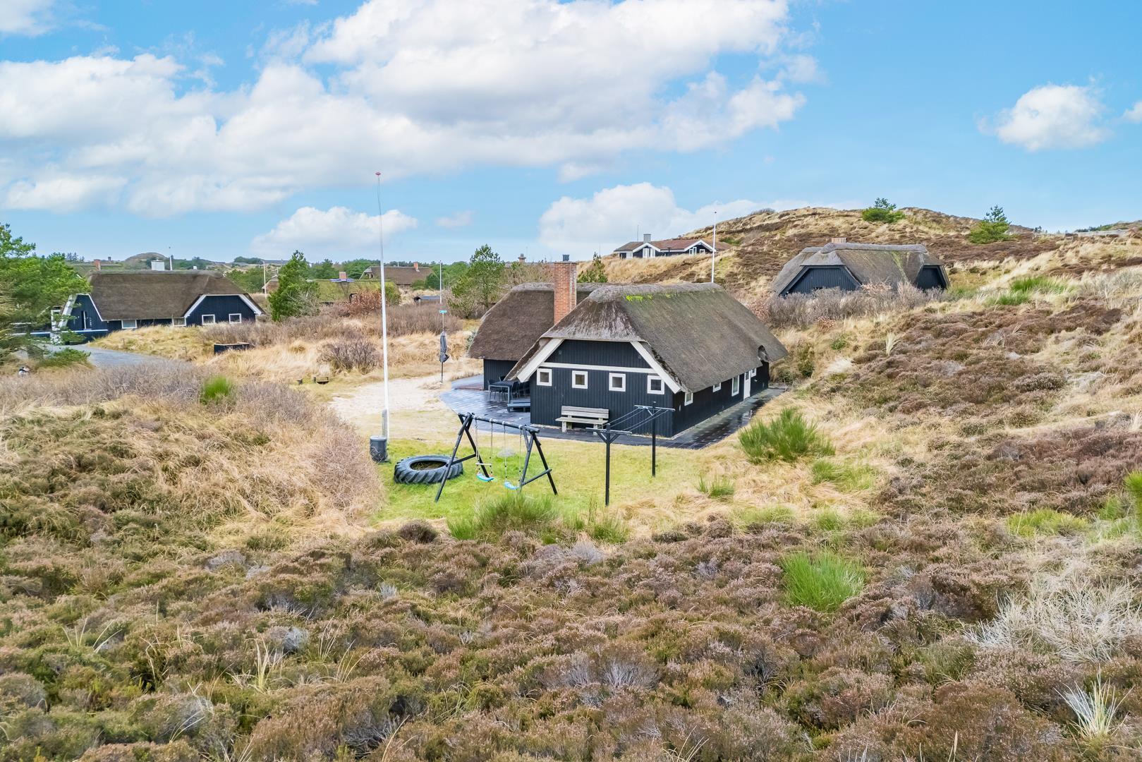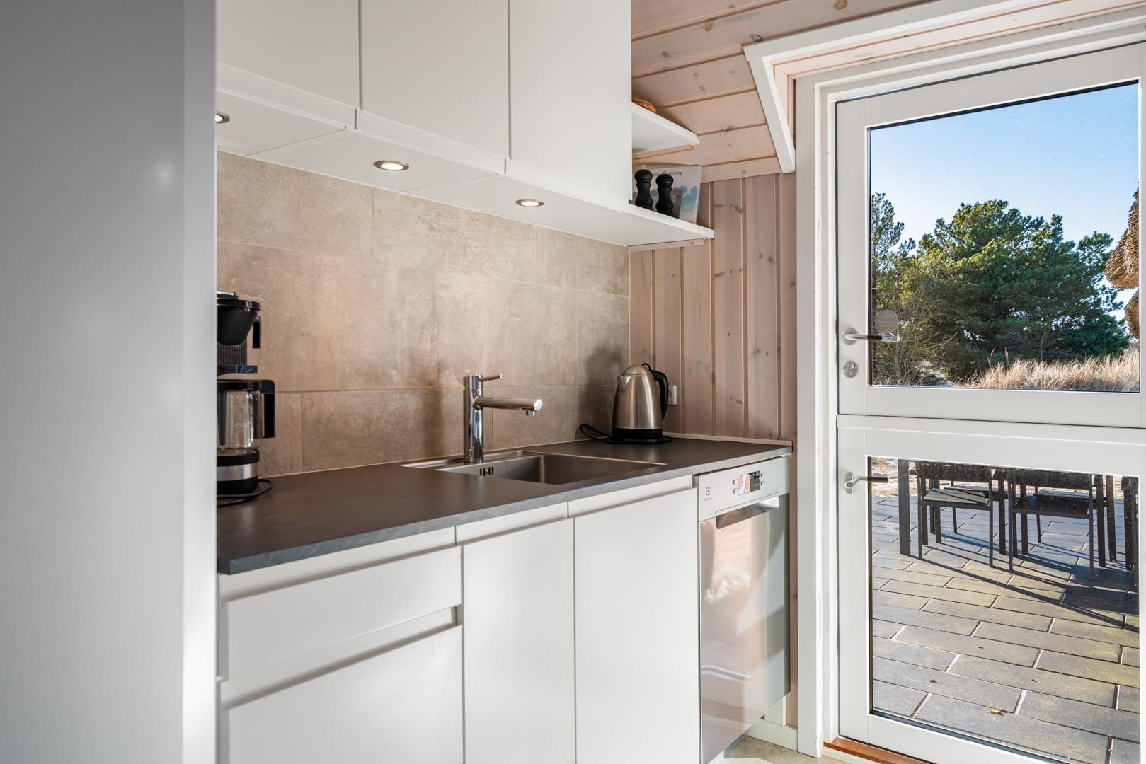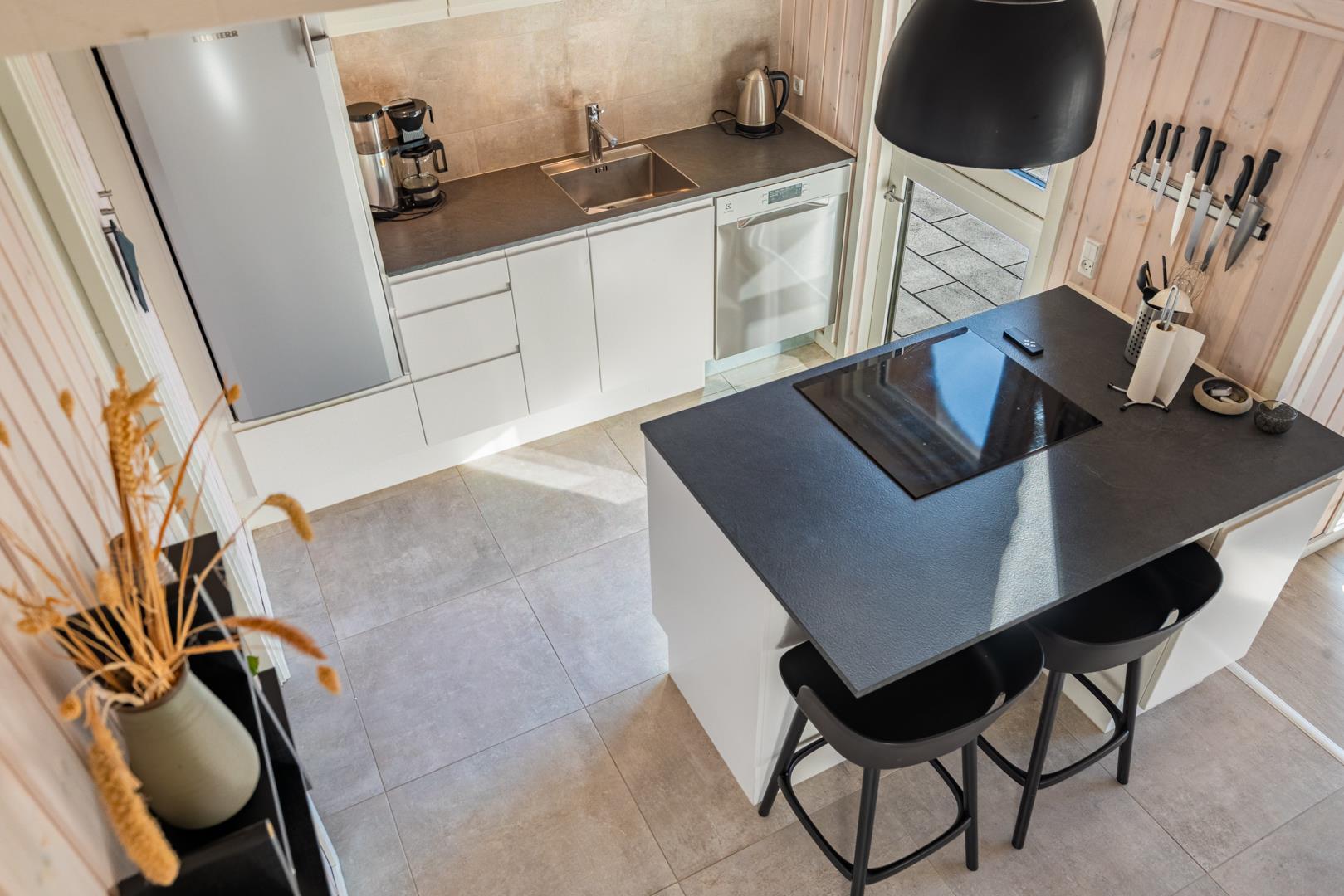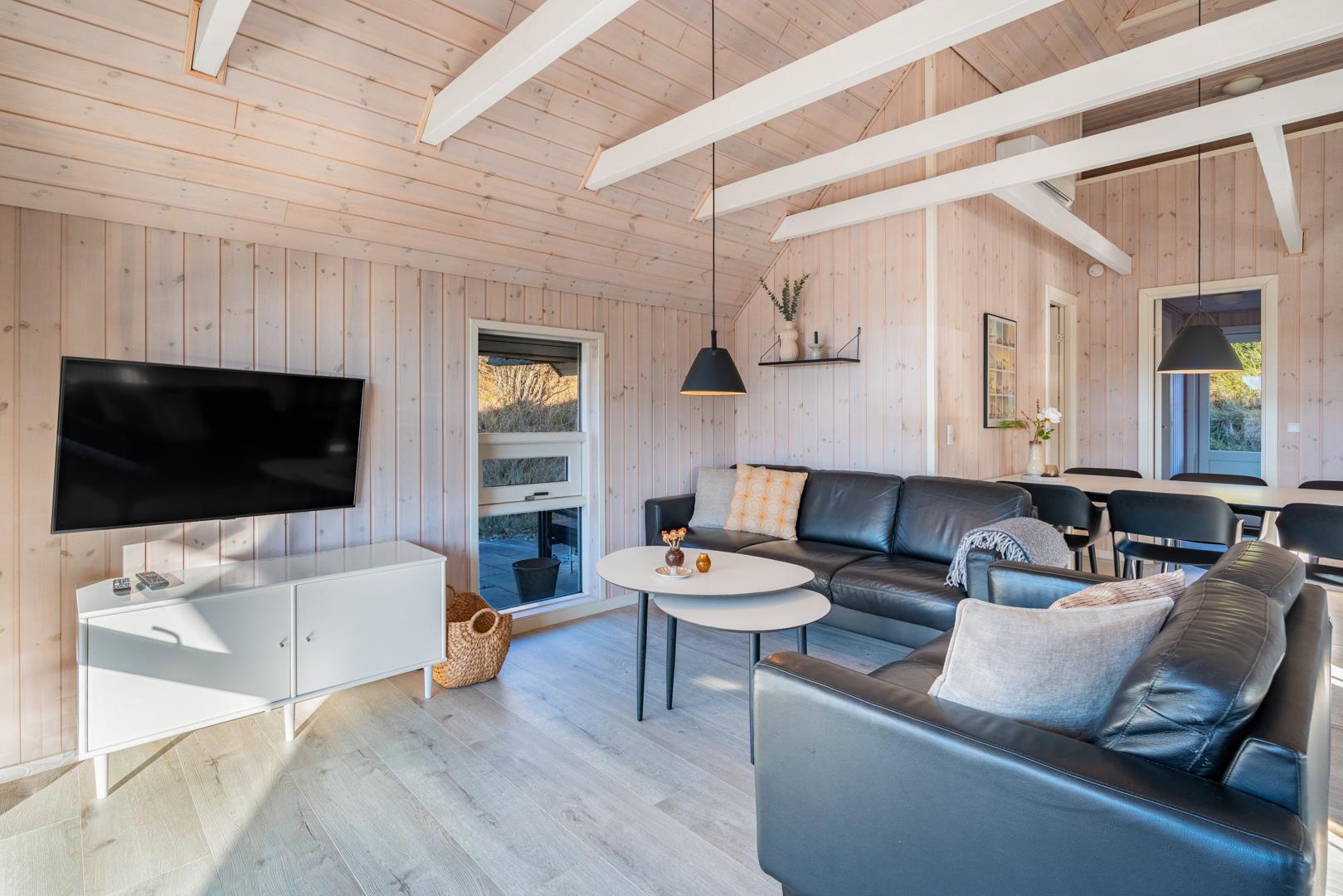 Den lyse opholdsstue er husets hjerte og indbyder til hyggelige aftener med ild i brændeovn og udsigt til de omkringliggende klitter. Det åbne køkken er veludstyret og ideelt til fælles madlavning og hyggelige måltider.