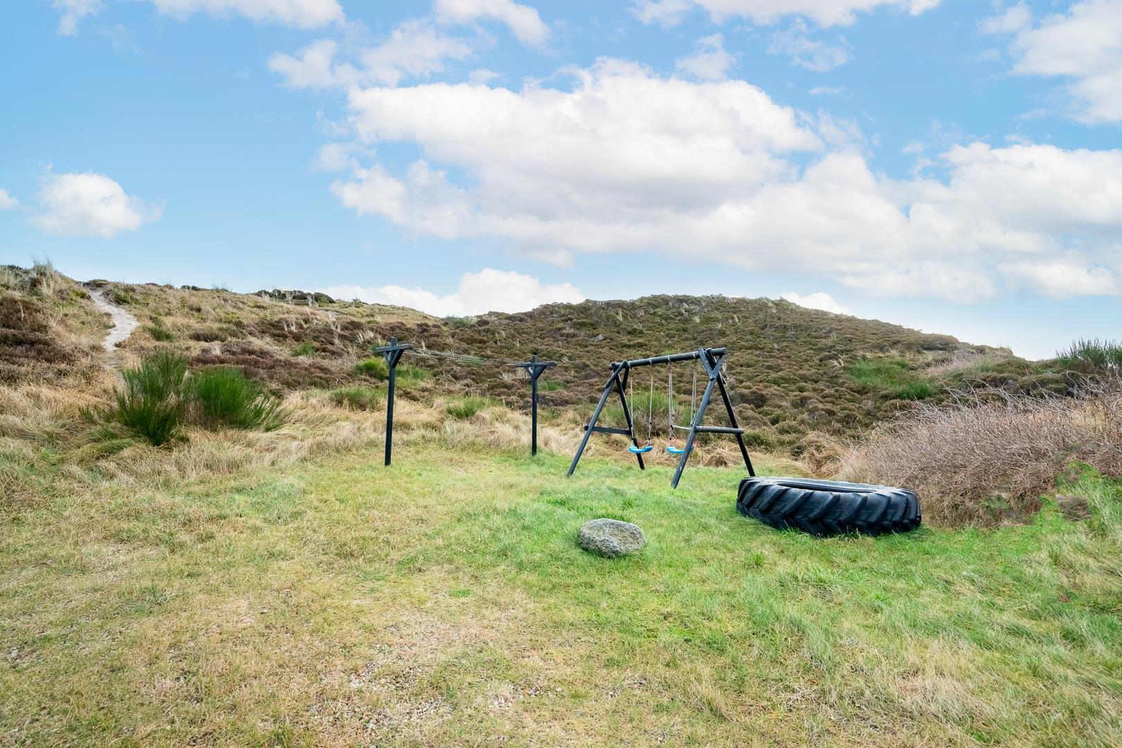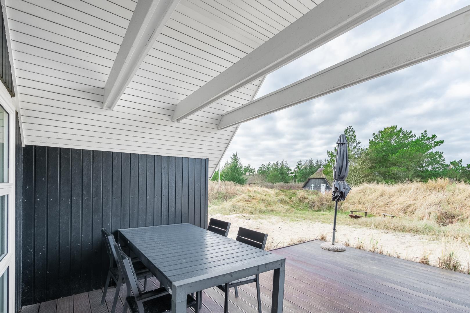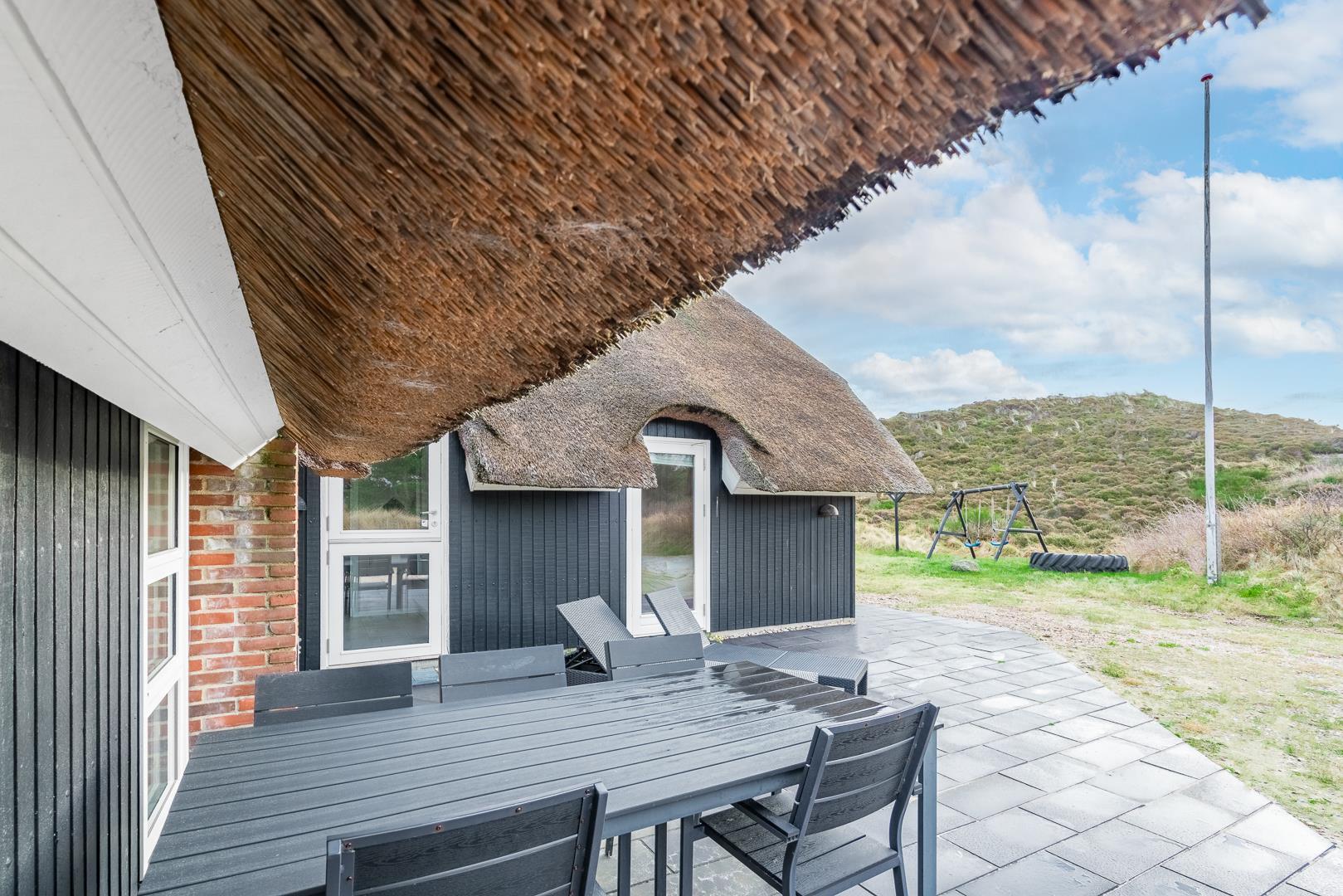 På den overdækkede terrasse kan I nyde afslappende stunder i det fri. Gynge og sandkasse gør huset særligt børnevenligt.