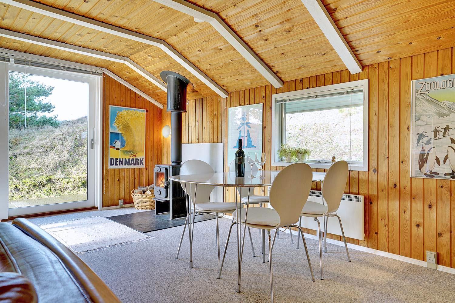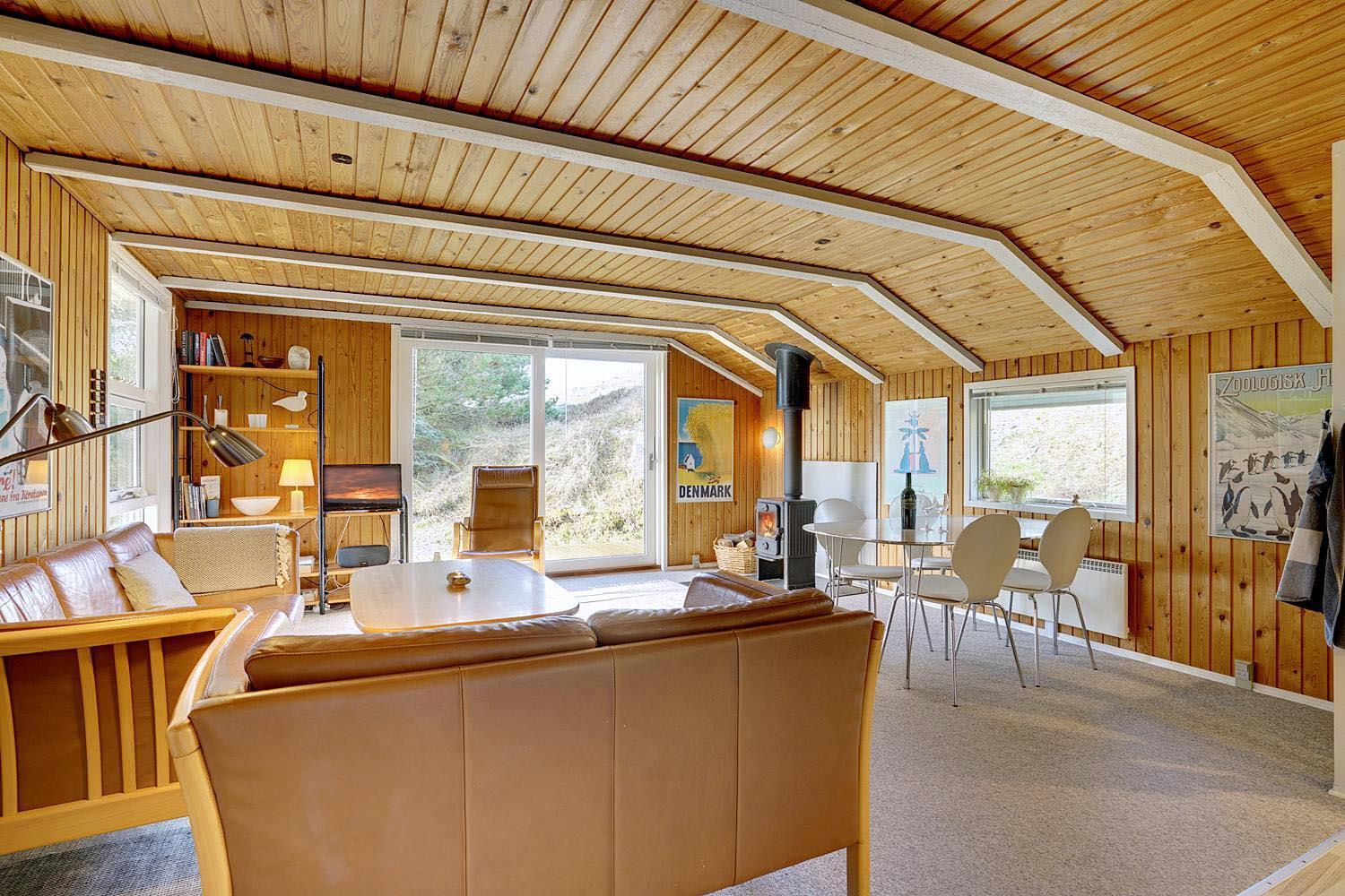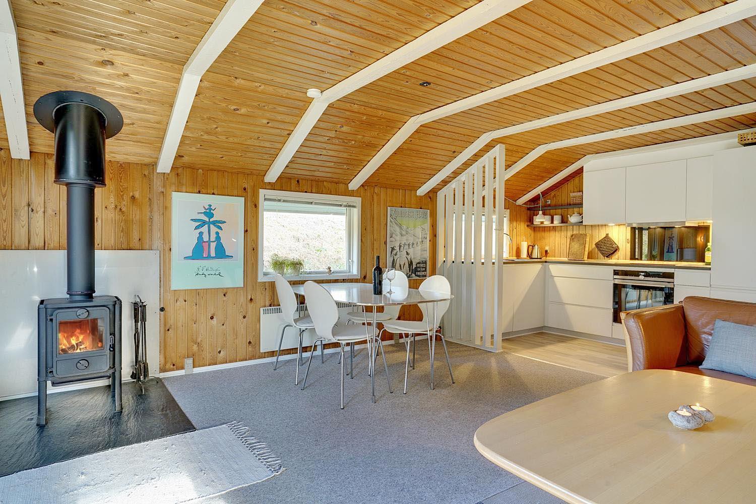 Dette dejlige, meget vedligeholdte feriehus med flere gode terrasser, hvoraf en er delvis overdækket, er beliggende på en ugeneret klitgrund. Huset er hyggeligt indrettet med køkken/alrum i åben forbindelse til pænt møbleret stue med brændeovn. Nyere badeværelse samt køkken.