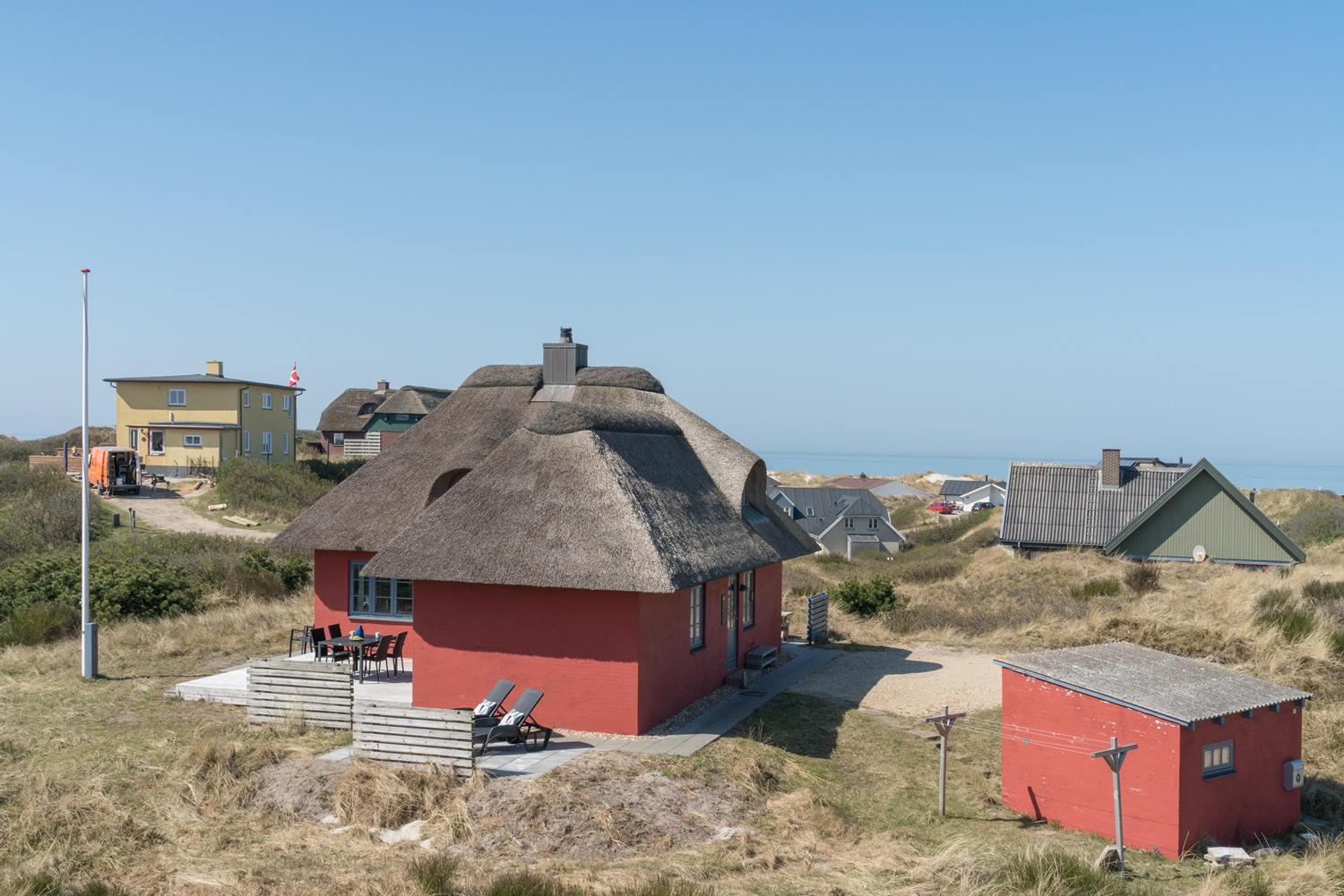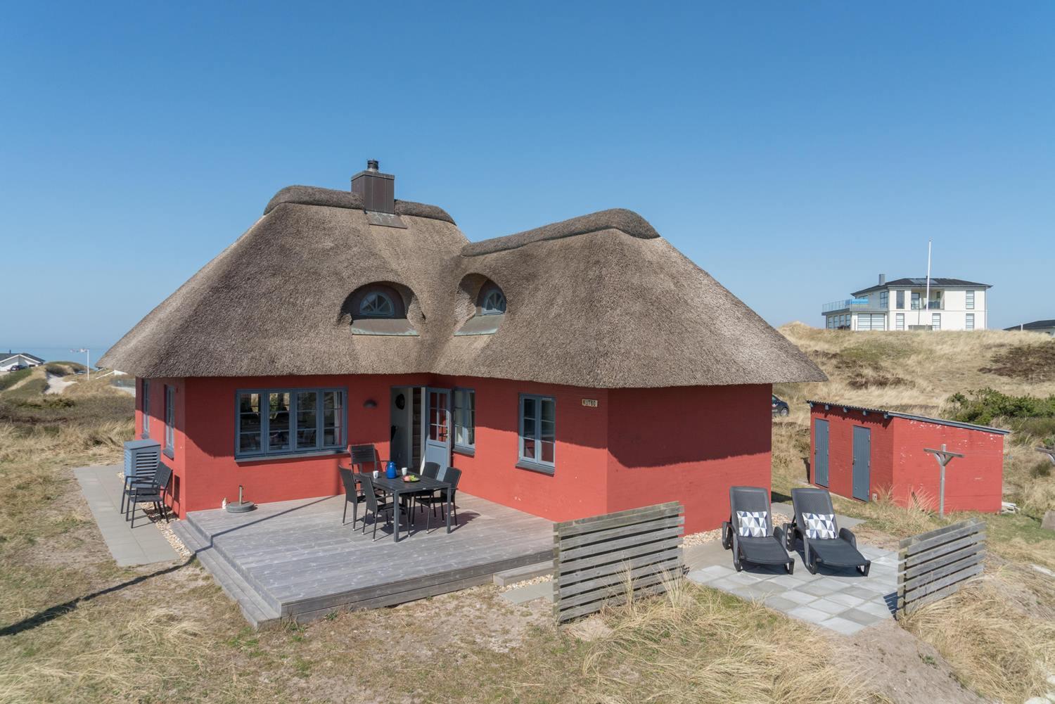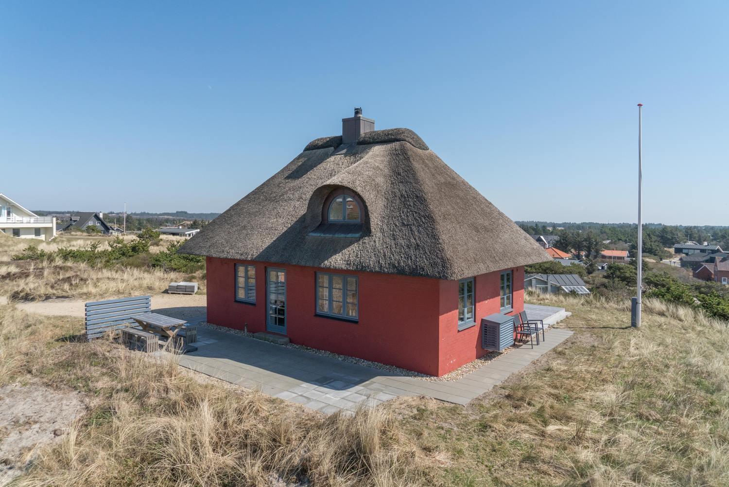 På en højtliggende naturgrund i rolige omgivelser og med fantastisk udsigt over Henne Strand og havet, ligger dette murede, stråtækte feriehus. Huset har et nyere flot køkken med gulvvarme, hyggelig og lys stue hvorfra udsigten over byen og havet kan nydes. Fra stuen er der udgang til skøn sydvendt træterrasse . På 1 sal finde man stort nyt soverum med dobbeltseng og 2 (barnesenge), det sidste soverum er i stueetagen. Huset egner sig kun til maks. 4 voksne - men der kan f.eks. godt være 4 voksne og 2 mindre børn...