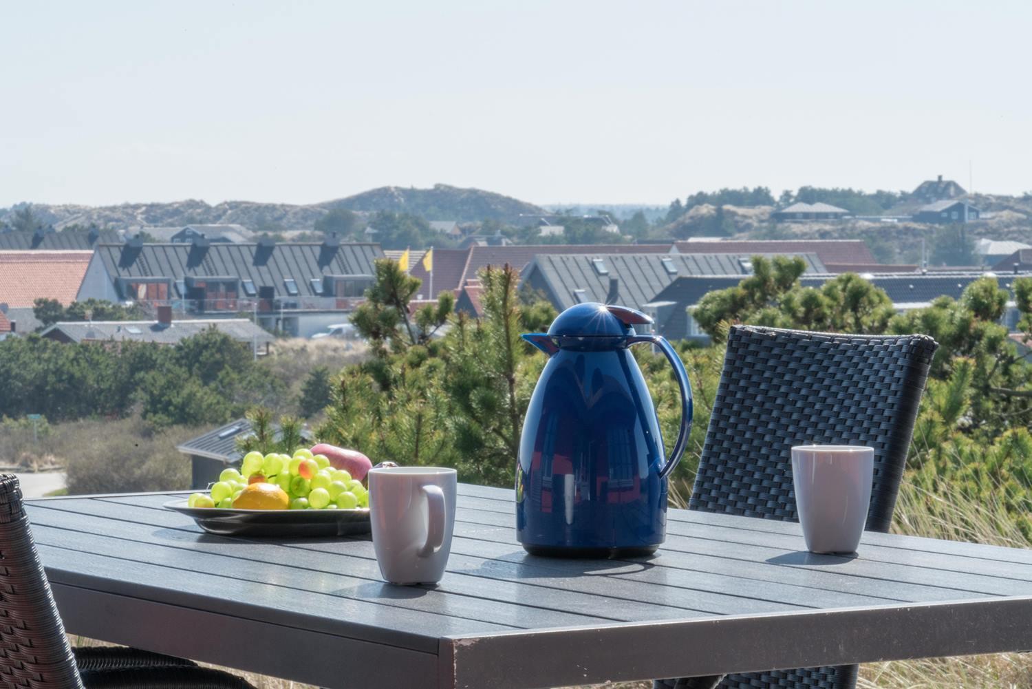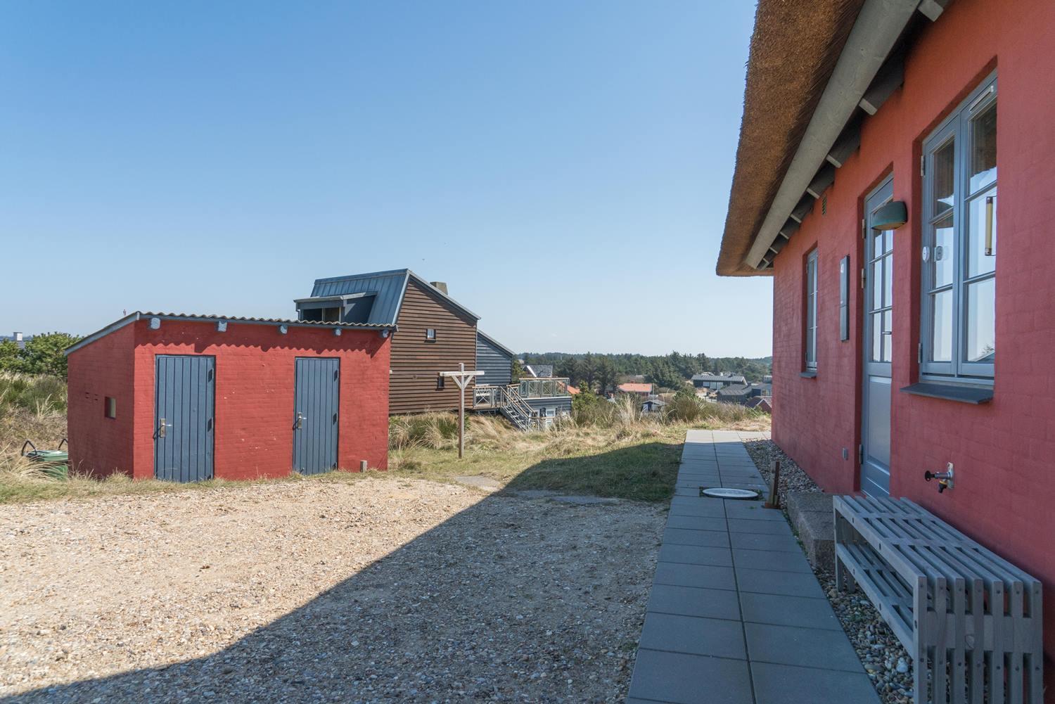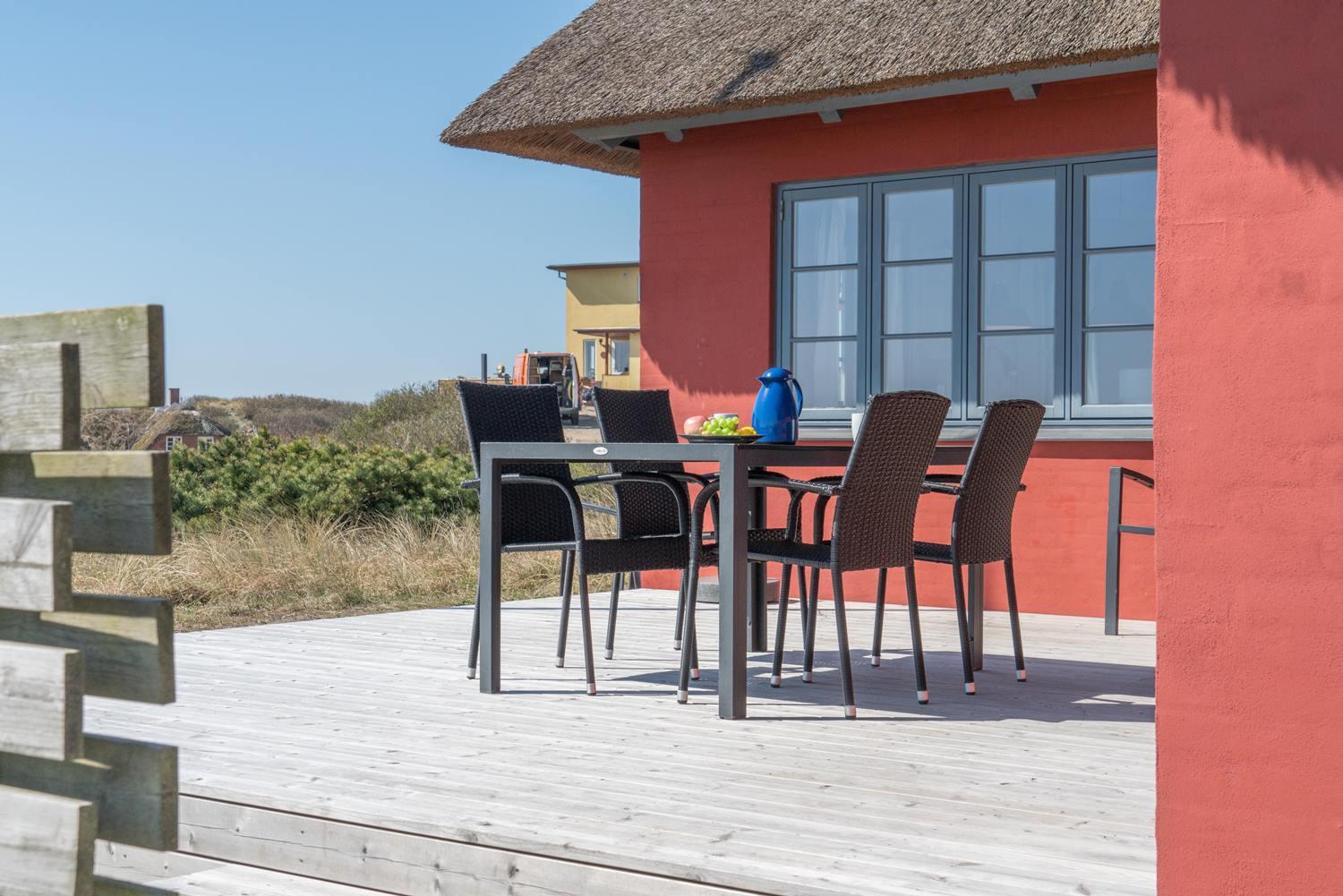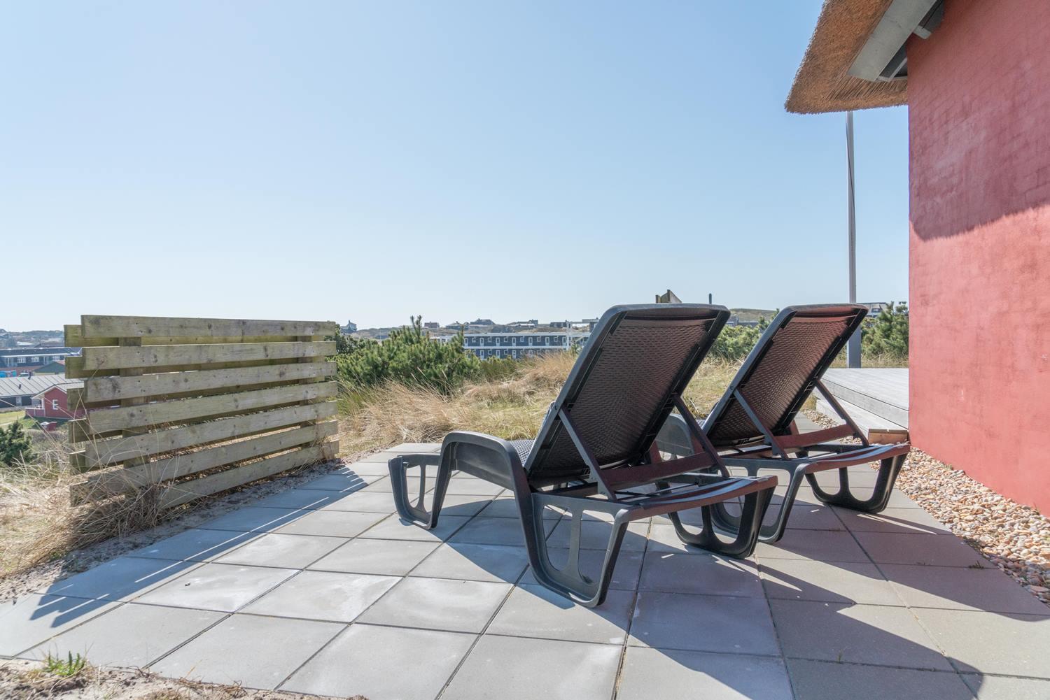 På en højtliggende naturgrund i rolige omgivelser og med fantastisk udsigt over Henne Strand og havet, ligger dette murede, stråtækte feriehus. Huset har et nyere flot køkken med gulvvarme, hyggelig og lys stue hvorfra udsigten over byen og havet kan nydes. Fra stuen er der udgang til skøn sydvendt træterrasse . På 1 sal finde man stort nyt soverum med dobbeltseng og 2 (barnesenge), det sidste soverum er i stueetagen. Huset egner sig kun til maks. 4 voksne - men der kan f.eks. godt være 4 voksne og 2 mindre børn...