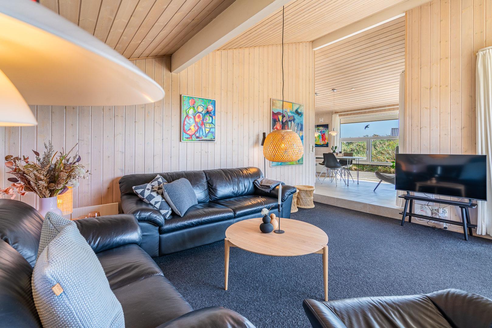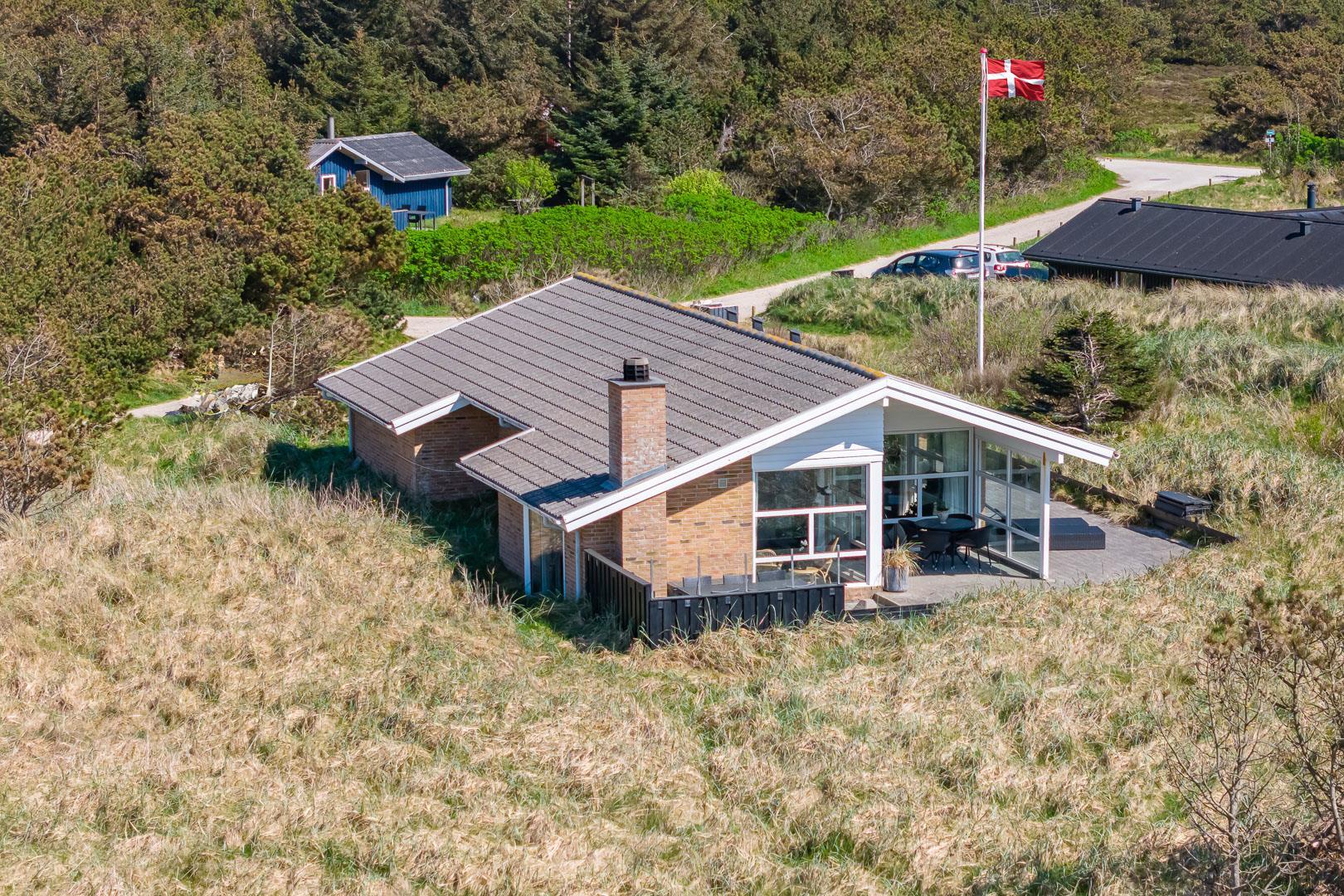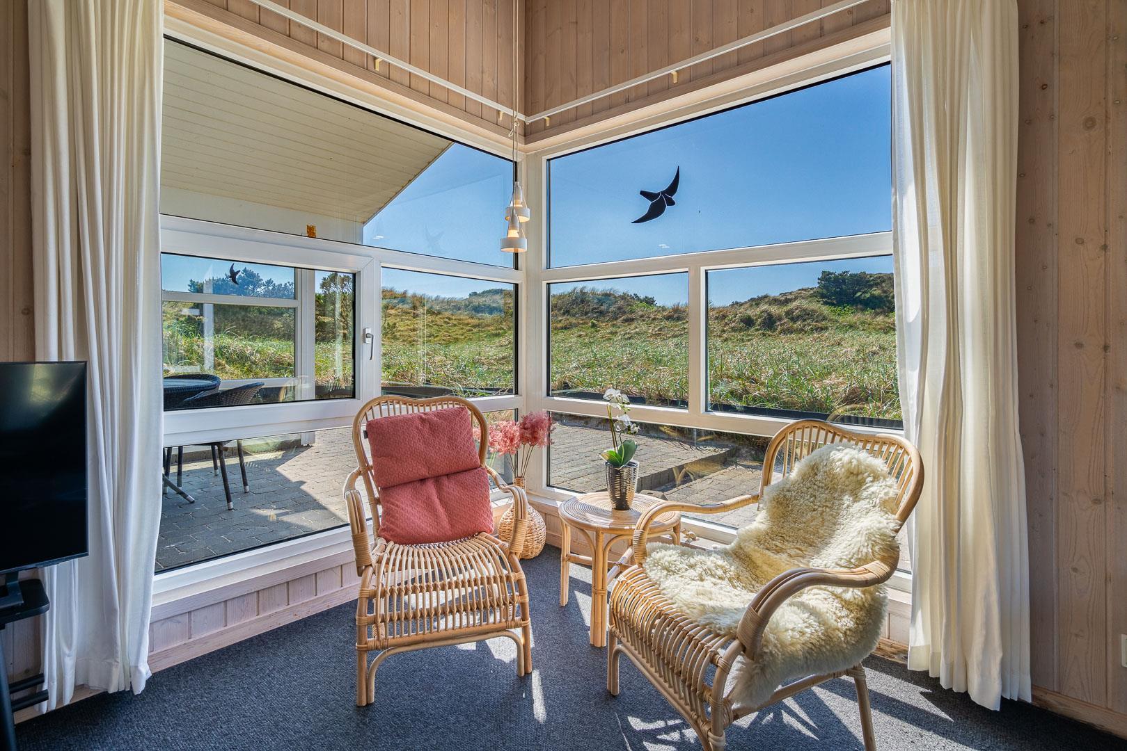 På en stor flot naturgrund ligger dette velpassede feriehus helt ugeneret og med pragtfuld udsigt over det fredede klitområde. Nyere køkken med åben forbindelse til den velmøblerede stue. 3 gode soverum som er udstyrede med boksmadrasser. Nyt flot badeværelse med badekar og sauna, samt ekstra WC i forbindelse med det ene soverum. Tre terrasser omkranser huset, så udelivet og den skønne udsigt kan nydes hele dagen. Fra køkken/spiseafdeling er der direkte udgang til terrasse hvoraf den ene er overdækket. . Et 'super-hus', hvor rammerne er til stede for en rigtig god ferie - hele året.
