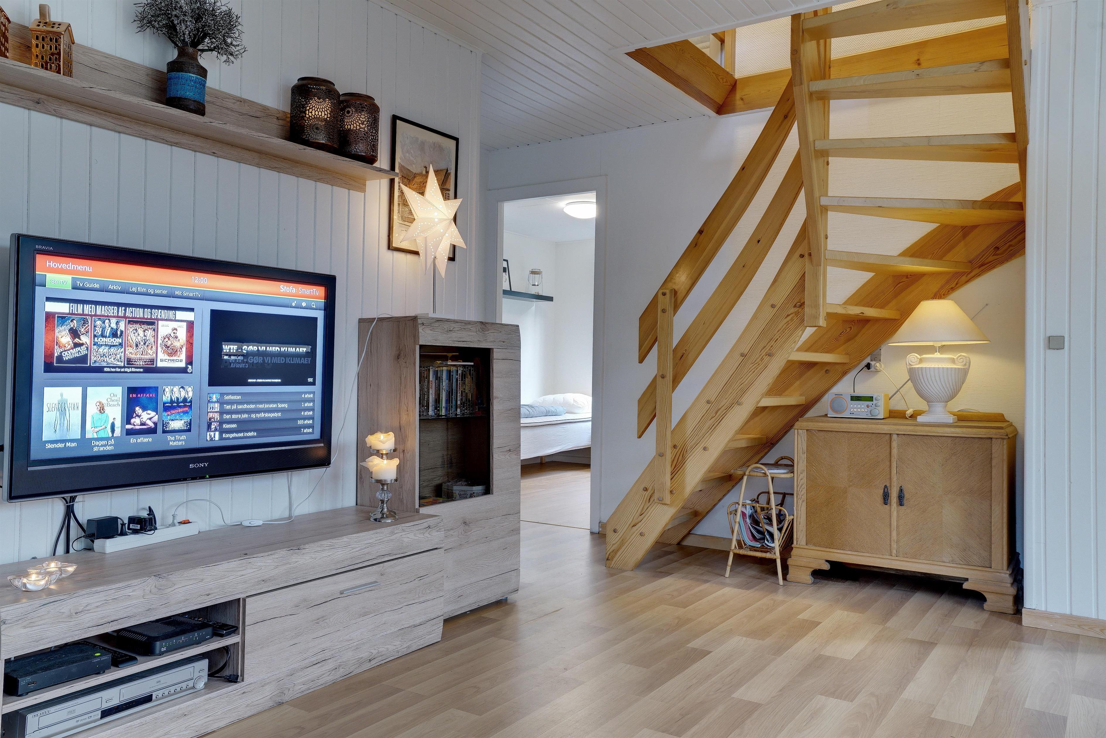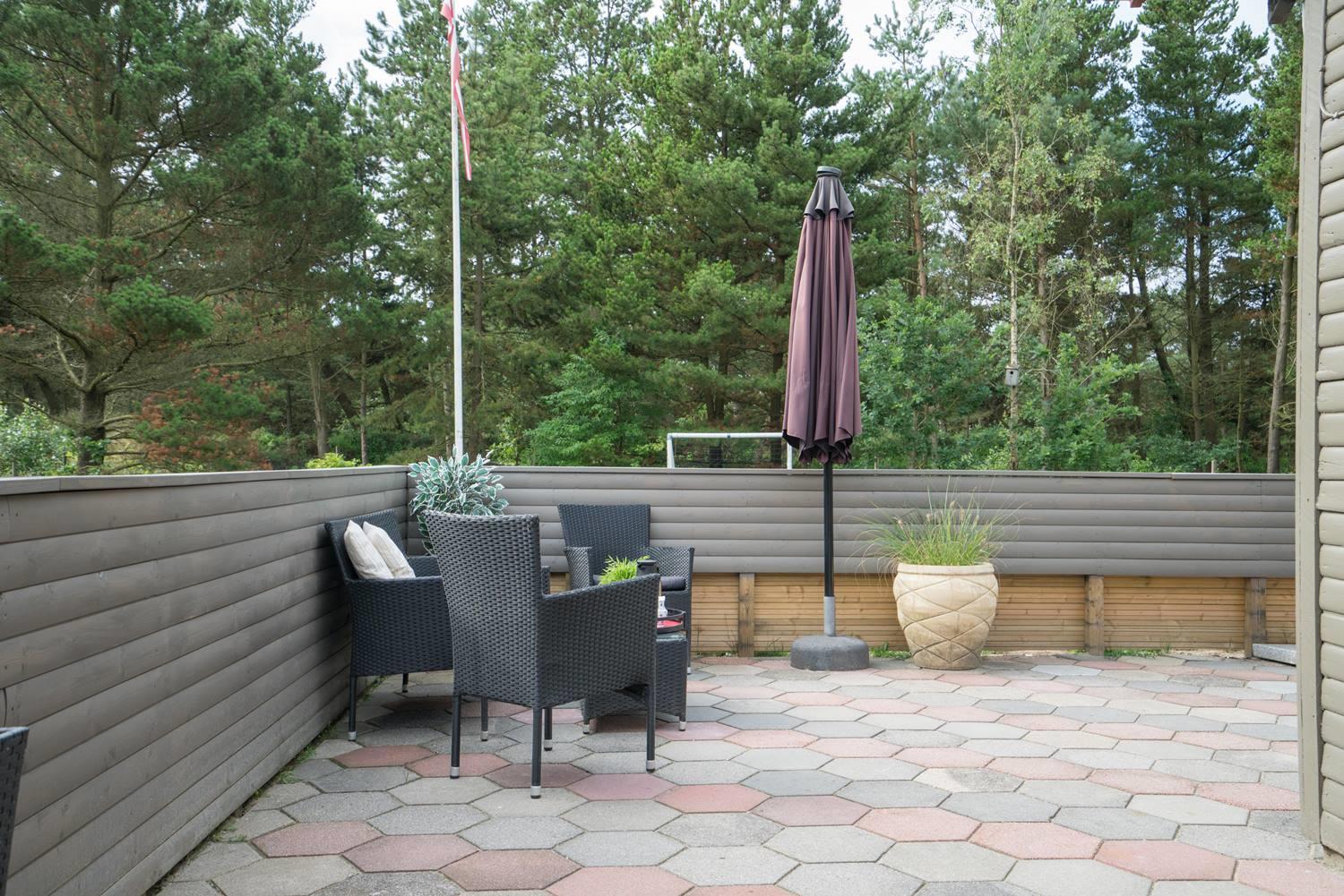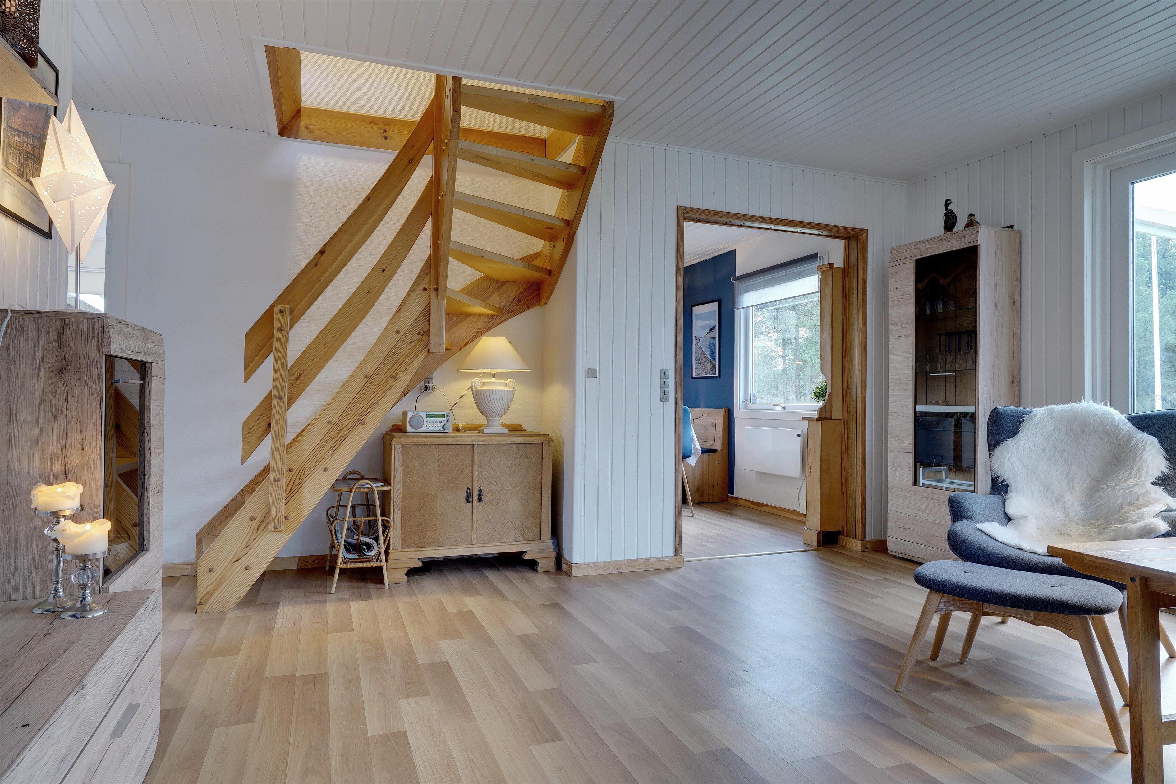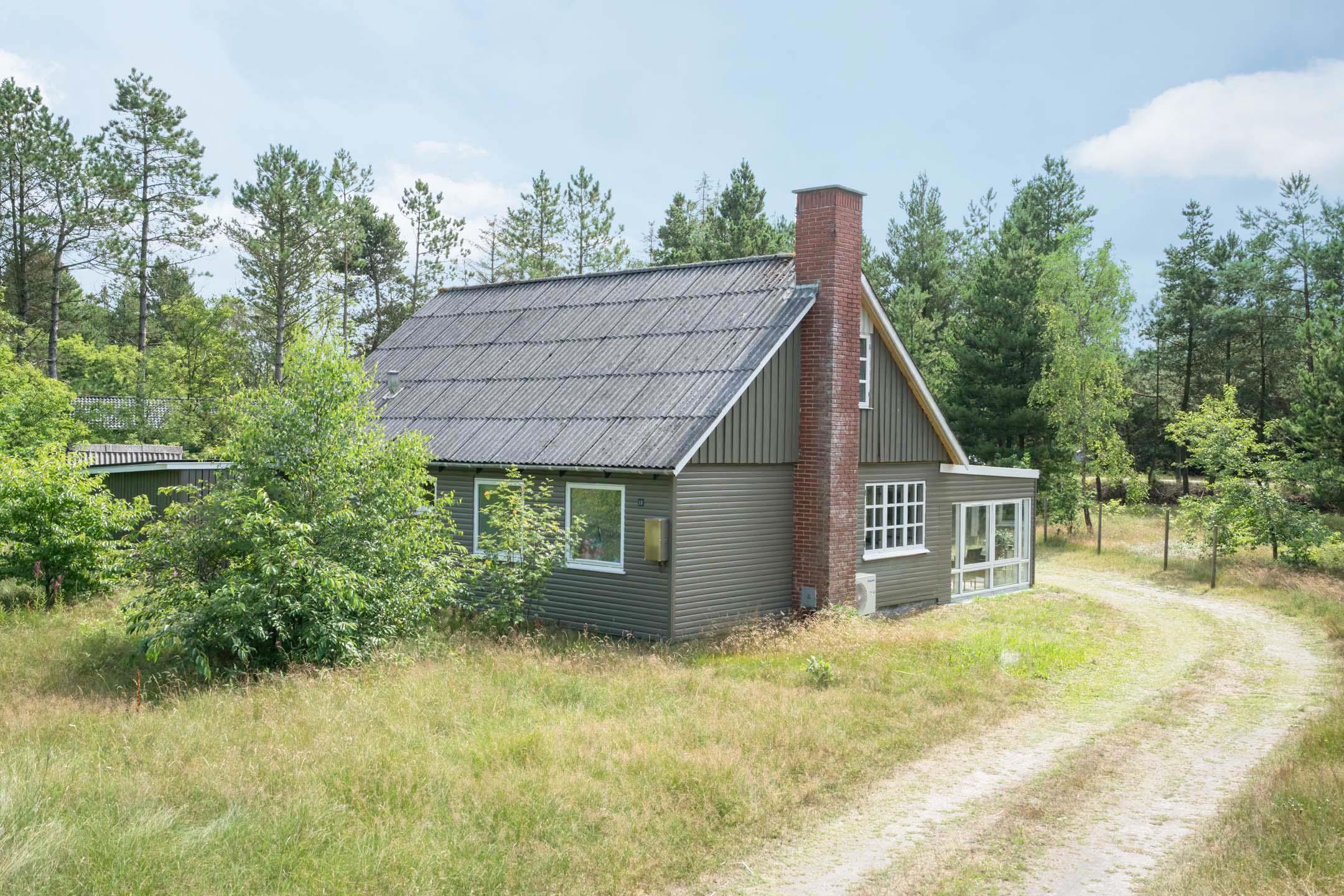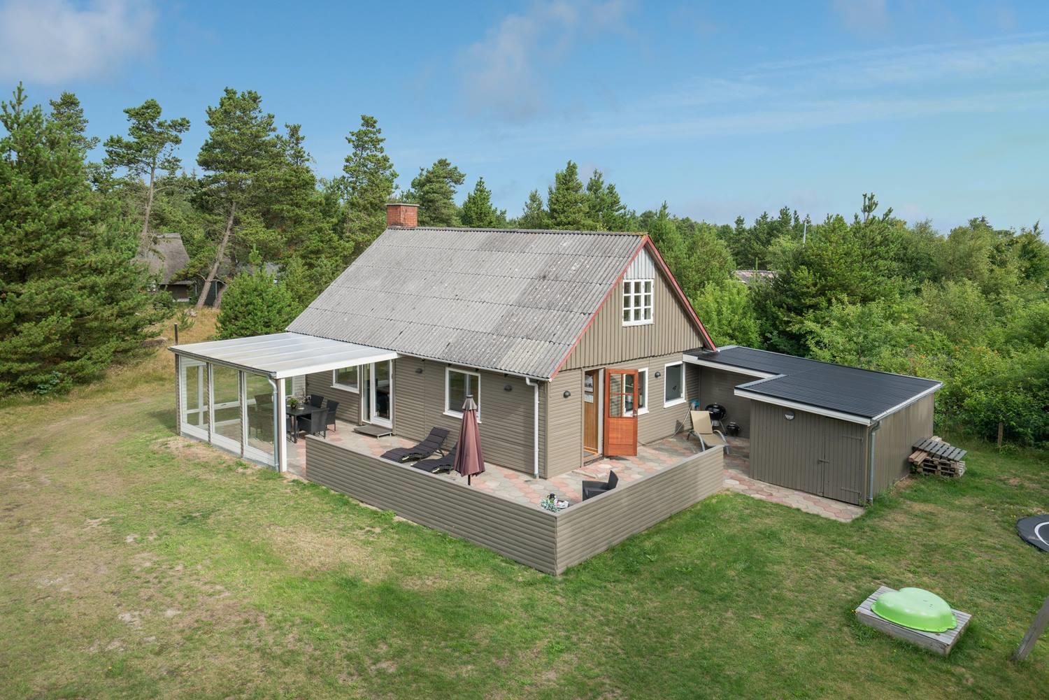 Dejligt feriehus på stor grund som er omkranset af nåletræer - halvdelen af grunden er indhegnet til hund. Huset præsenterer sig lyst, venligt og indrettet med gode møbler. Husets renoverede køkken lligger er i åben forbindelse med spiseafdeling og huset hyggelige stue med brændeovn energibesparende varmepumpe.. Badeværelse med sauna. På 1 sal. er der 2 store soverum med dobbeltsenge og i stueetage 1 værelse med 2 enkeltsenge. Fra husets stue er der udgang til skøn og og læ fuld overdækket terrasse. OBS: Der er kun hund tilladt i huset som husdyr.