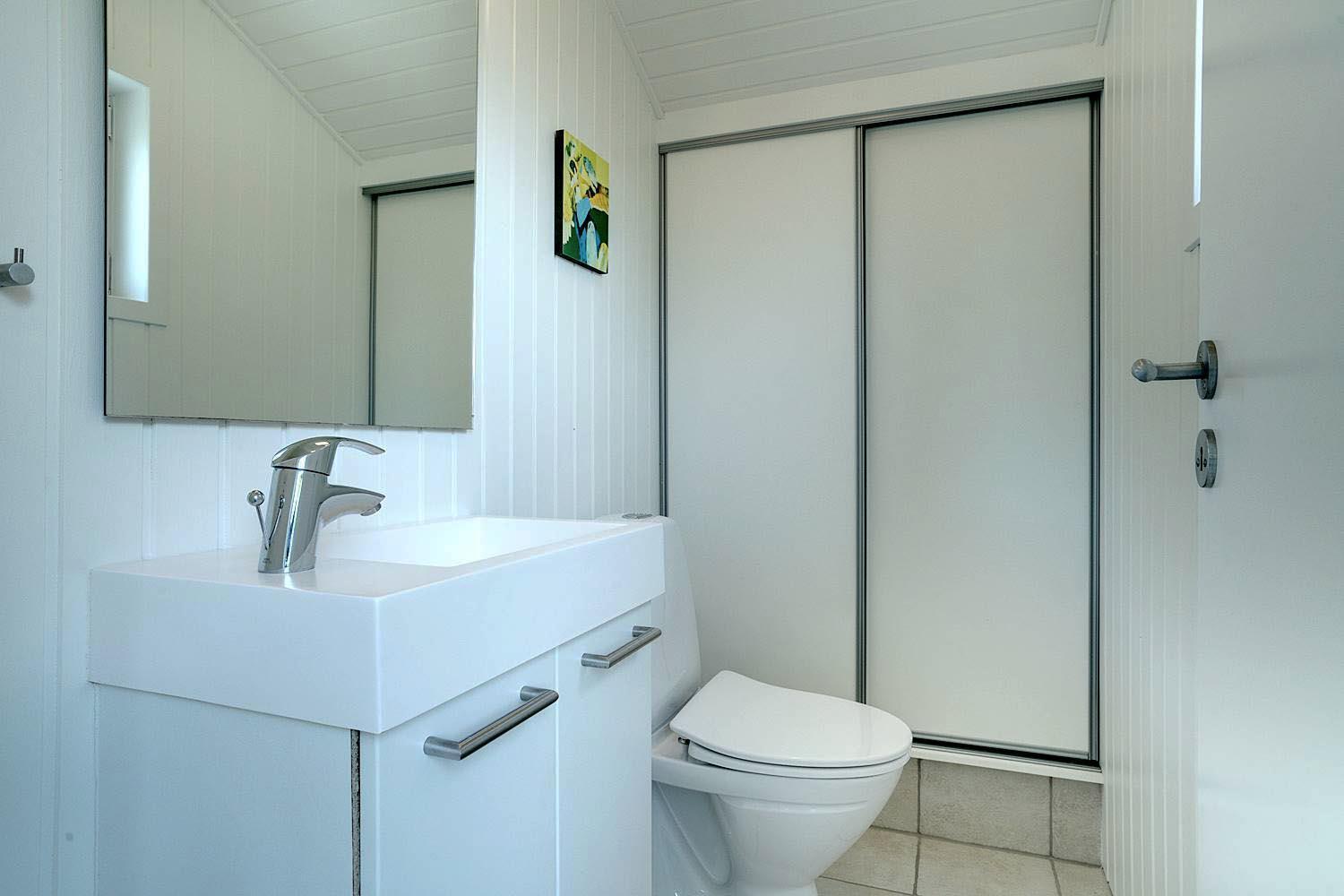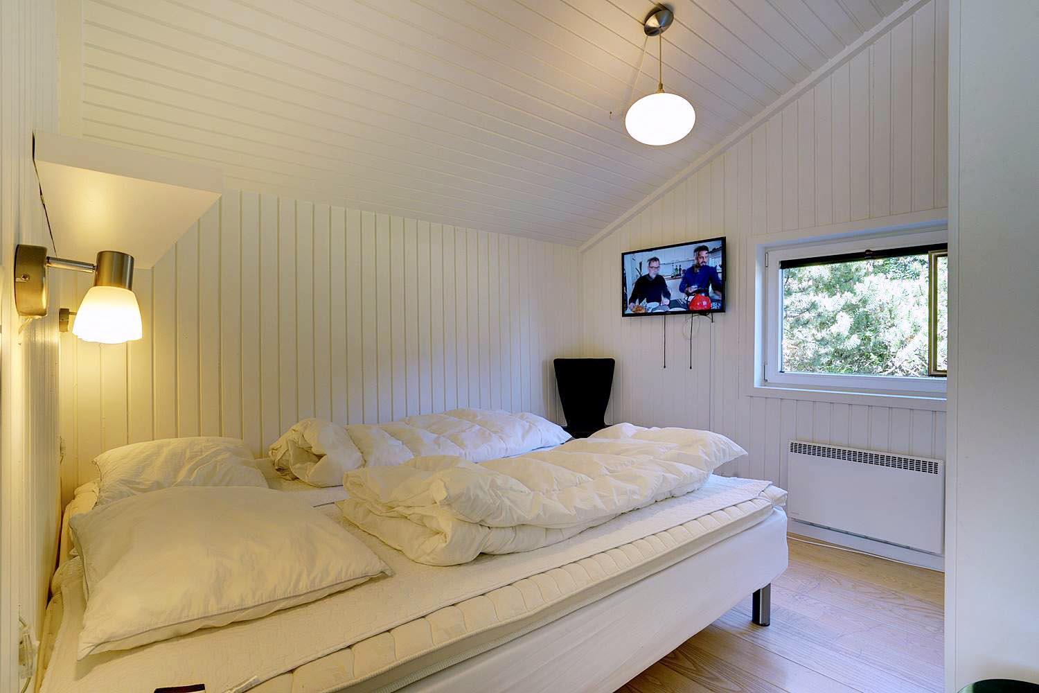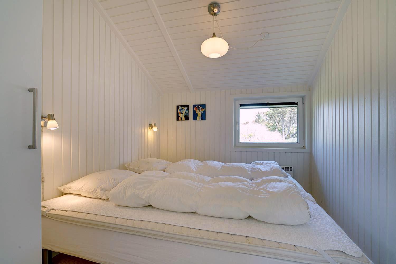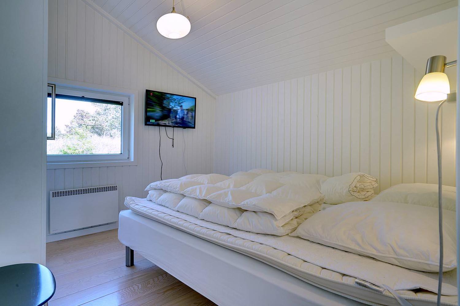 Huset råder over fire gode værelser, hvoraf tre er udstyret med dobbeltsenge (90 x 200 cm – to madrasser), hvilket sikrer god komfort for alle gæster. Der er to badeværelser, begge med gulvvarme, hvoraf det ene er med bruser, og det andet har toilet.