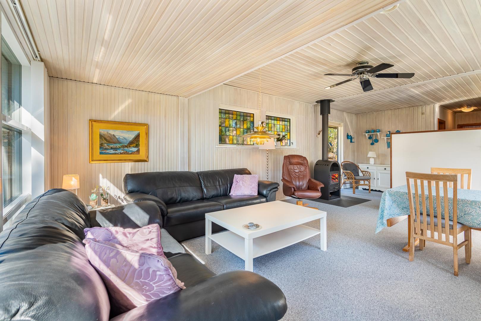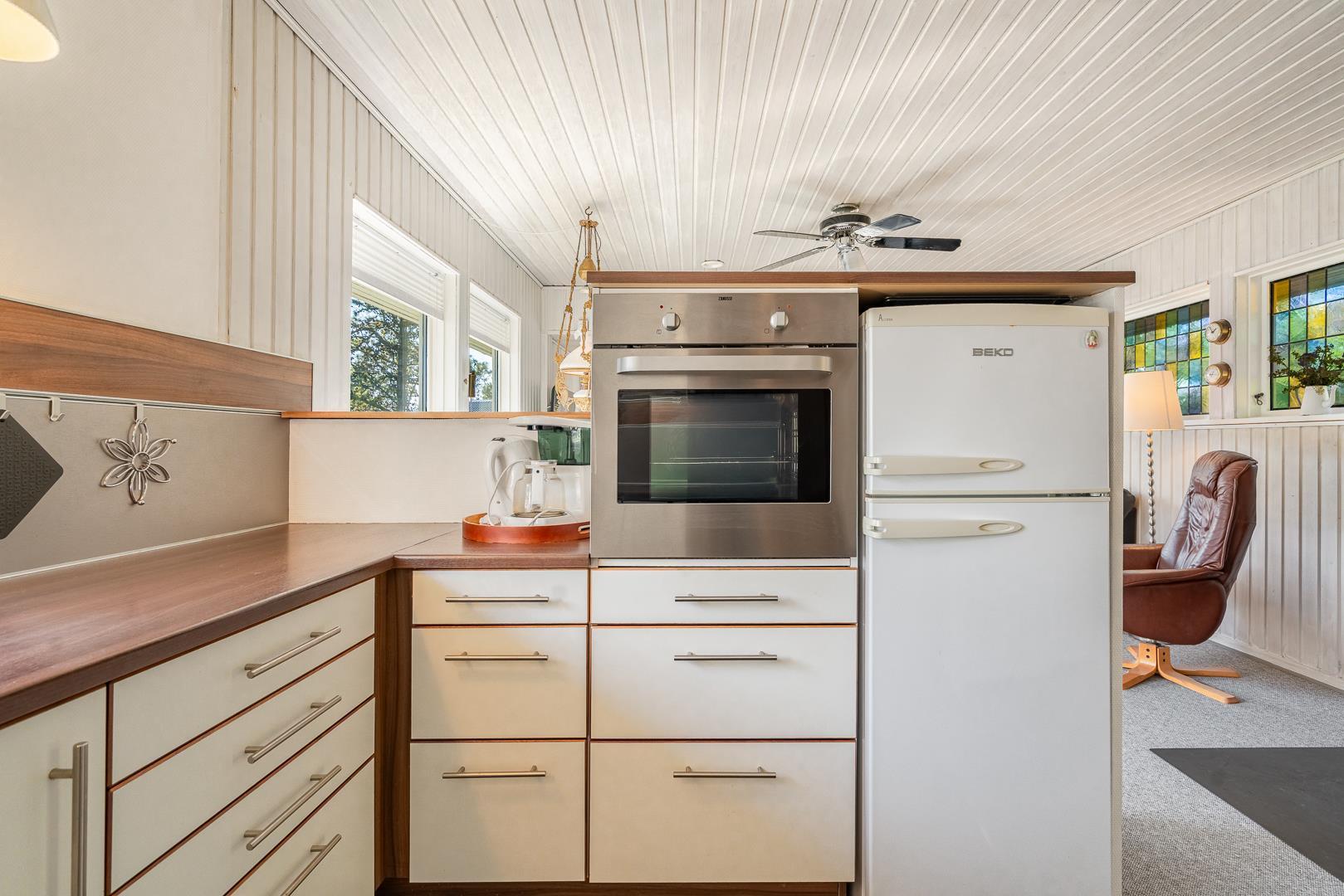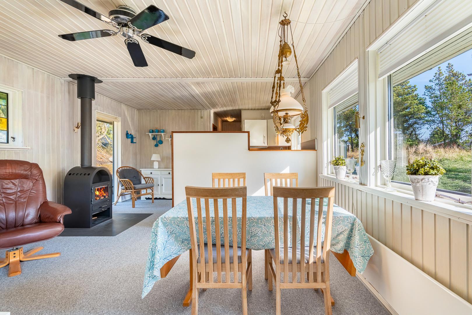 Et åbent køkken og en rummelig stue med brændeovn hvor gavlen i vest har et stort vinduesparti ud til terrassen hvor man kan nyde aftensolen. Køkkenet er lyst og venligt i skandinavisk stil. Ved øst gavlen er der en lille havestue.