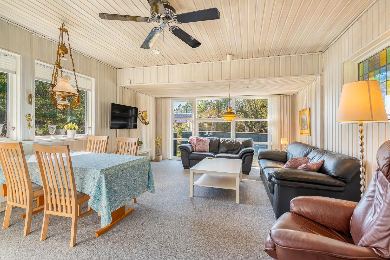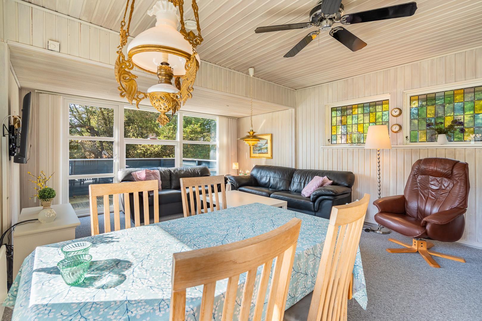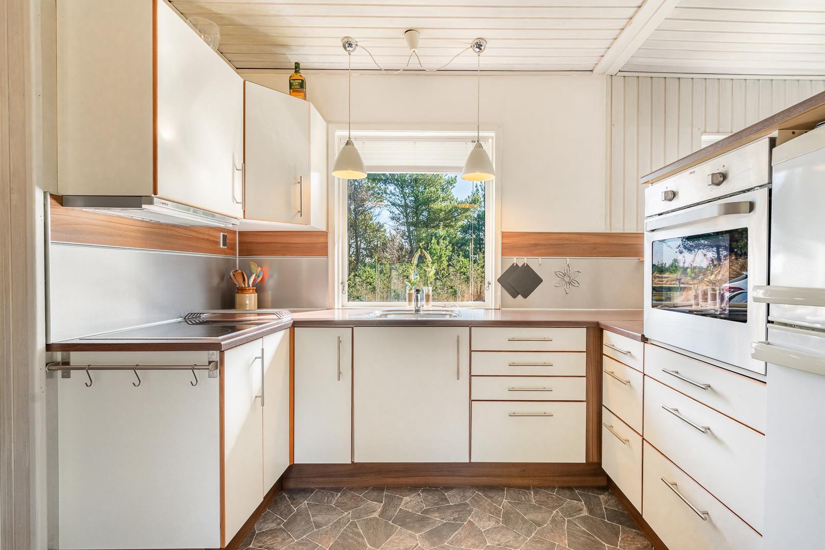 Et åbent køkken og en rummelig stue med brændeovn hvor gavlen i vest har et stort vinduesparti ud til terrassen hvor man kan nyde aftensolen. Køkkenet er lyst og venligt i skandinavisk stil. Ved øst gavlen er der en lille havestue.