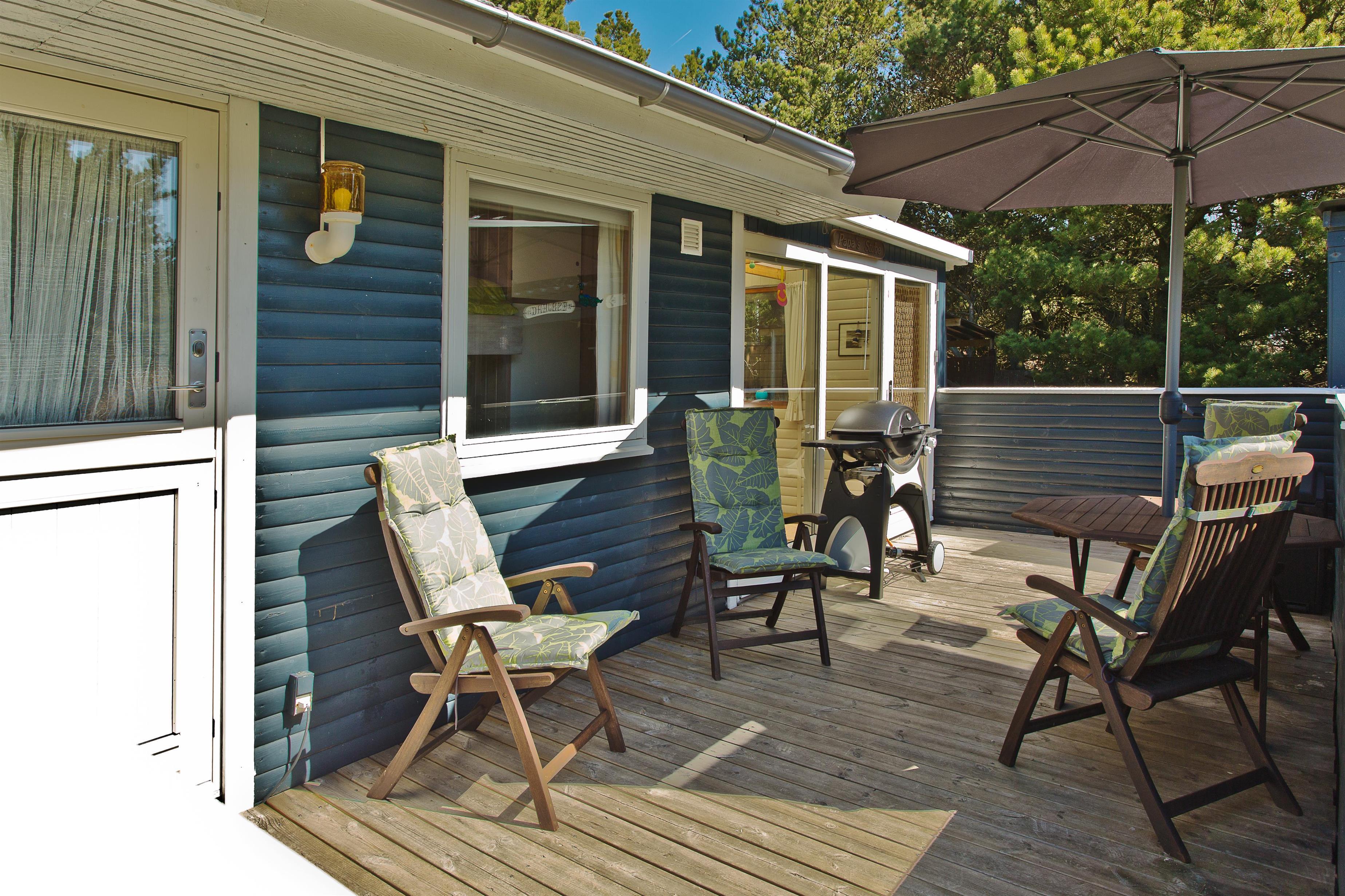 Sommerhuset har 2 terrasser en mod vest og en mod syd. Her finder man havemøbler, liggestole med hynder parasol og grill. Grunden er en dejlig stor naturgrund med god plads både foran og bagved huset.