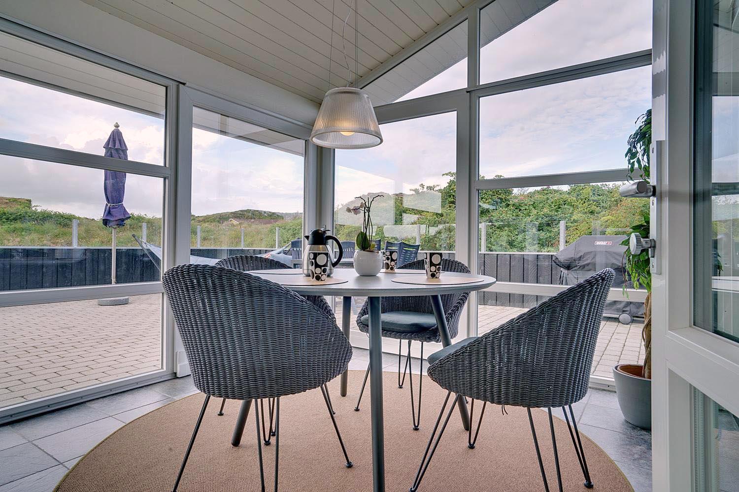 Døren i et af opholdsrummets mange glaspartier fører dig direkte videre til en lys udestue, og er det sommer, kan du skyde døren til side herude også, og skabe åben forbindelse helt ud på husets kæmpestore terrasse.