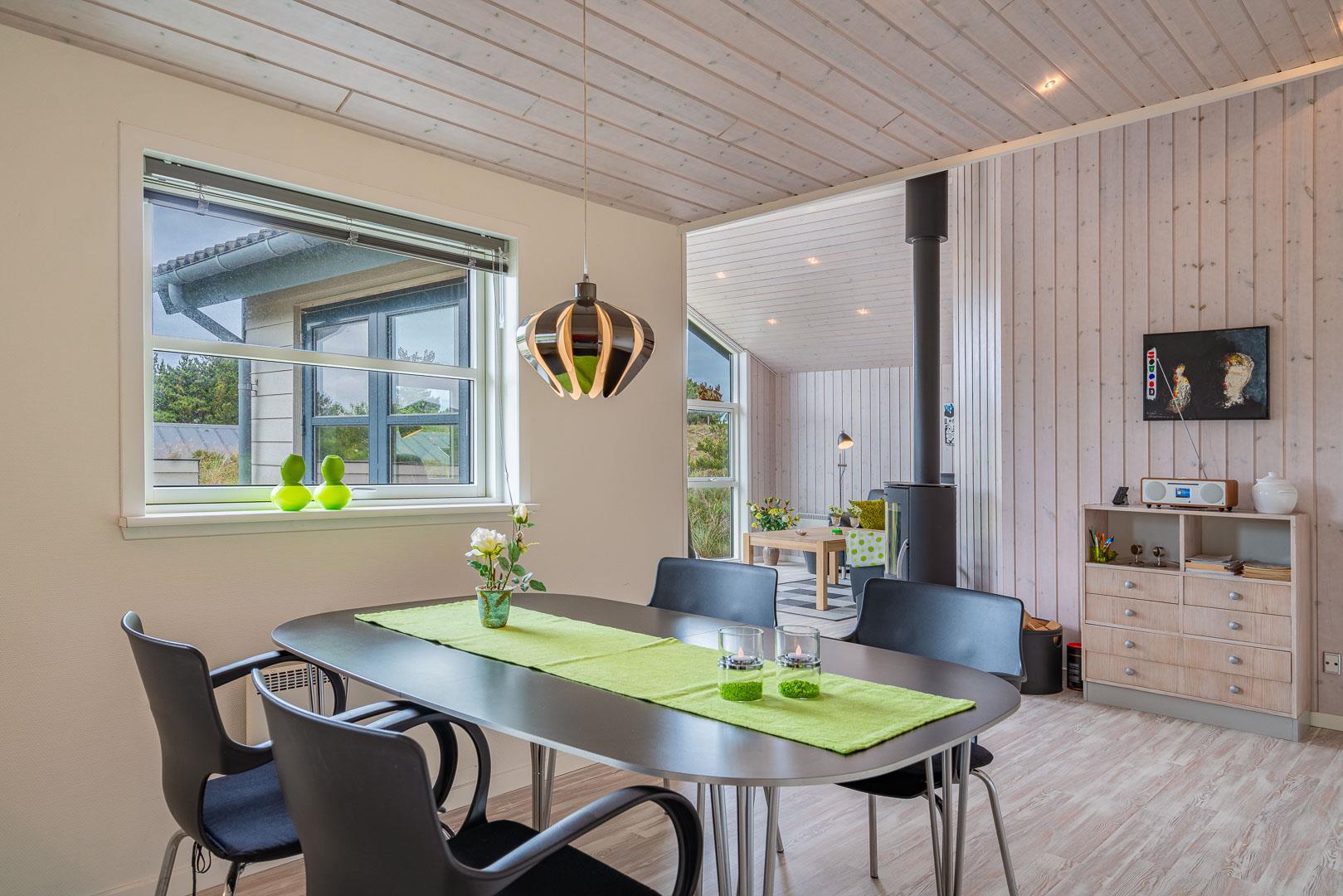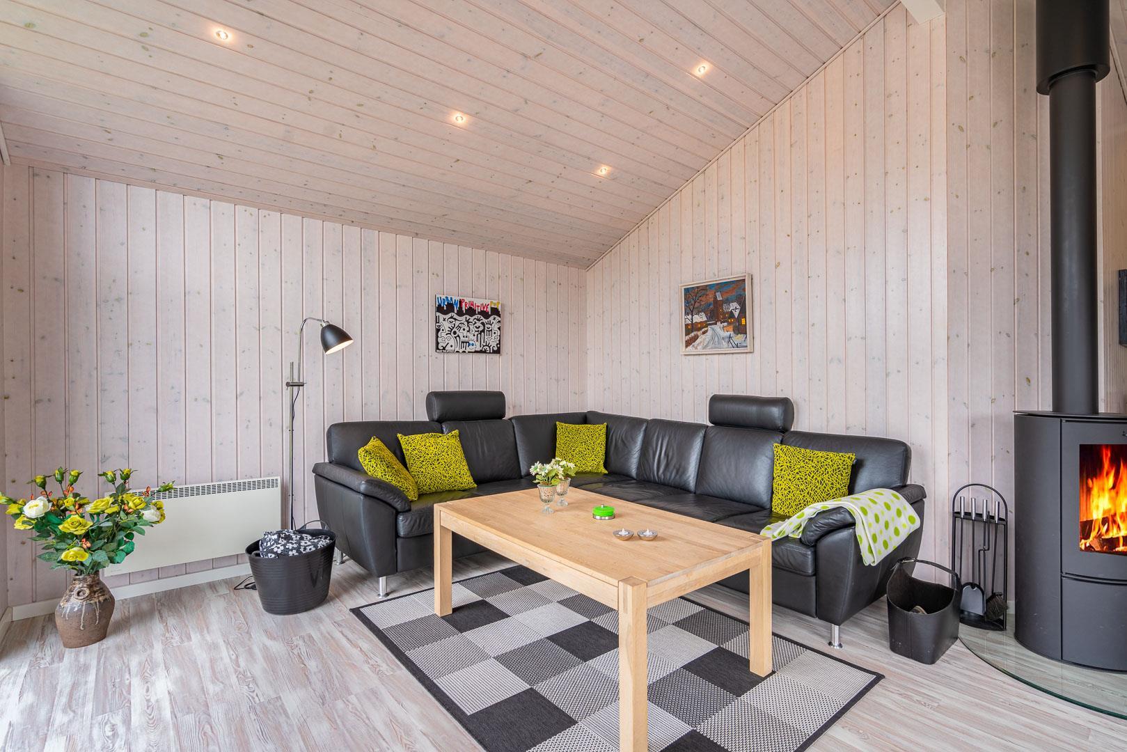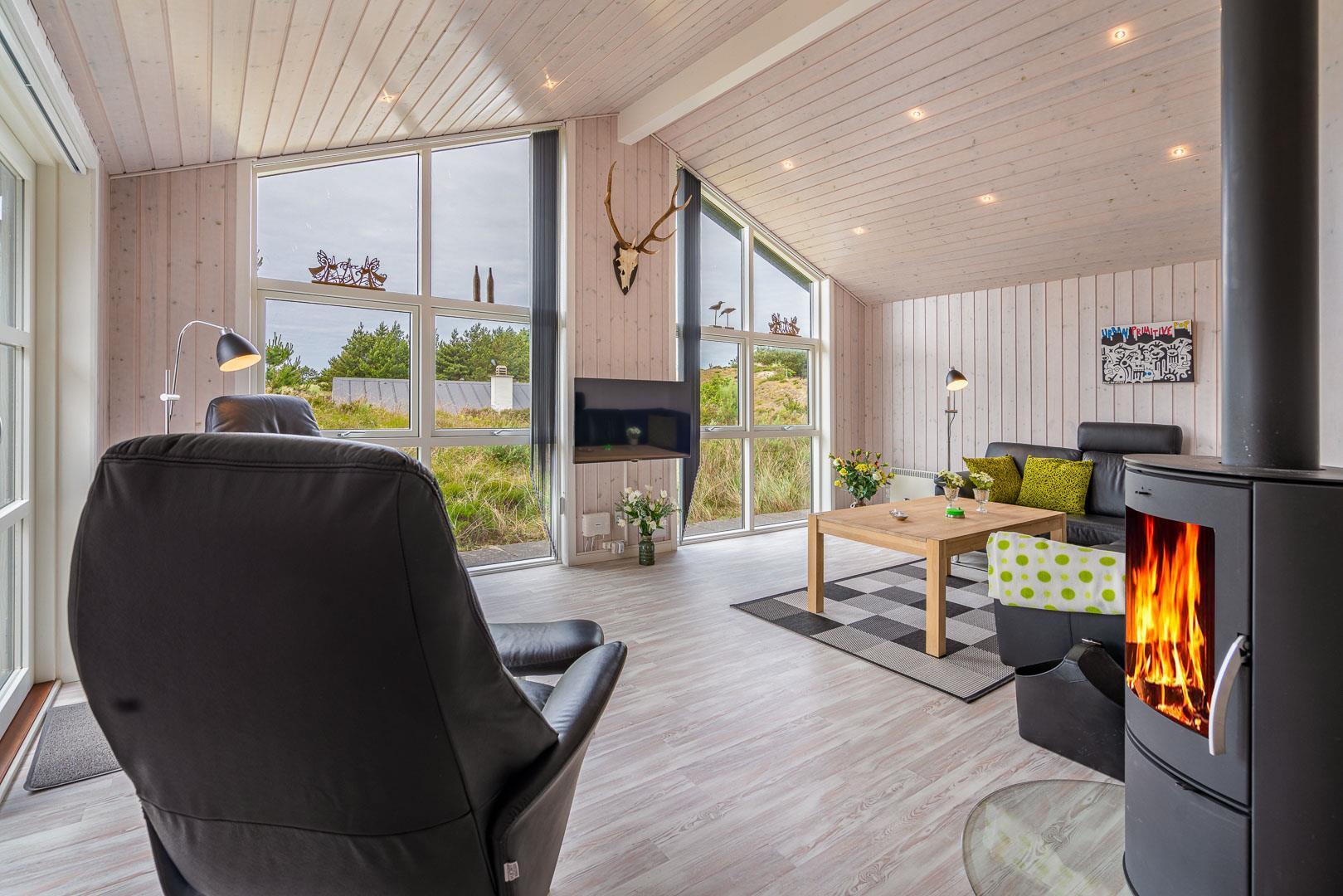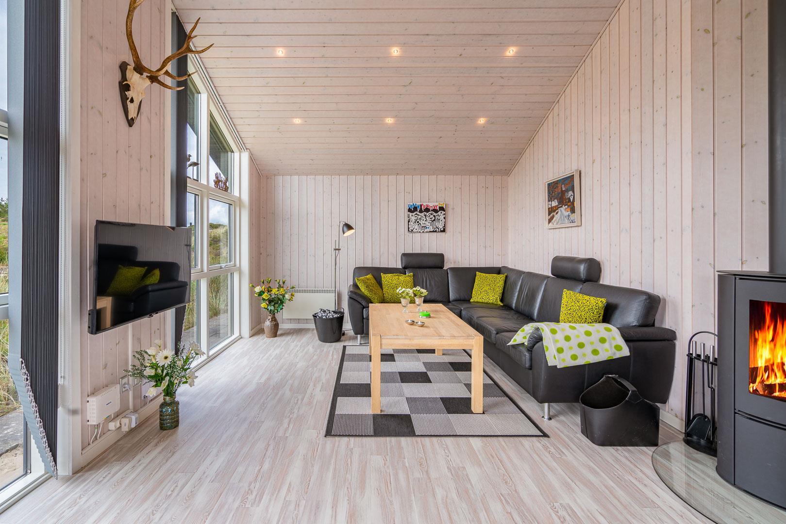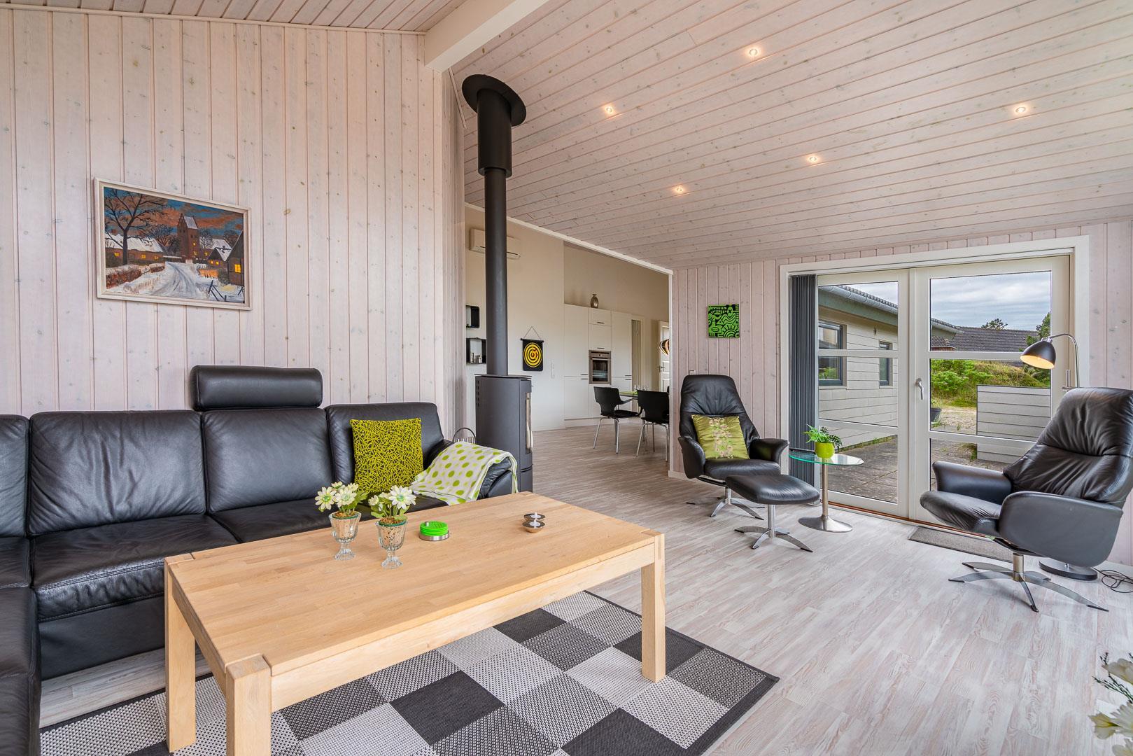 Sommerhuset byder på en rummelig og hyggelig stue, der er integreret med det moderne køkken. Her finder du en brændeovn, der skaber en varm og indbydende atmosfære i begge rum – perfekt til hyggelige aftener med dem, du holder af.