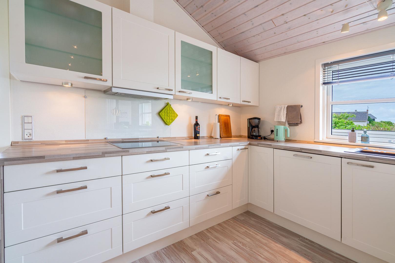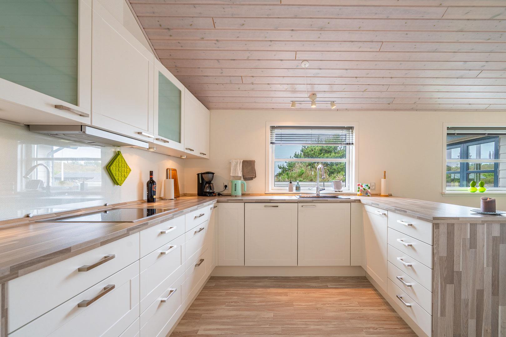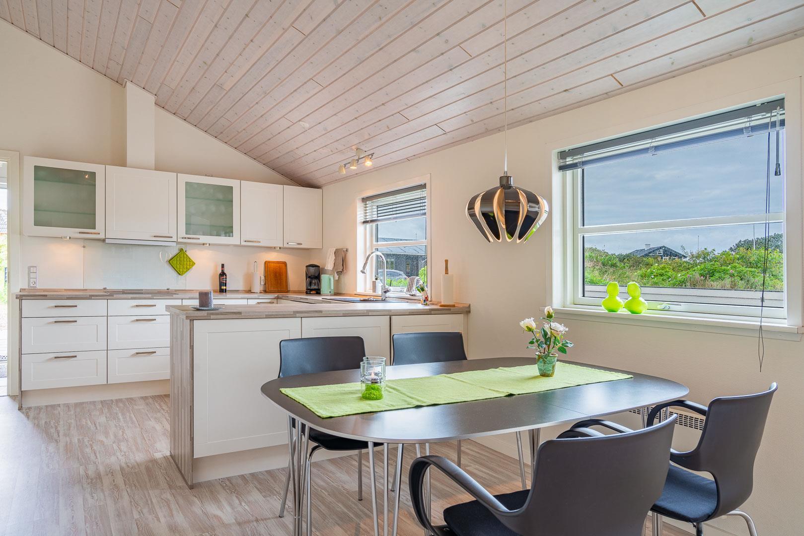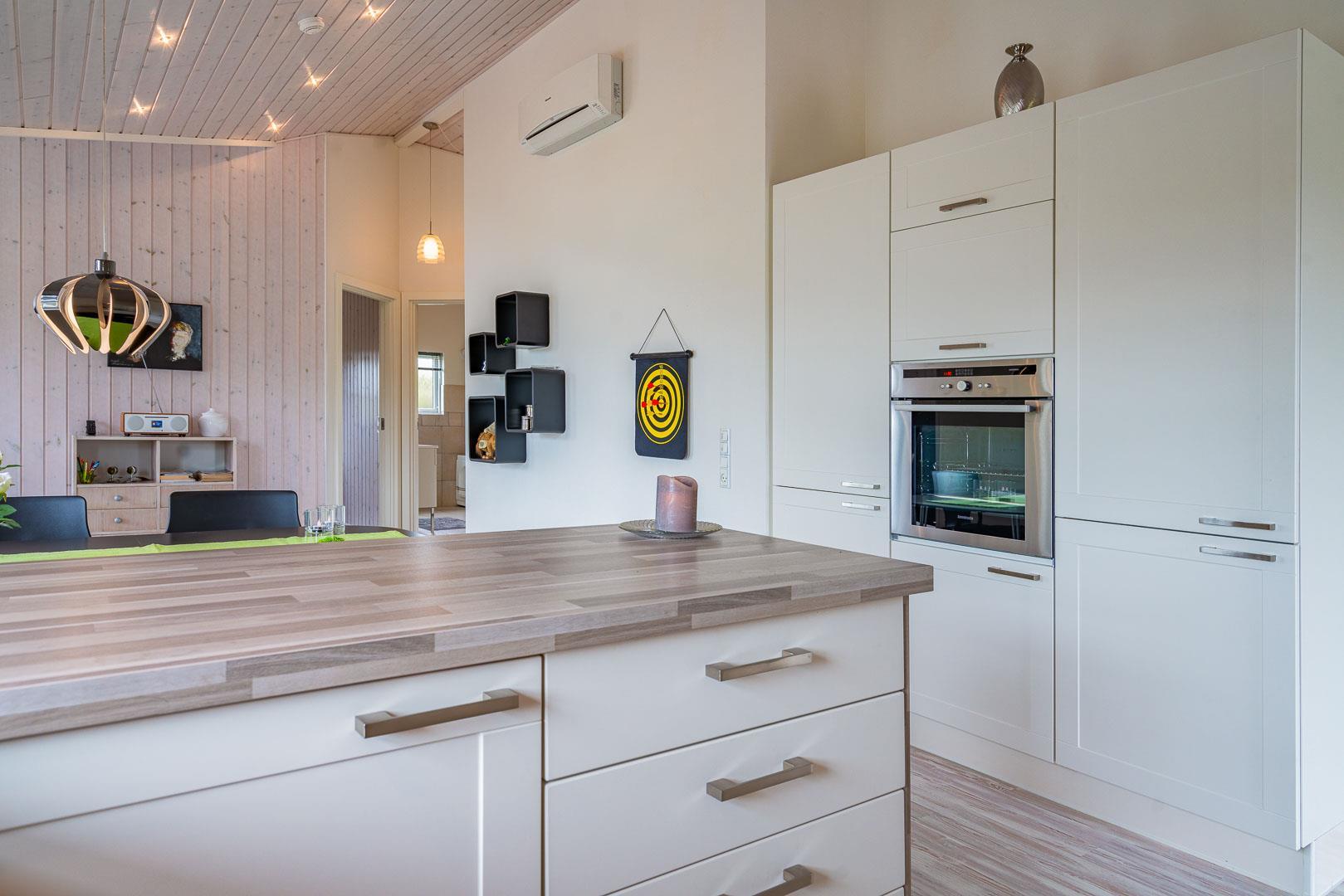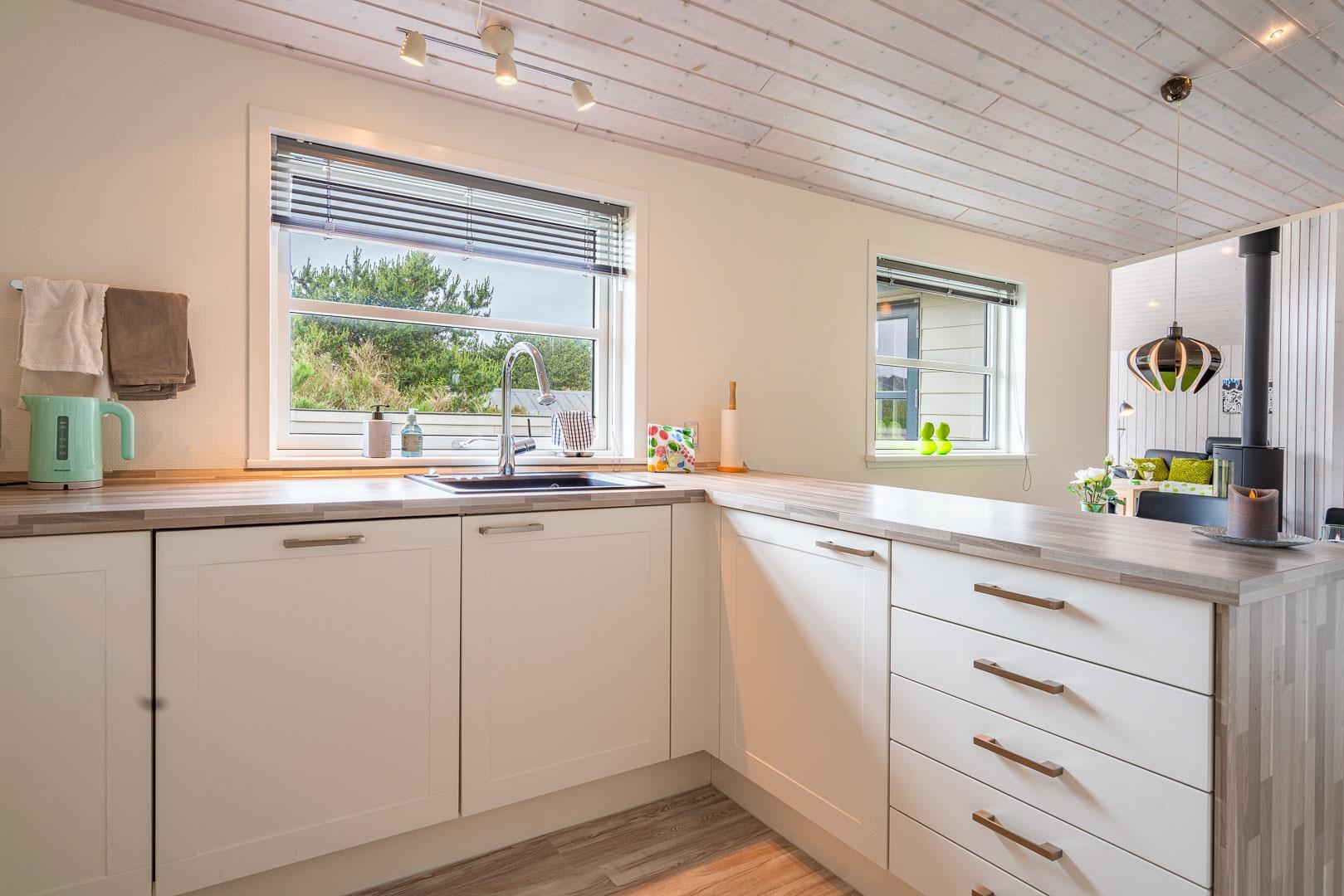 Sommerhuset byder på en rummelig og hyggelig stue, der er integreret med det moderne køkken. Her finder du en brændeovn, der skaber en varm og indbydende atmosfære i begge rum – perfekt til hyggelige aftener med dem, du holder af.