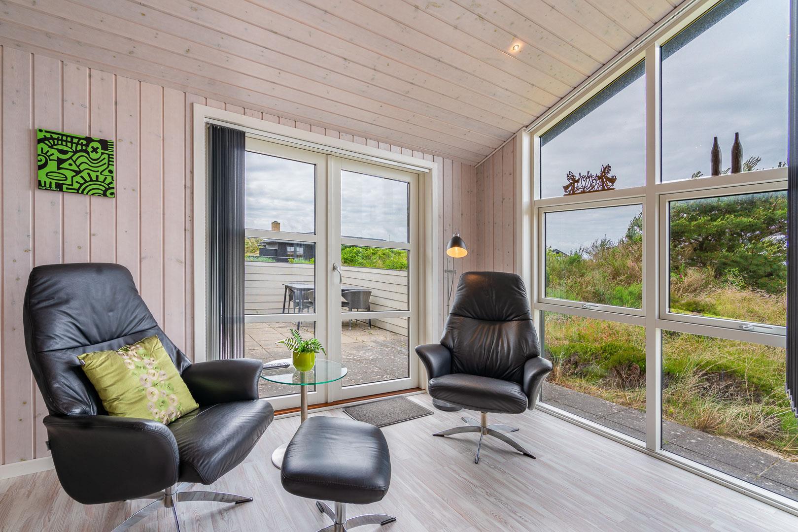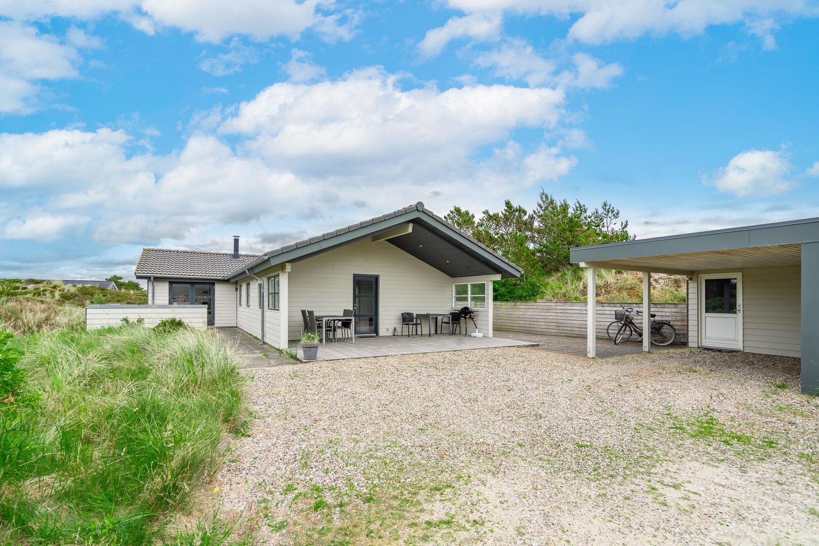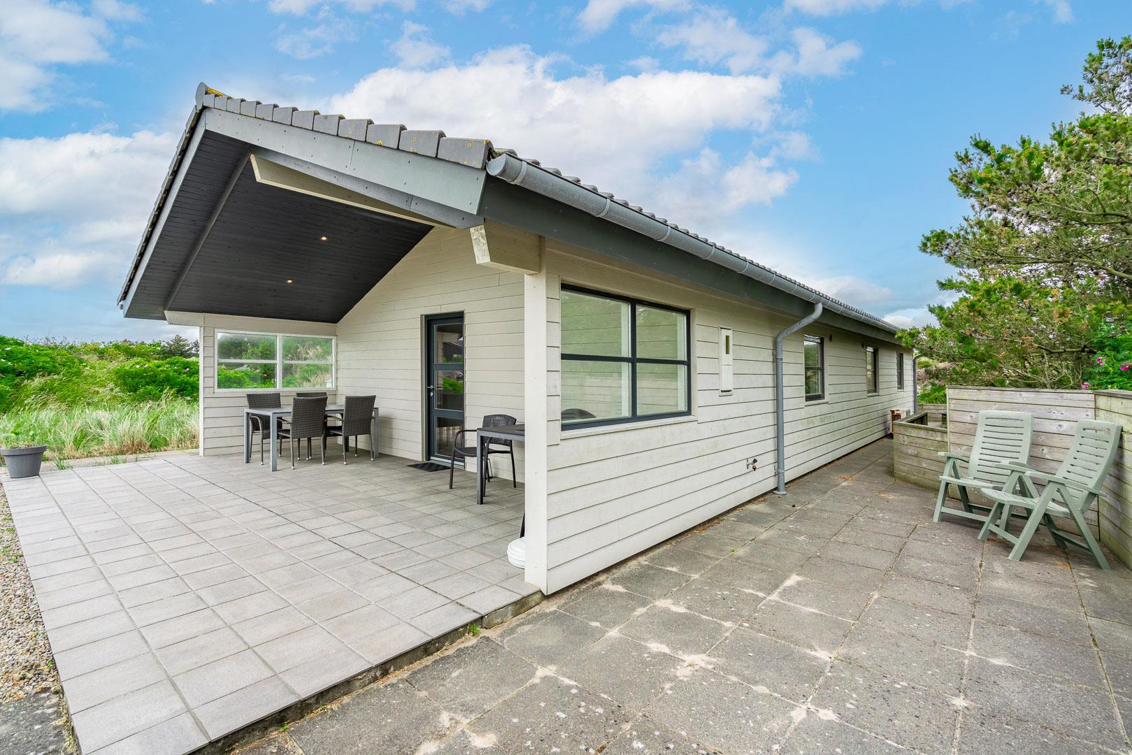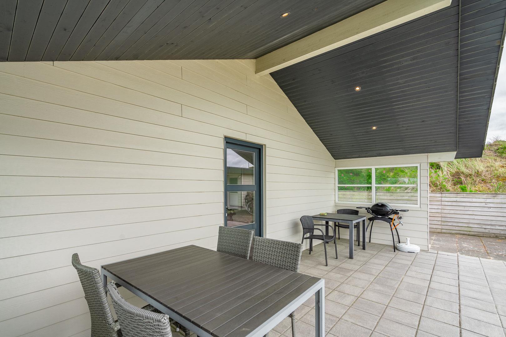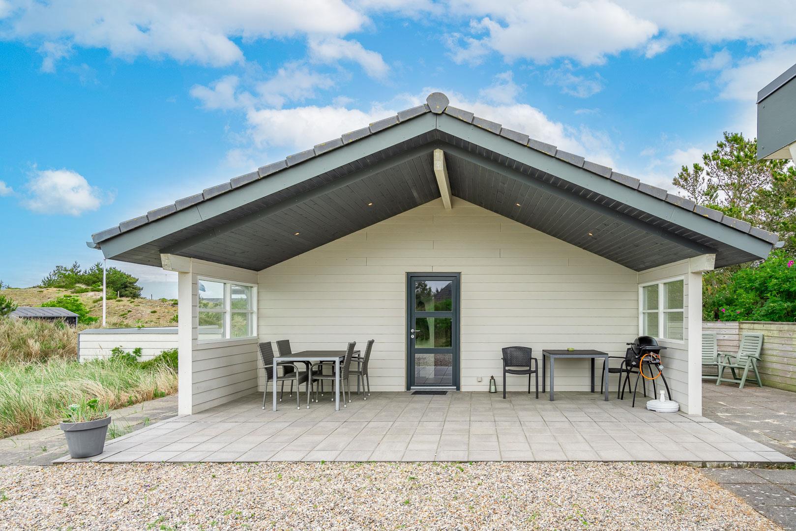 Rundt om sommerhuset finder du den skønneste natur og to dejlige terrasser, hvoraf den ene er overdækket. Her kan du nyde din morgenkaffe i ro og mag eller tilbringe aftenerne i hyggeligt selskab.