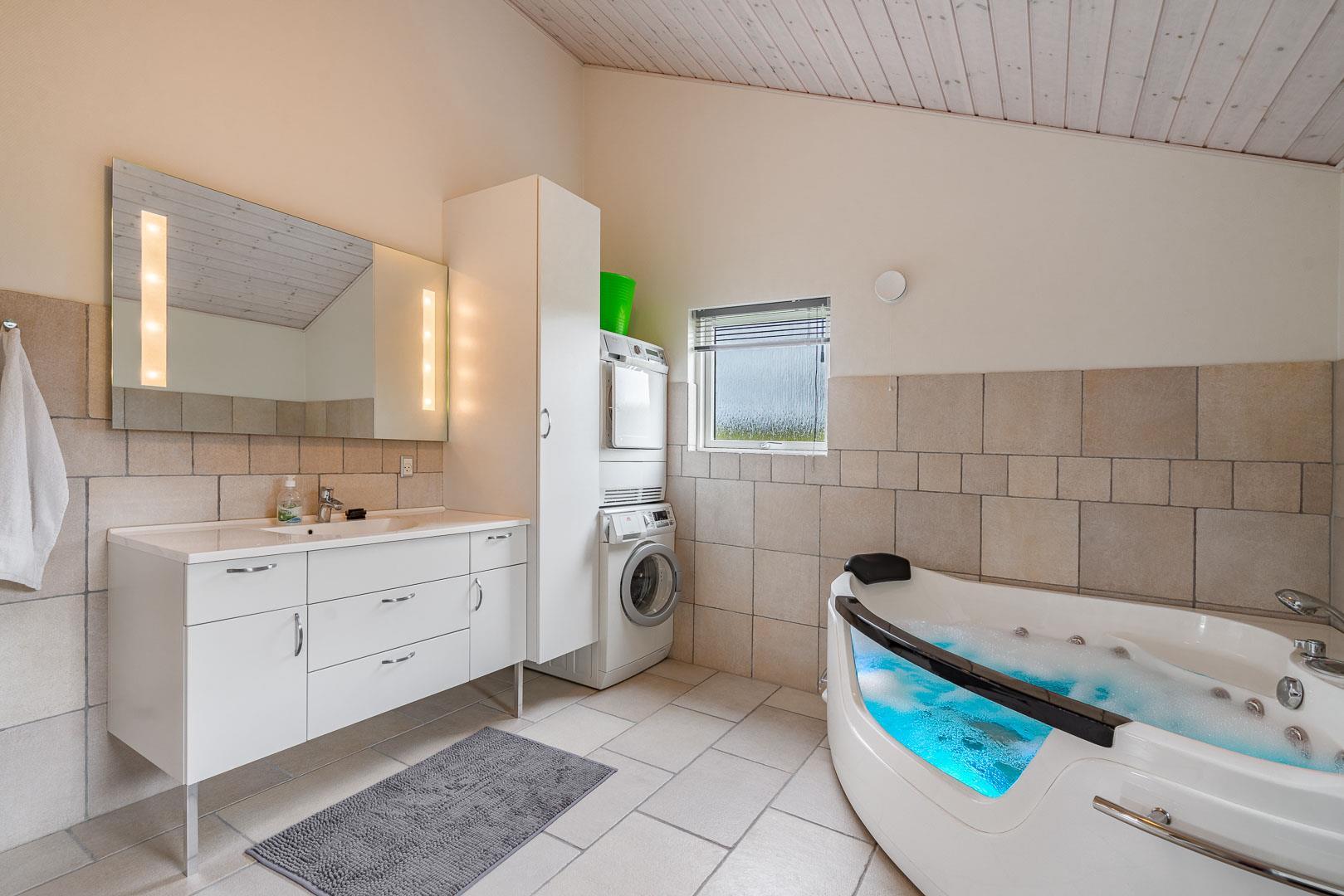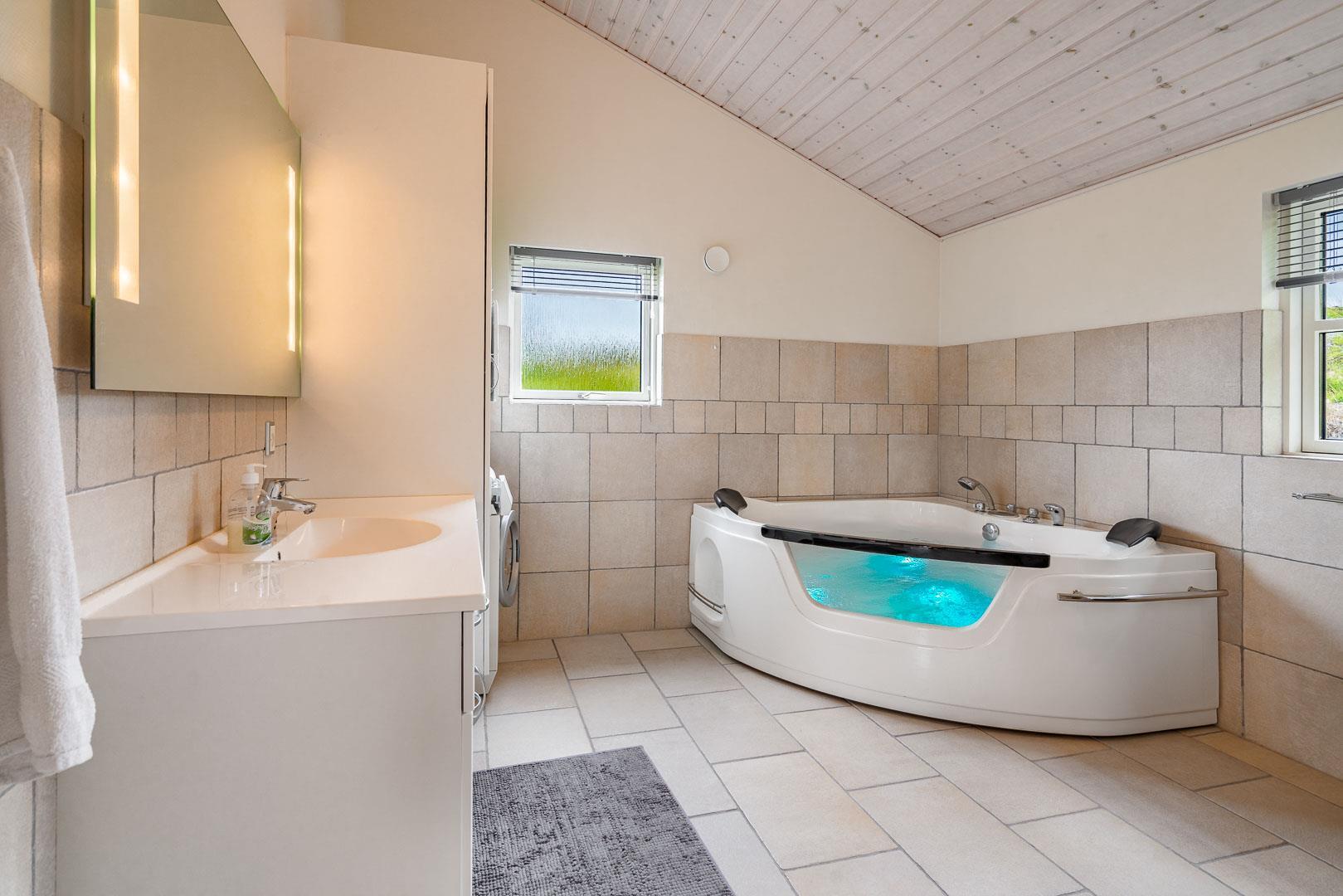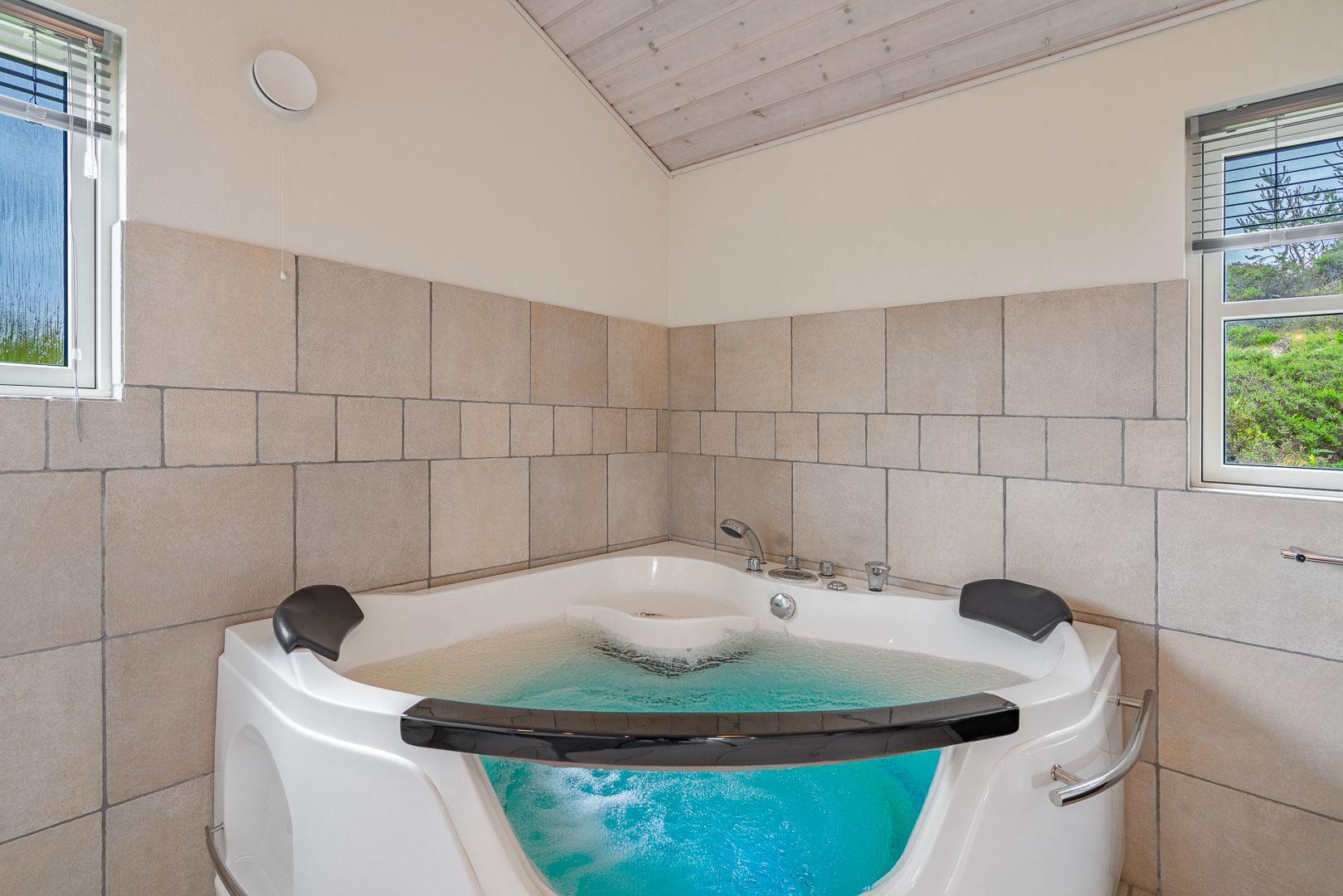 Det store badeværelse er udstyret med en indbydende spa, hvor du kan slappe af og nyde ferien fuldt ud.