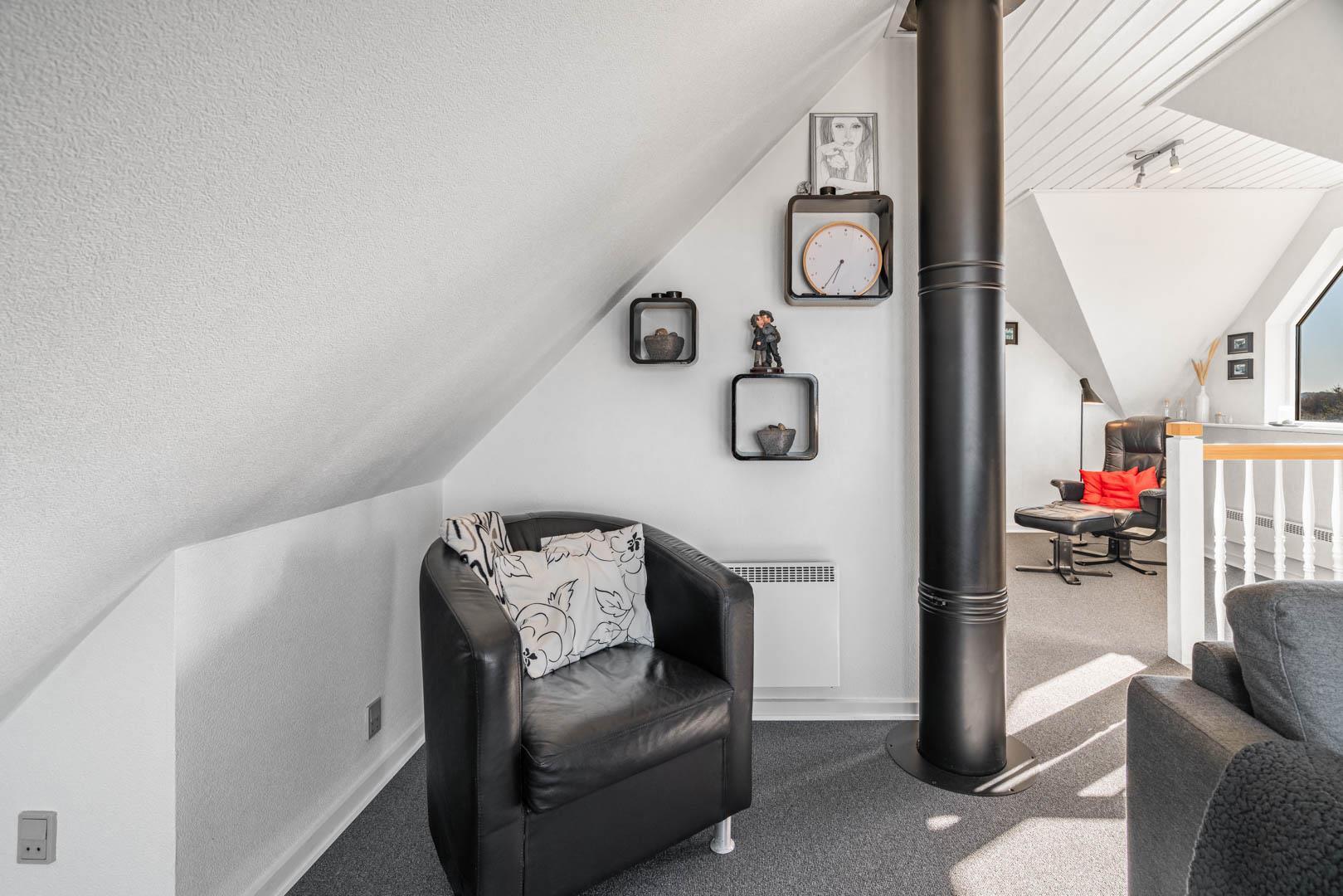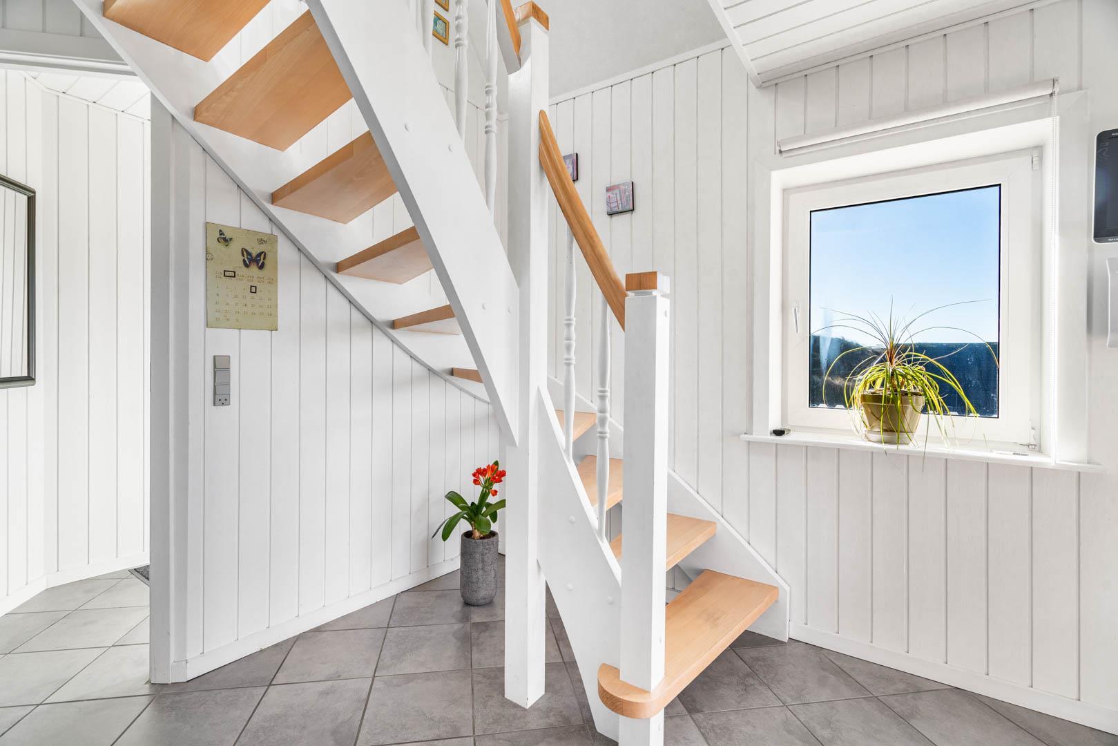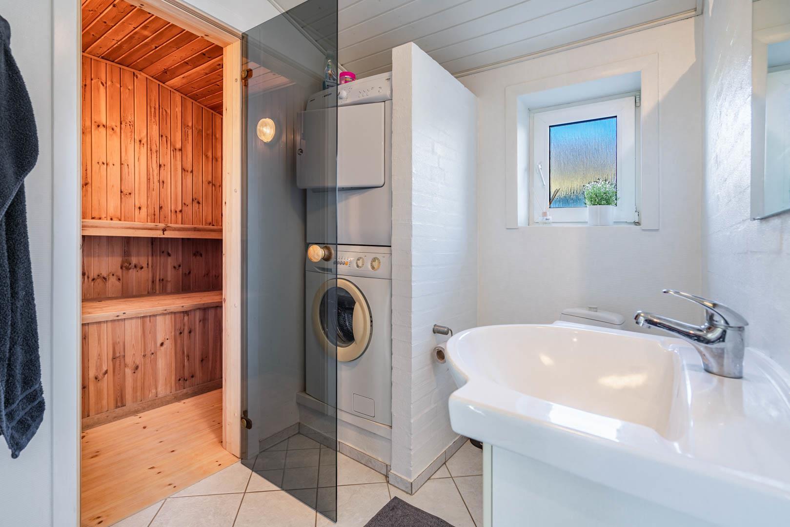 Madlavning, brætspil og hygge vil foregå i det skønne opholdsrum, som har lækkert køkken og en spisestue med en fabelagtig udsigt gennem kæmpestore glaspartier. Og når aftenen falder på, kan I nyde en kold drink i den store fempersoners spa eller med et dampbad inden sengetid. Foruden wellnessafdelingens bruseniche og toilet er der også et ekstra badeværelse på første sal.