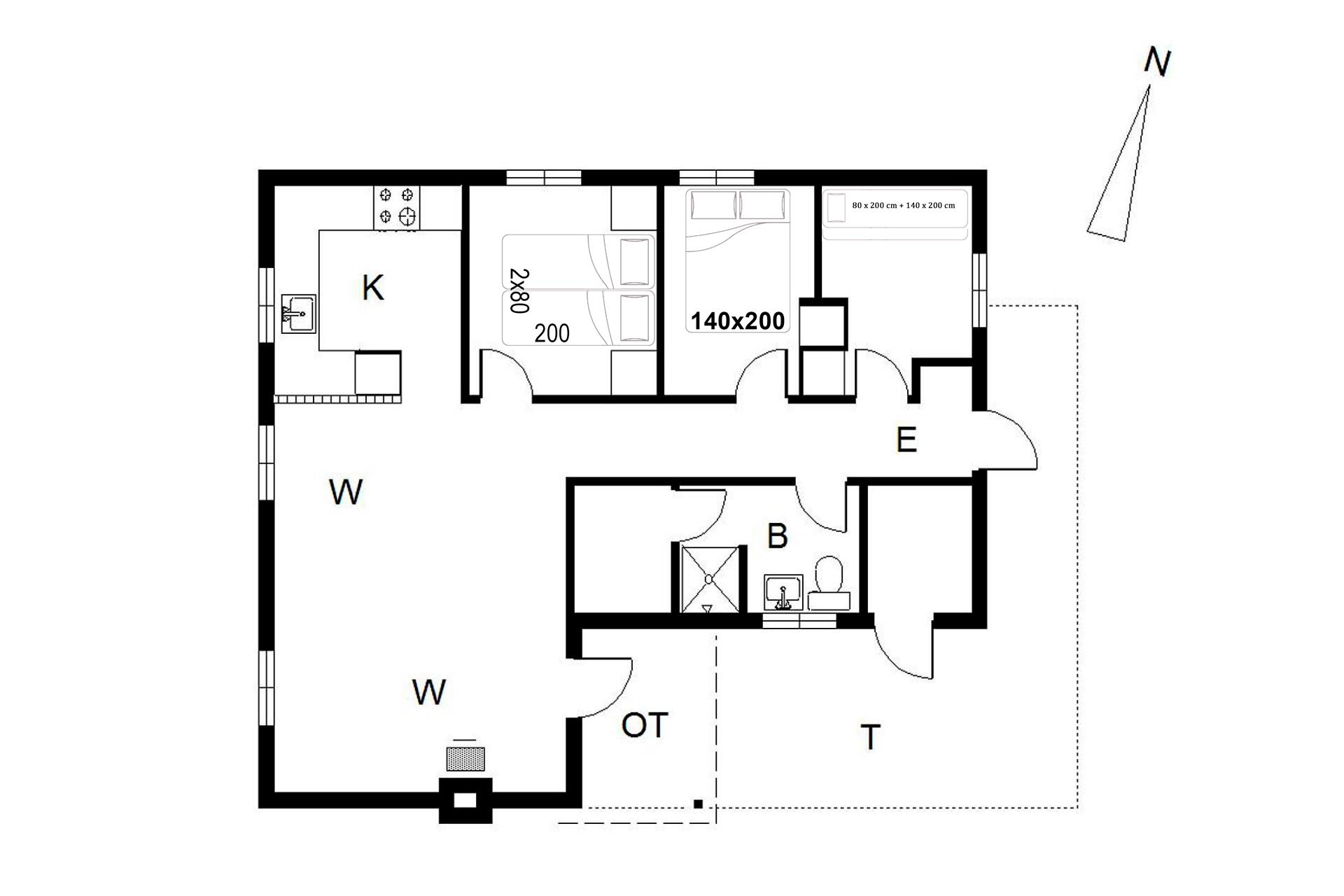 Sengestørrelser: 1 dobbeltseng med 2 madrasser 80 x 200 cm + 1 dobbeltseng 140 x 200 cm + 1 køjeseng med øverste køje på 80 x 200 cm og nederste køje på 140 x 200 cm.