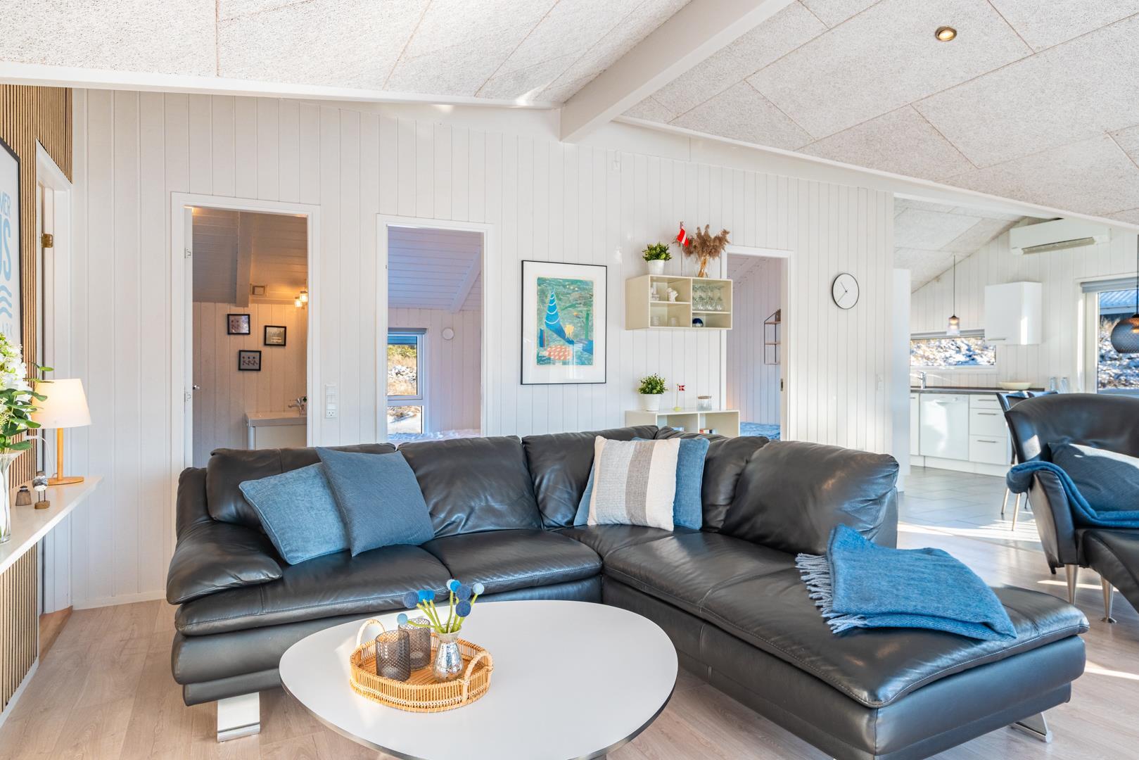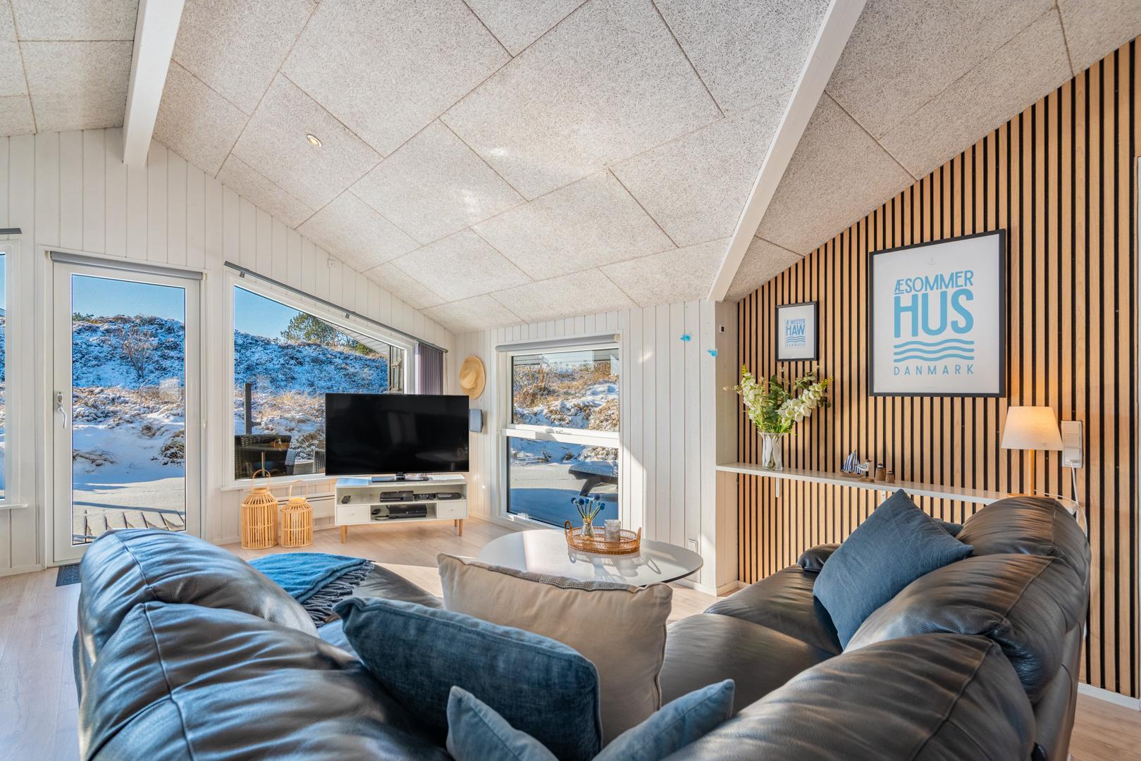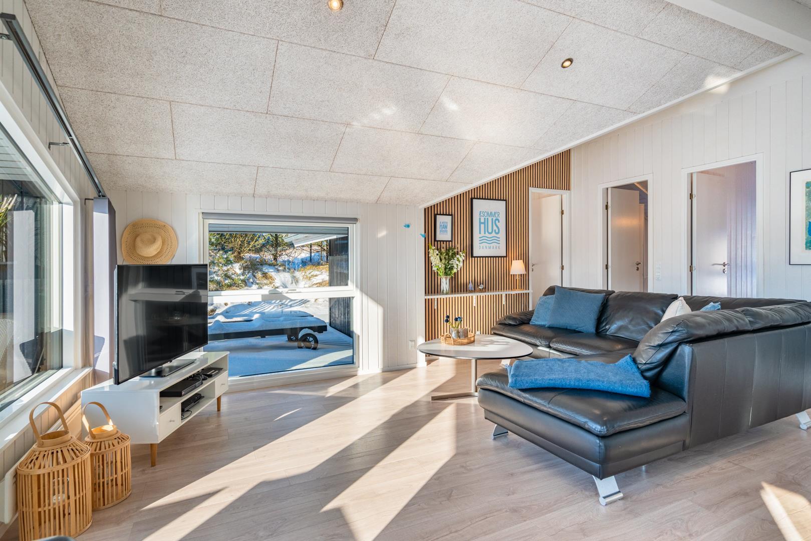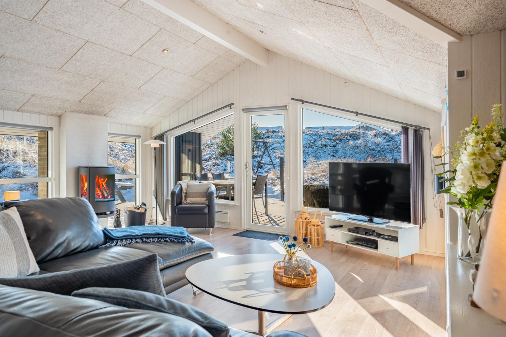 Stuen er sommerhusets naturlige samlingspunkt. Efter en dag ved Vesterhavet kan du slappe af her, nyde en filmaften eller bare finde ro. Varmepumpen sikrer et behageligt indeklima hele året rundt.