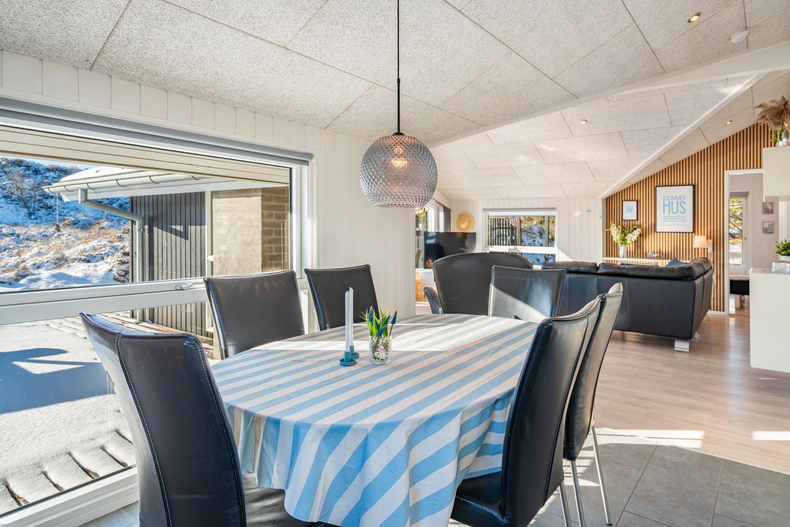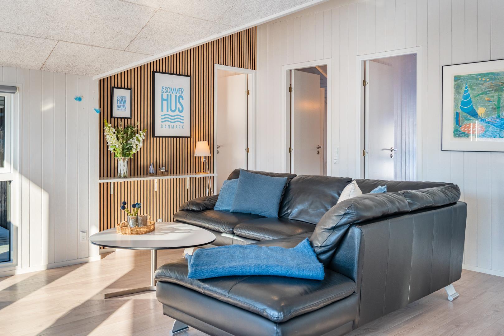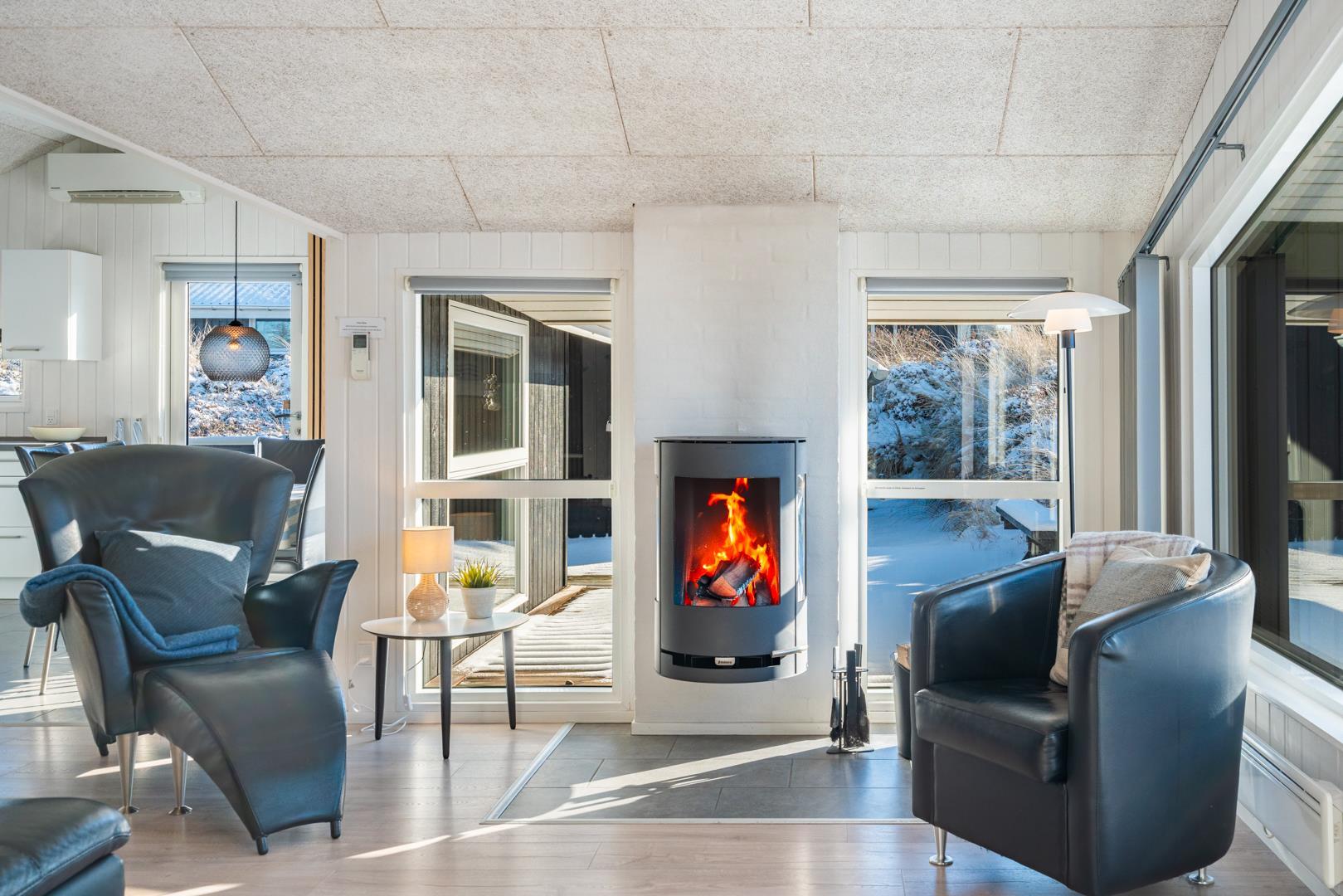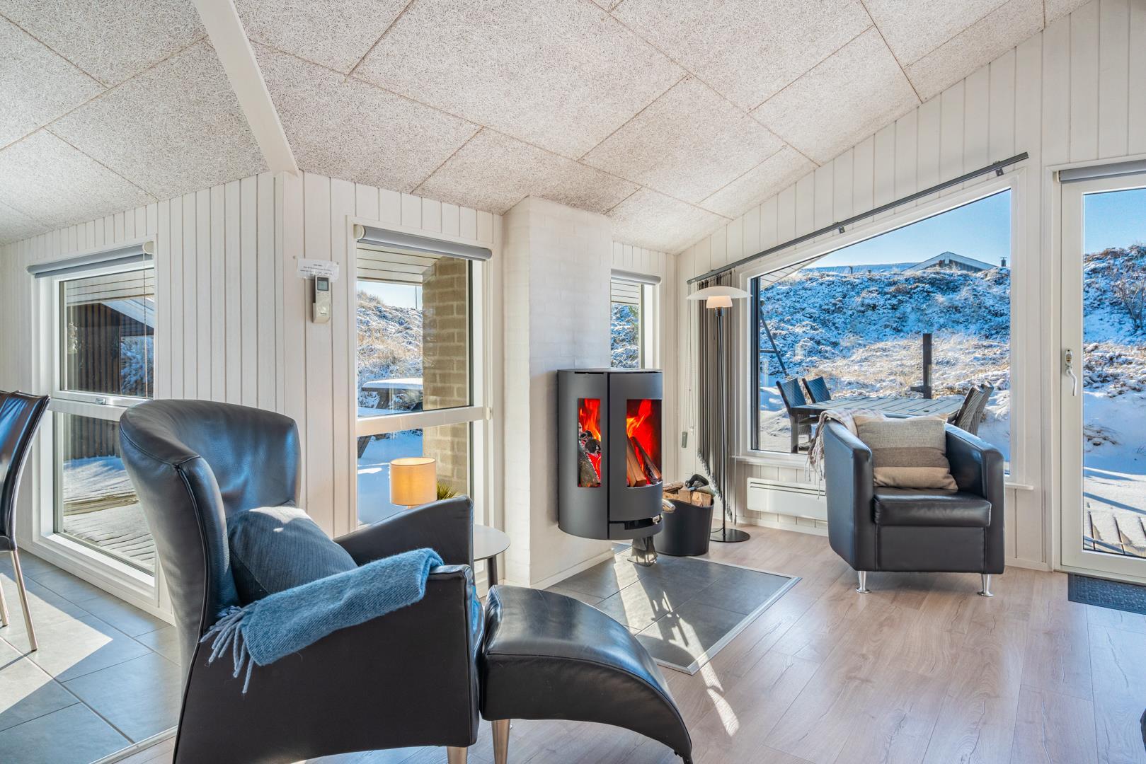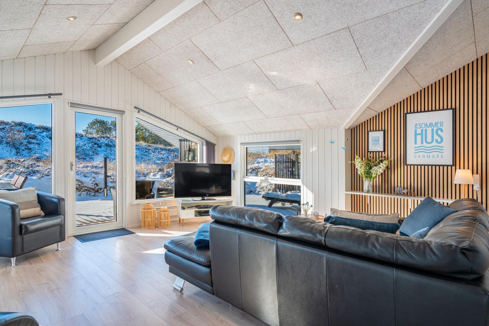 Stuen er sommerhusets naturlige samlingspunkt. Efter en dag ved Vesterhavet kan du slappe af her, nyde en filmaften eller bare finde ro. Varmepumpen sikrer et behageligt indeklima hele året rundt.