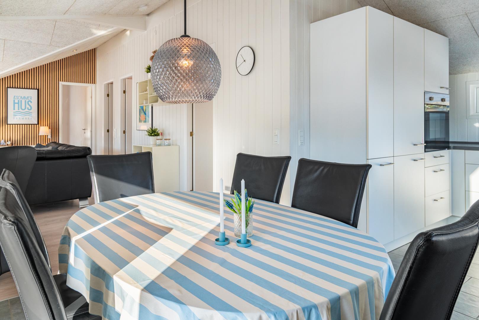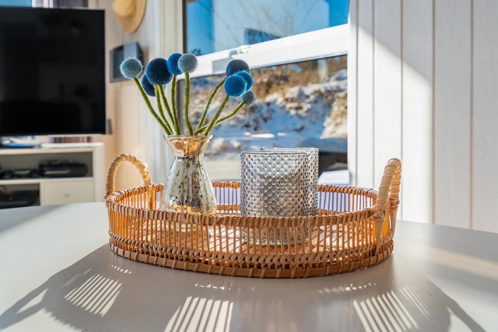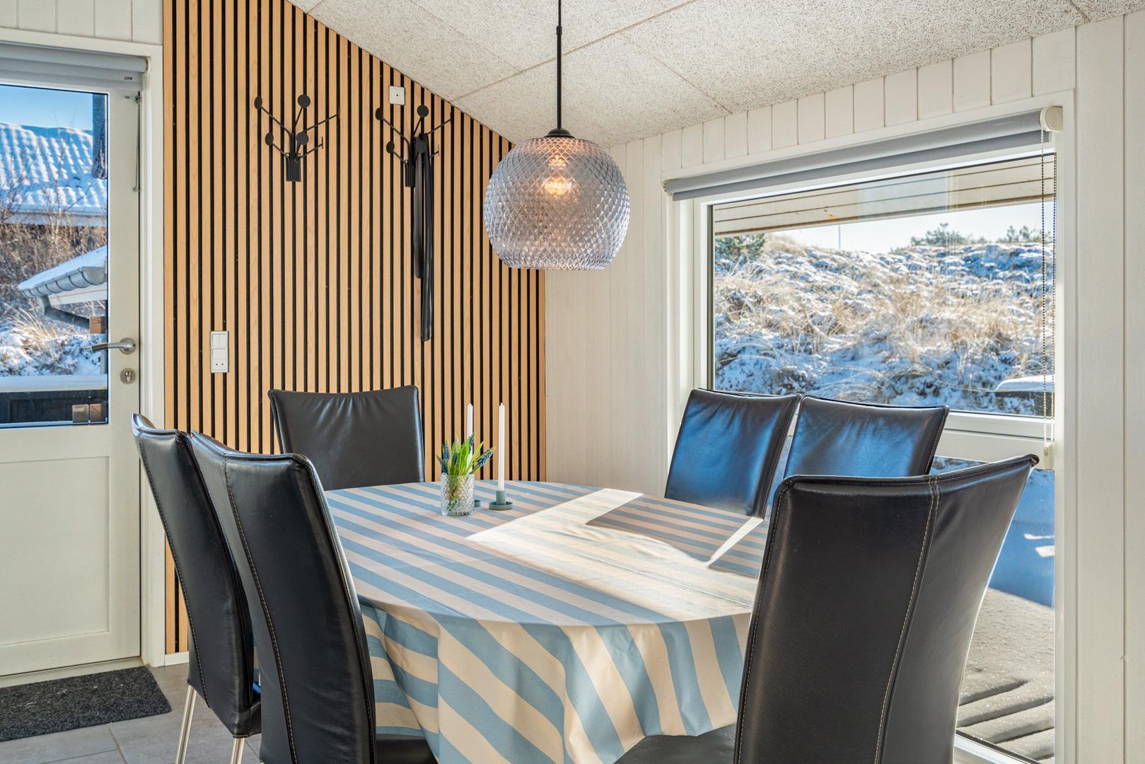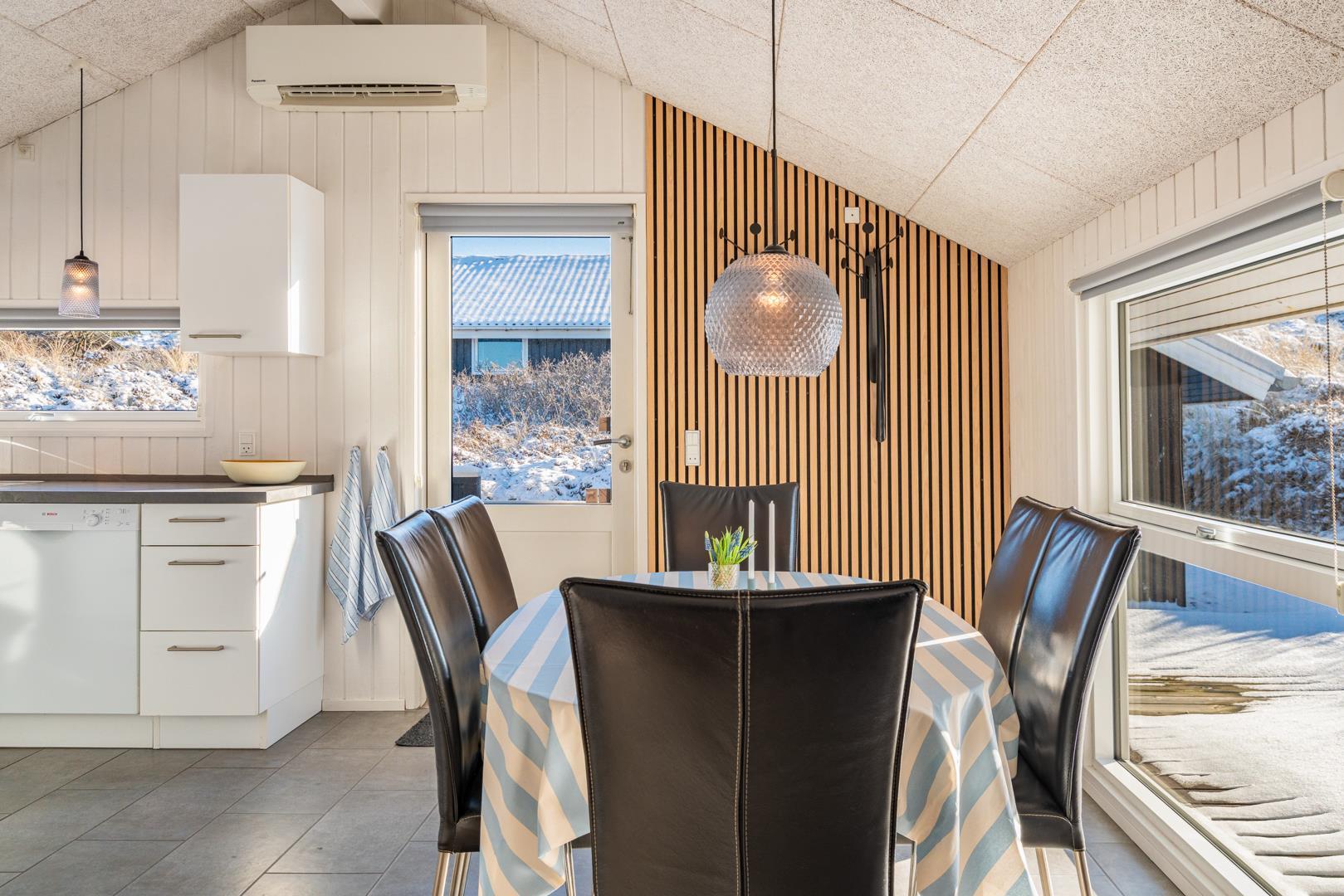 Stuen er sommerhusets naturlige samlingspunkt. Efter en dag ved Vesterhavet kan du slappe af her, nyde en filmaften eller bare finde ro. Varmepumpen sikrer et behageligt indeklima hele året rundt.