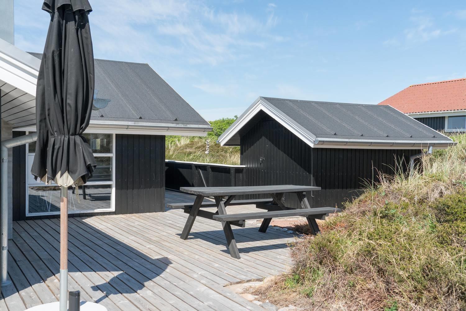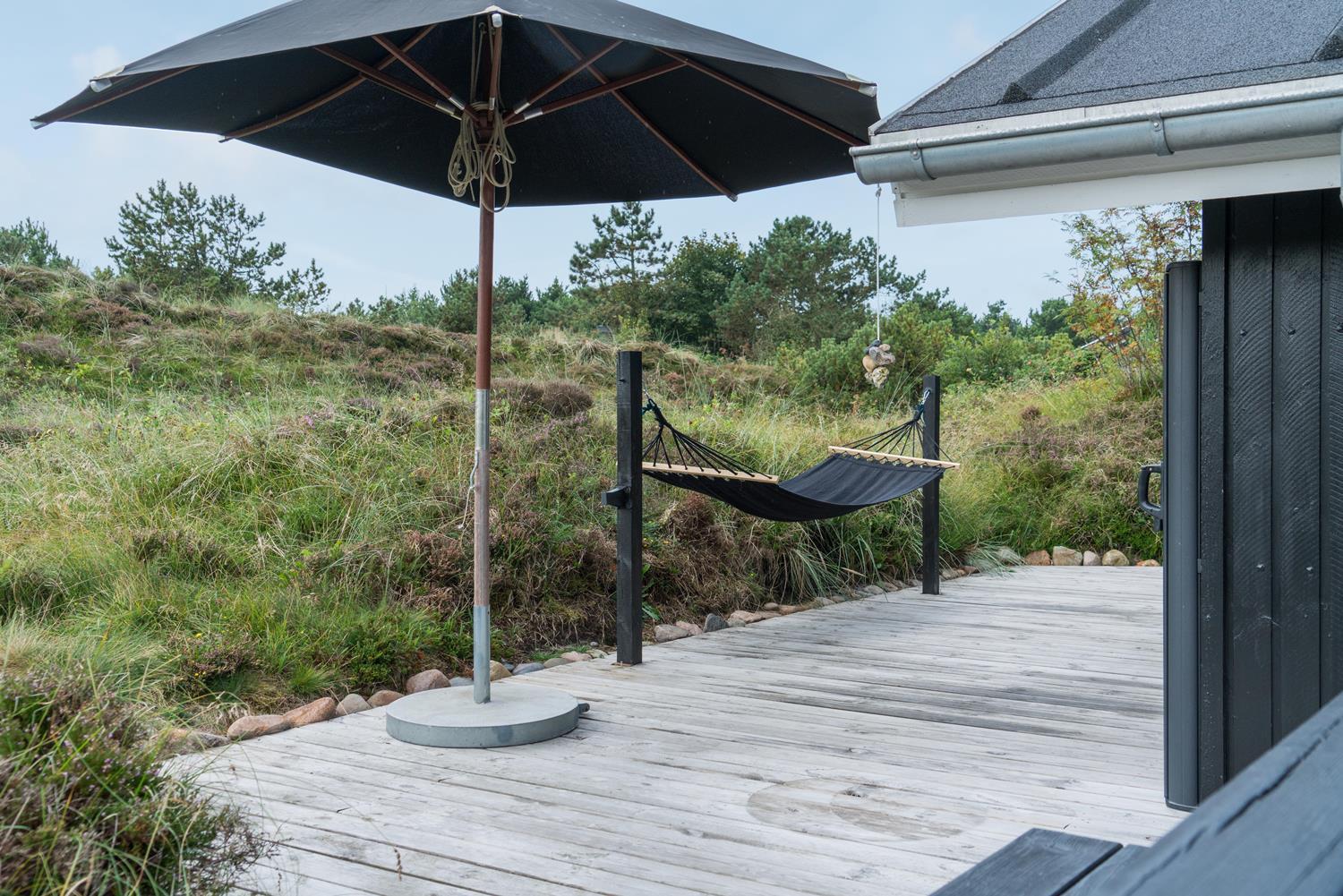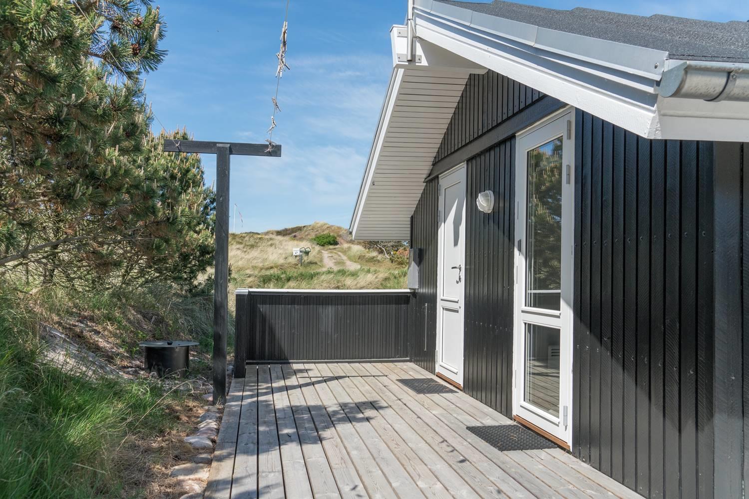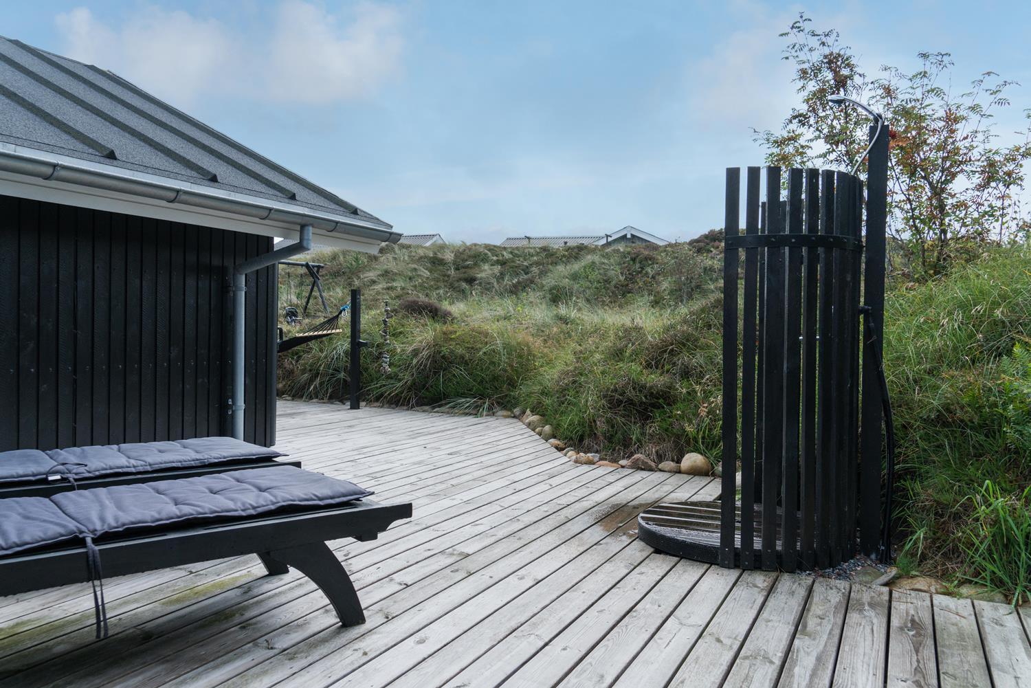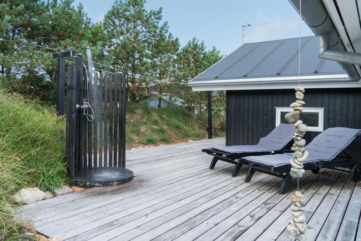 Også udendørs har dette sommerhus i Henne Strand optimale rammer for afslappende feriedage. På den overdækkede terrasse kan du nyde morgenmaden i læ for vinden eller tilbringe de lange sommeraftener i smukke omgivelser. Udebruseren giver en hurtig opfriskning efter en tur på stranden.