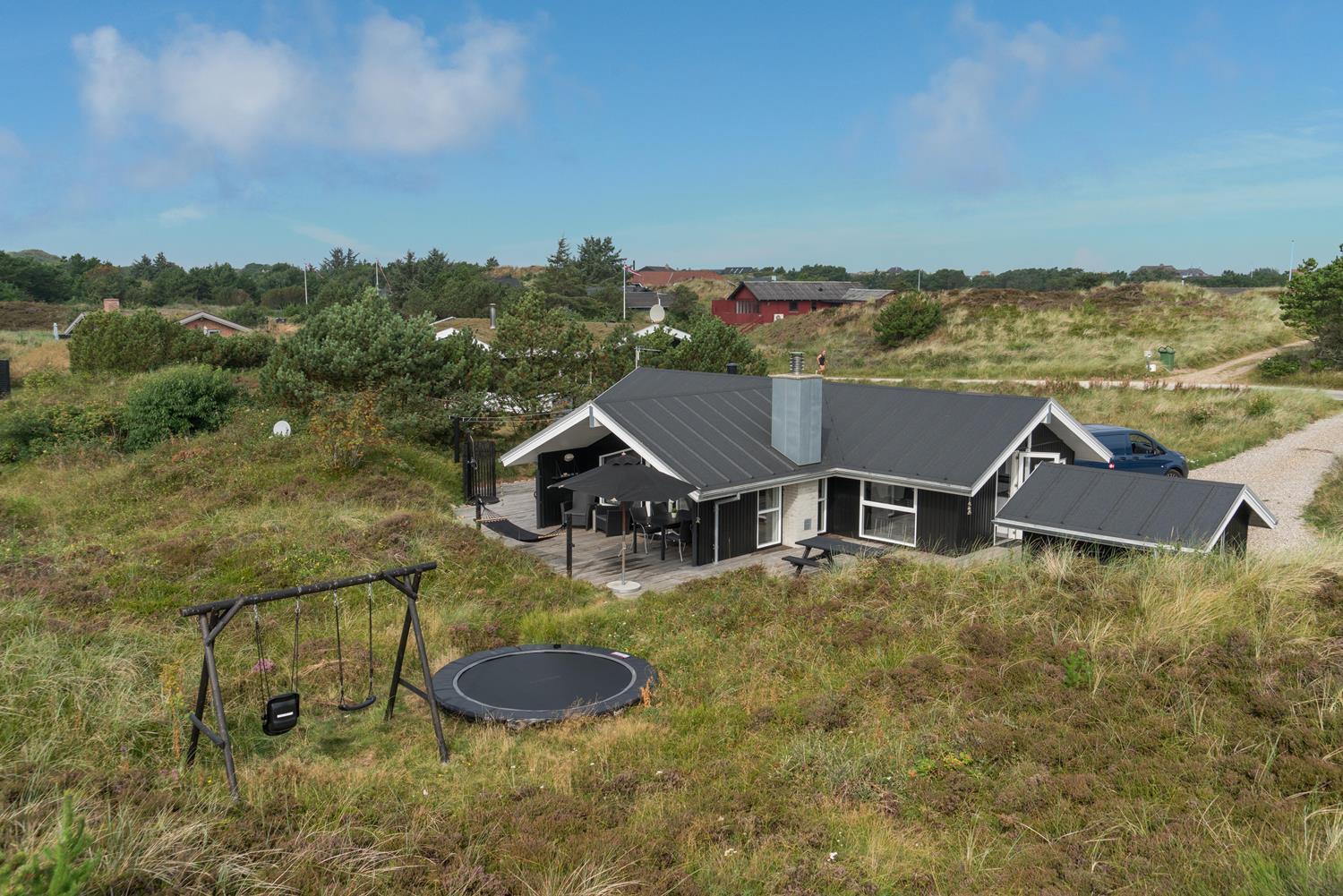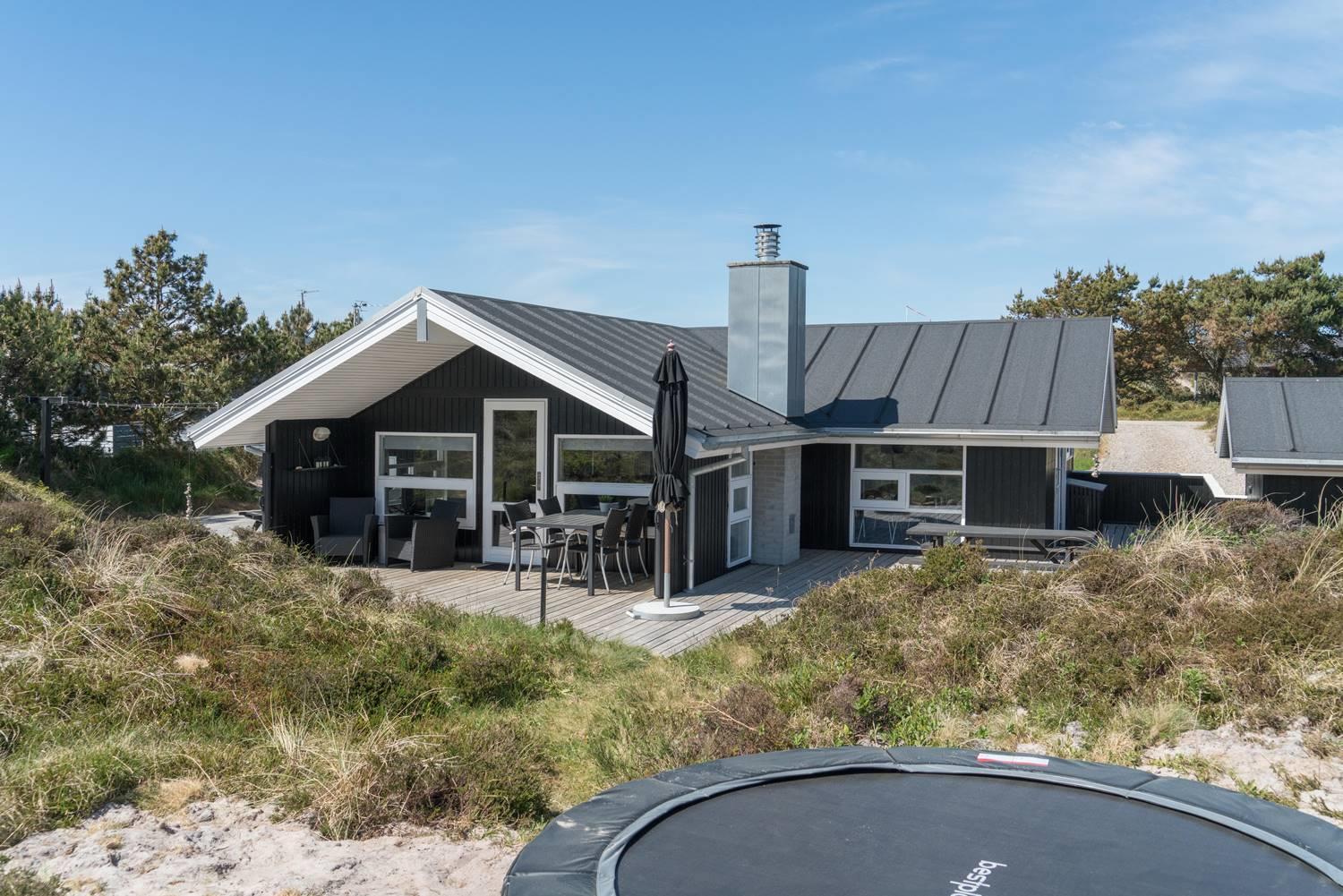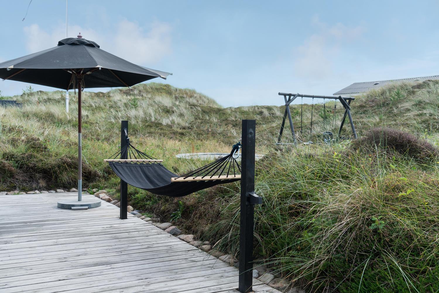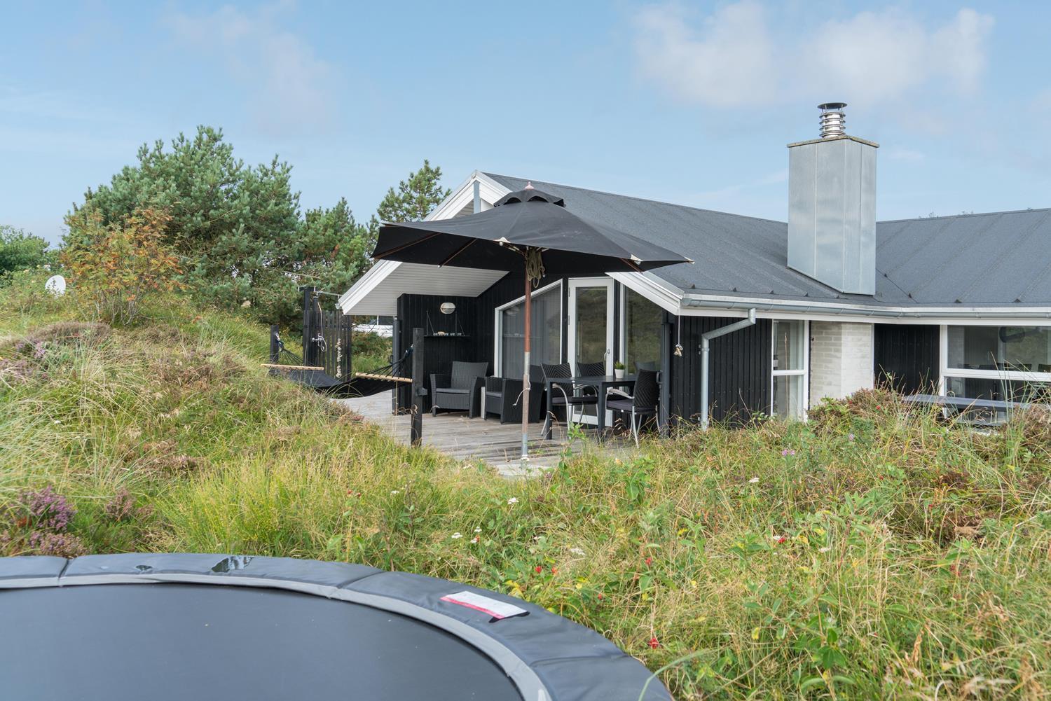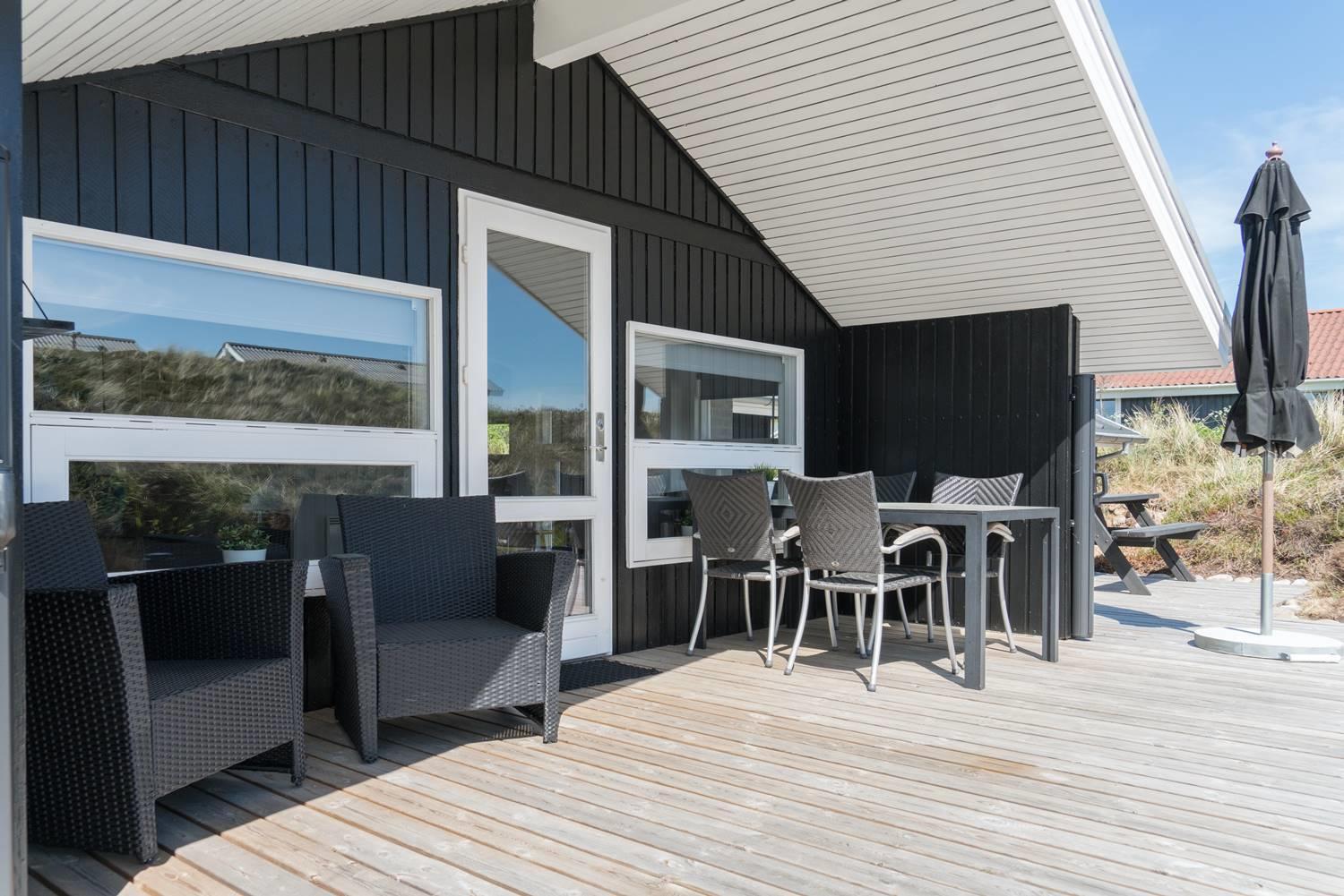 Også udendørs har dette sommerhus i Henne Strand optimale rammer for afslappende feriedage. På den overdækkede terrasse kan du nyde morgenmaden i læ for vinden eller tilbringe de lange sommeraftener i smukke omgivelser. Udebruseren giver en hurtig opfriskning efter en tur på stranden.