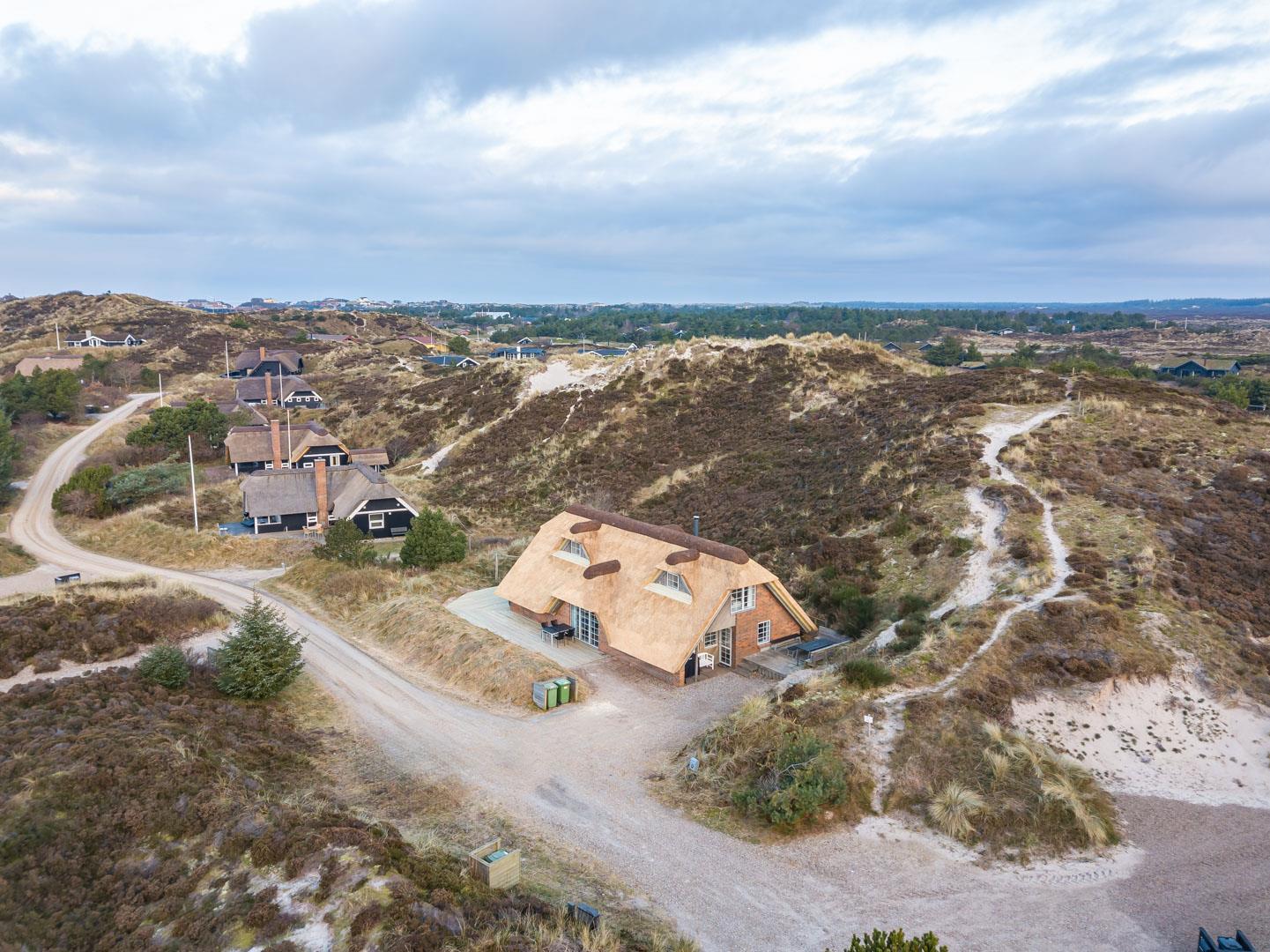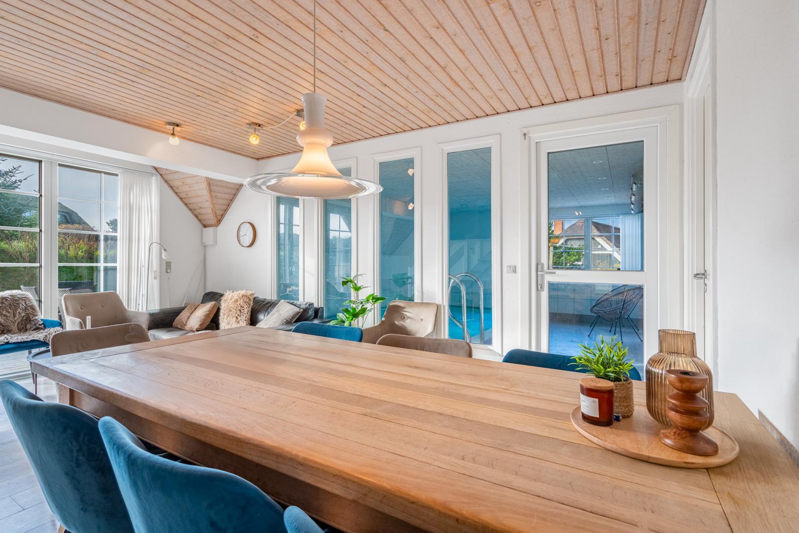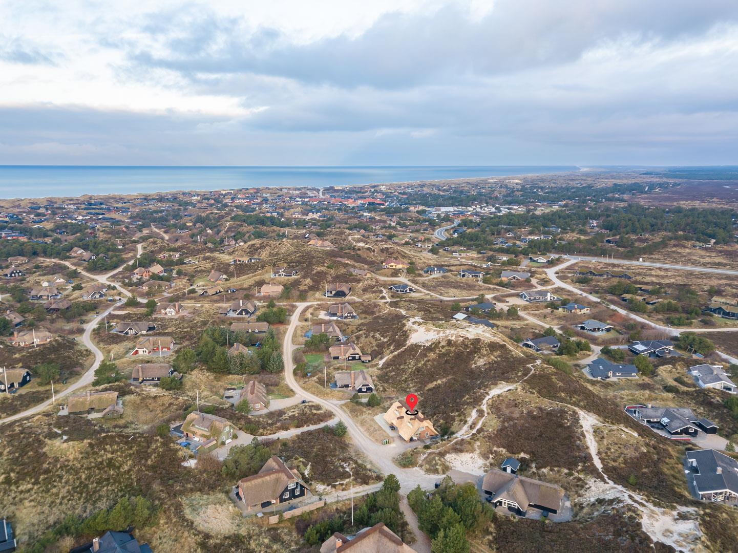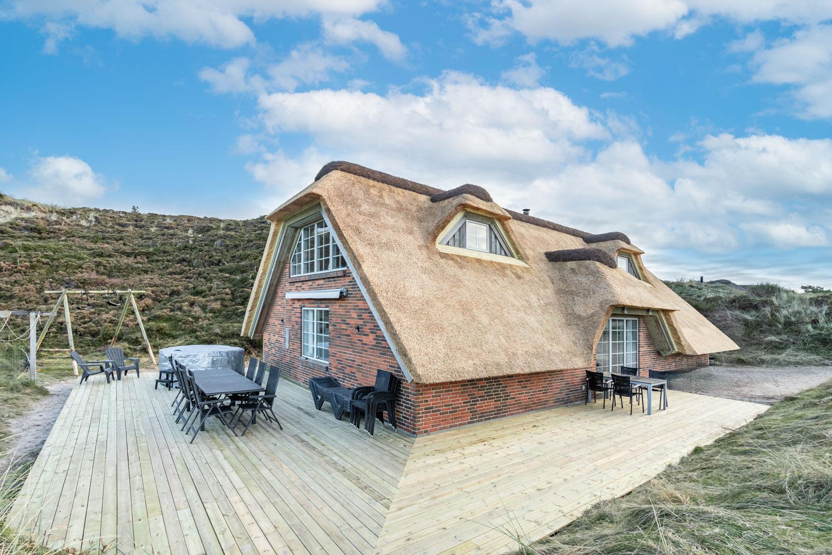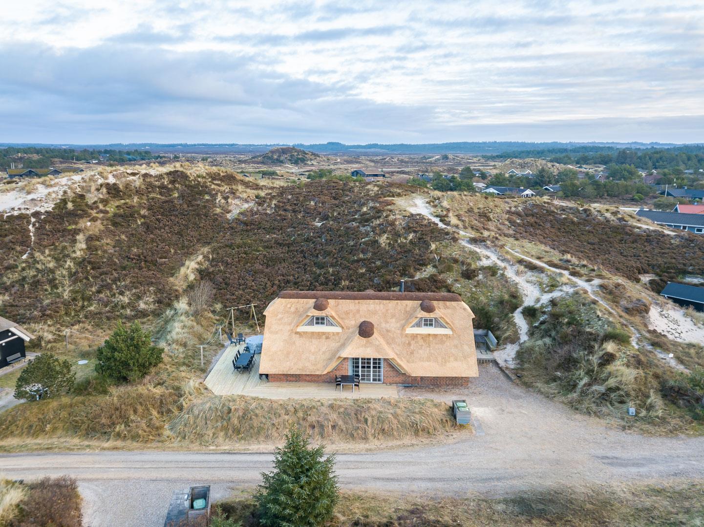 Smagfuldt og rigtig godt indrettet pool hus med stråtag og med en 70 kvm. stor træbelagt terrasse med standvands spa, beliggende på en større ugenert kuperet klitgrund i gåafstand fra Henne Strand by samt den sprudlende Vesterhav. Sommerhuset er praktisk indrettet med rummeligt køkken/alrum med brændeovn samt varmepumpe og herfra er der adgang til 1. salen med ekstra soverum og en unik panoramaudsigt over den flotte og rolige klitområde. Opsat bordfodbold. Pool området ligger i forbindelsen med køkken/alrummet, hvorfra alle aktiviteter i pool rummet kan følges igennem de store panorama vinduer.