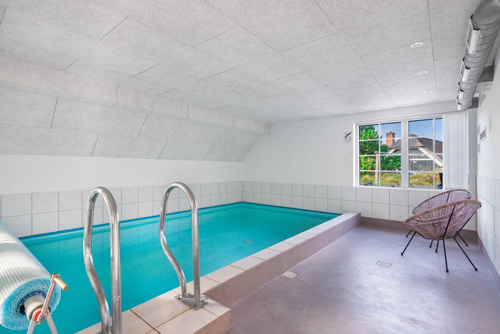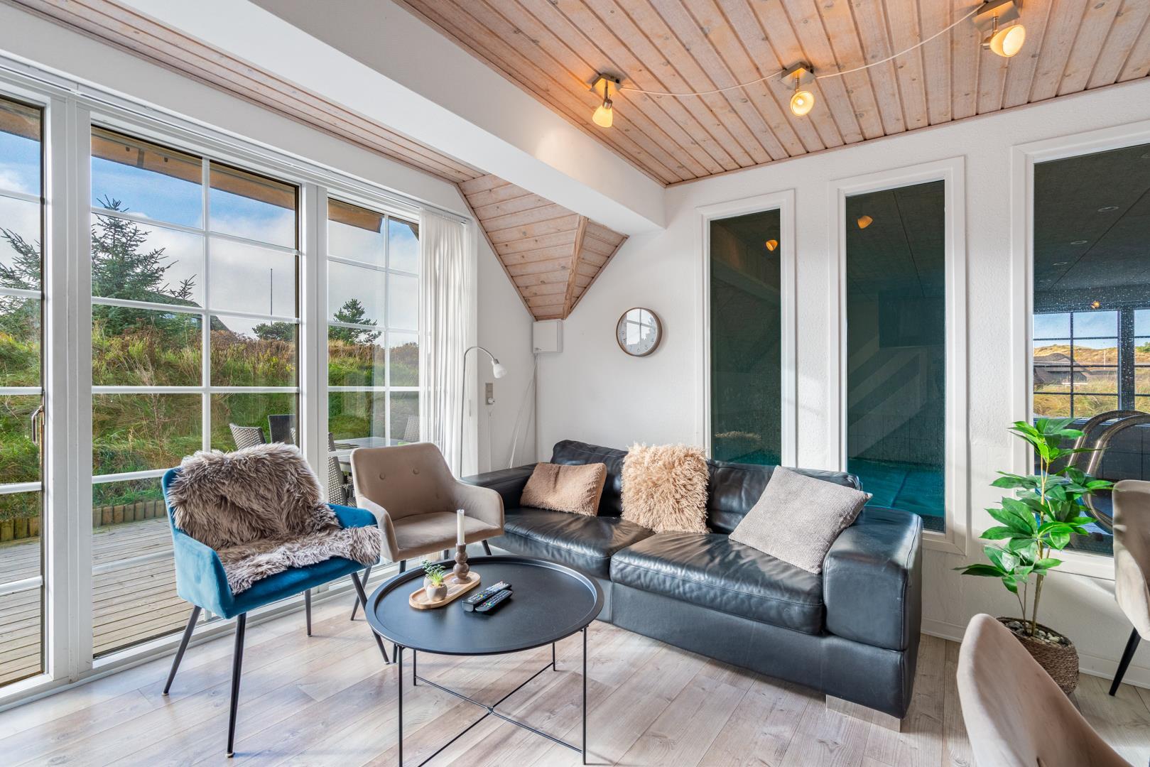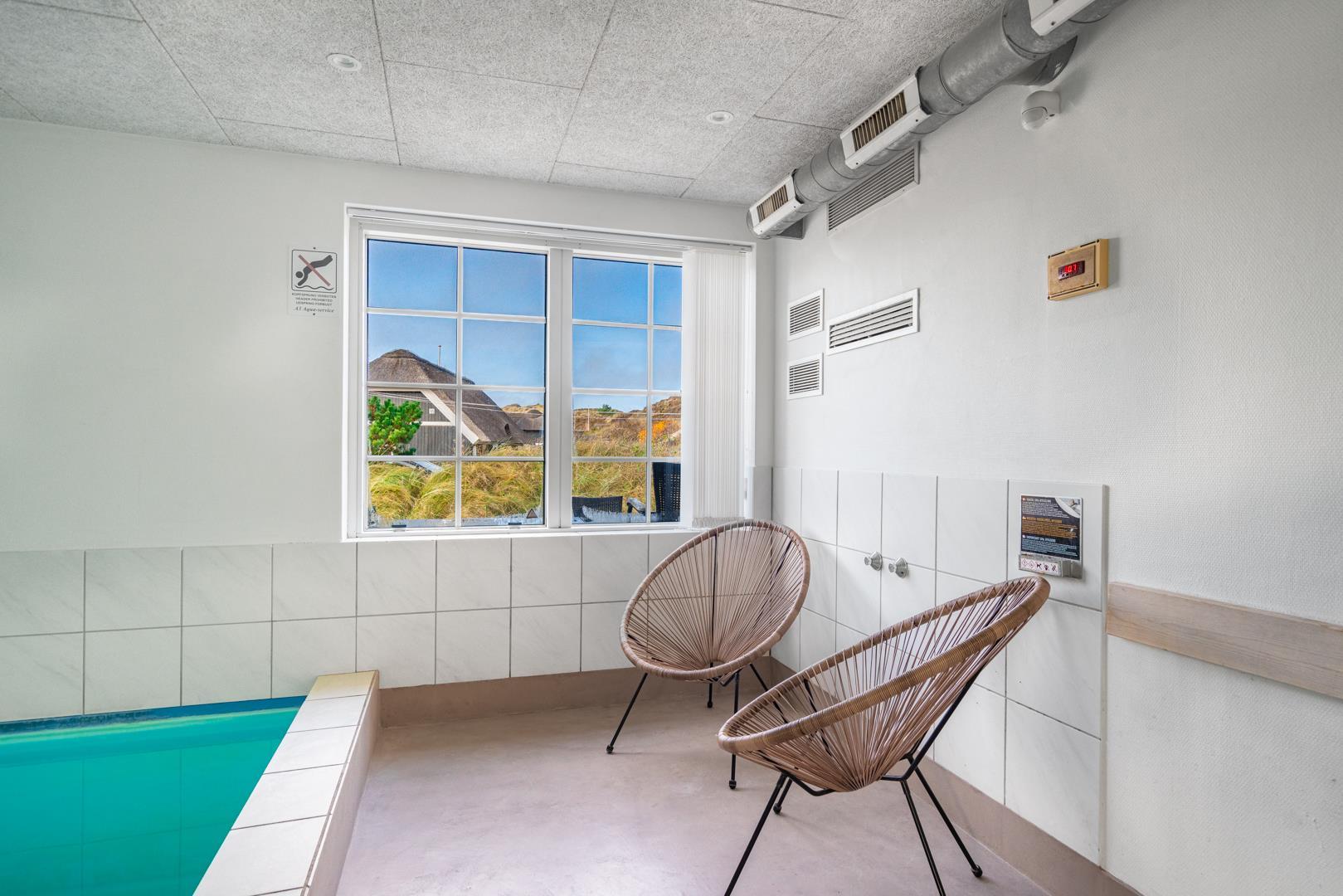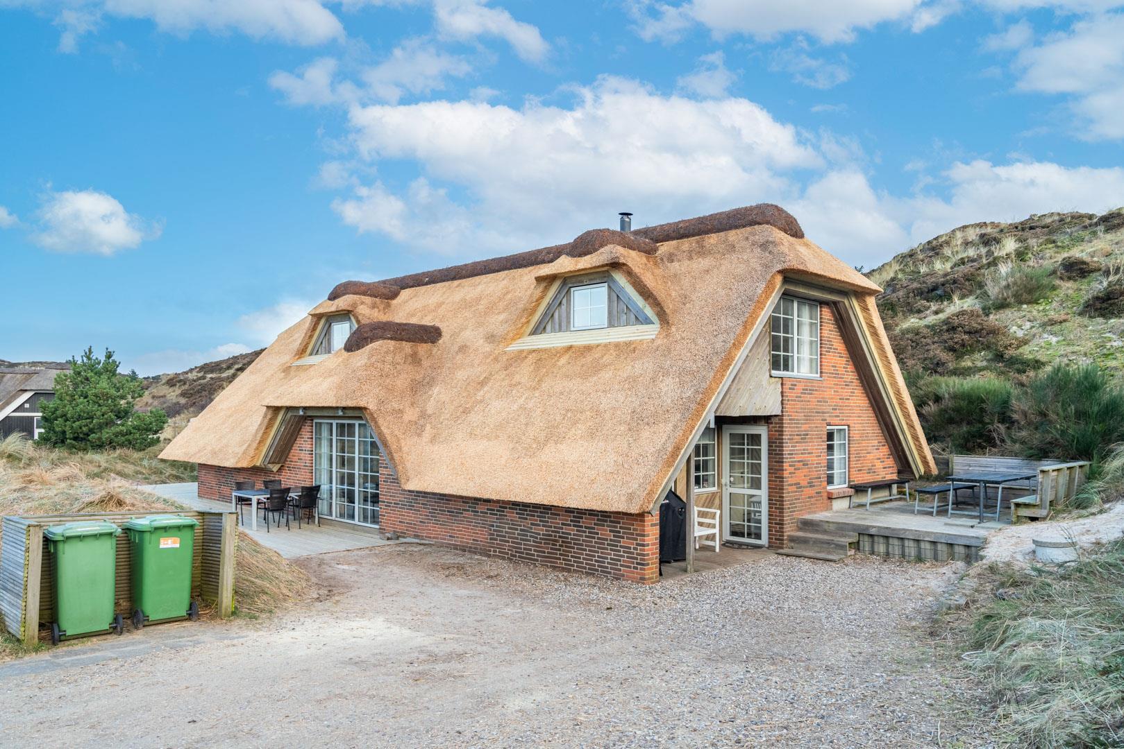 Smagfuldt og rigtig godt indrettet pool hus med stråtag og med en 70 kvm. stor træbelagt terrasse med standvands spa, beliggende på en større ugenert kuperet klitgrund i gåafstand fra Henne Strand by samt den sprudlende Vesterhav. Sommerhuset er praktisk indrettet med rummeligt køkken/alrum med brændeovn samt varmepumpe og herfra er der adgang til 1. salen med ekstra soverum og en unik panoramaudsigt over den flotte og rolige klitområde. Opsat bordfodbold. Pool området ligger i forbindelsen med køkken/alrummet, hvorfra alle aktiviteter i pool rummet kan følges igennem de store panorama vinduer.