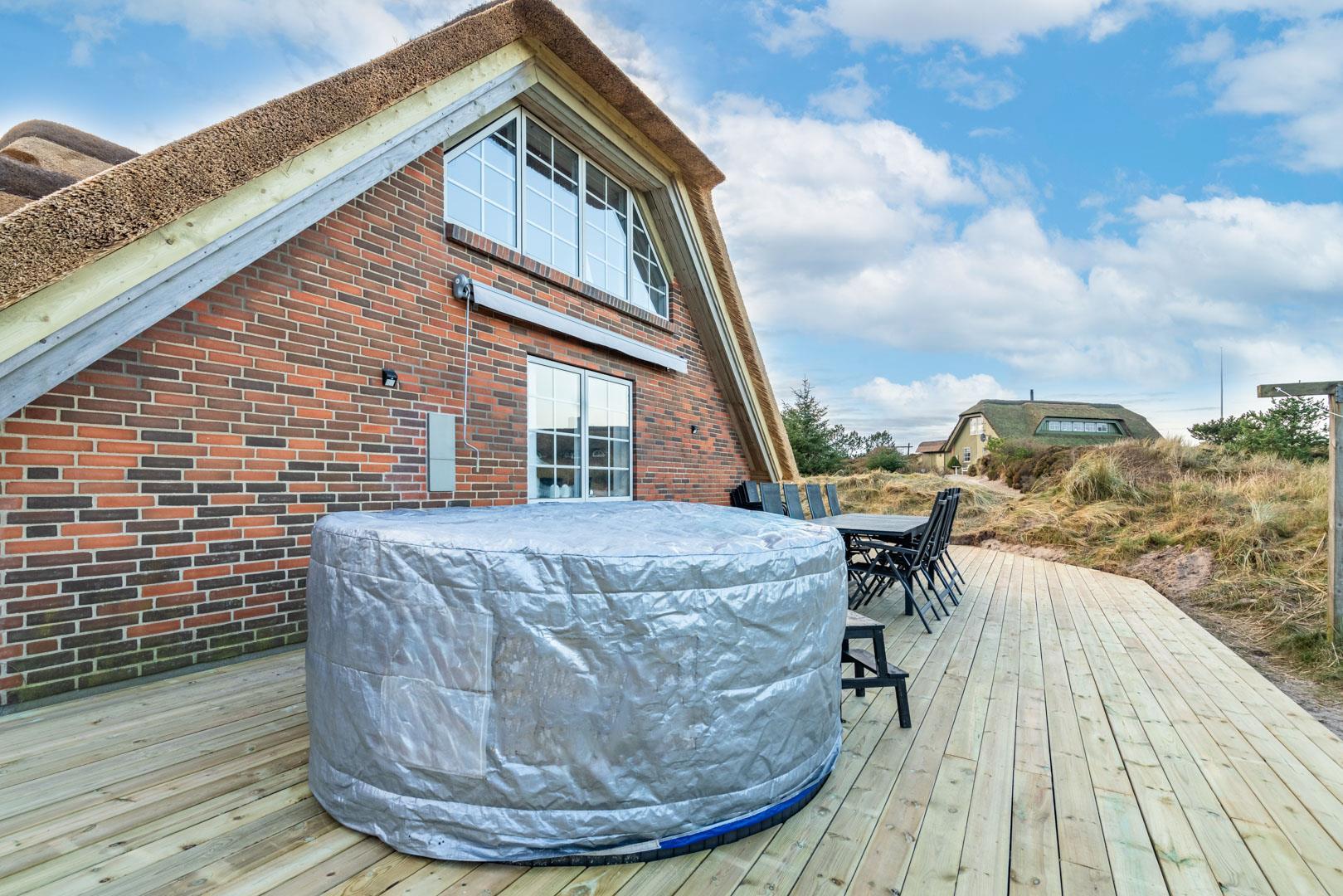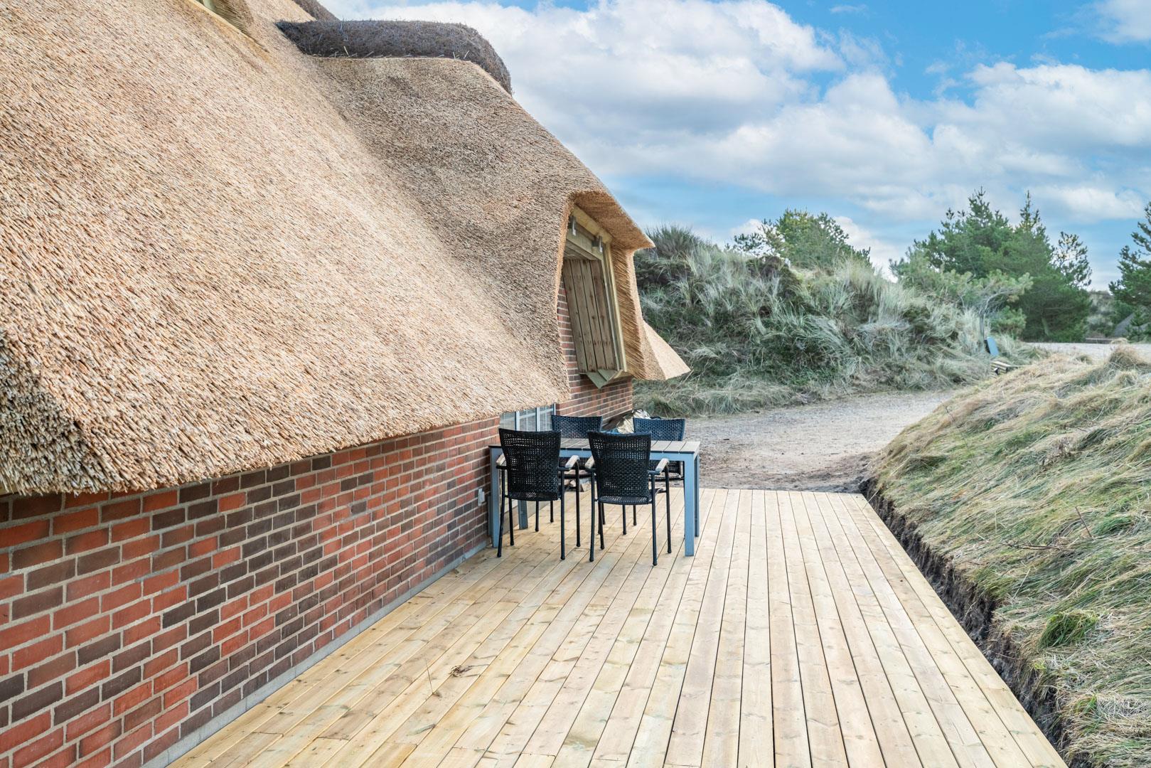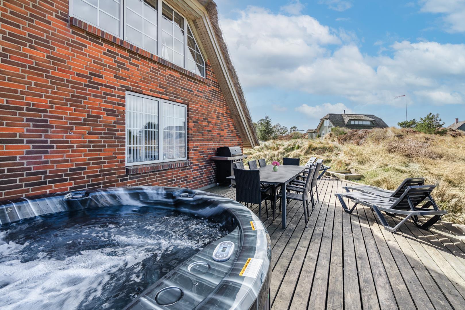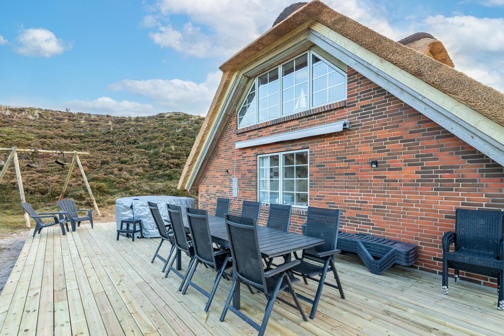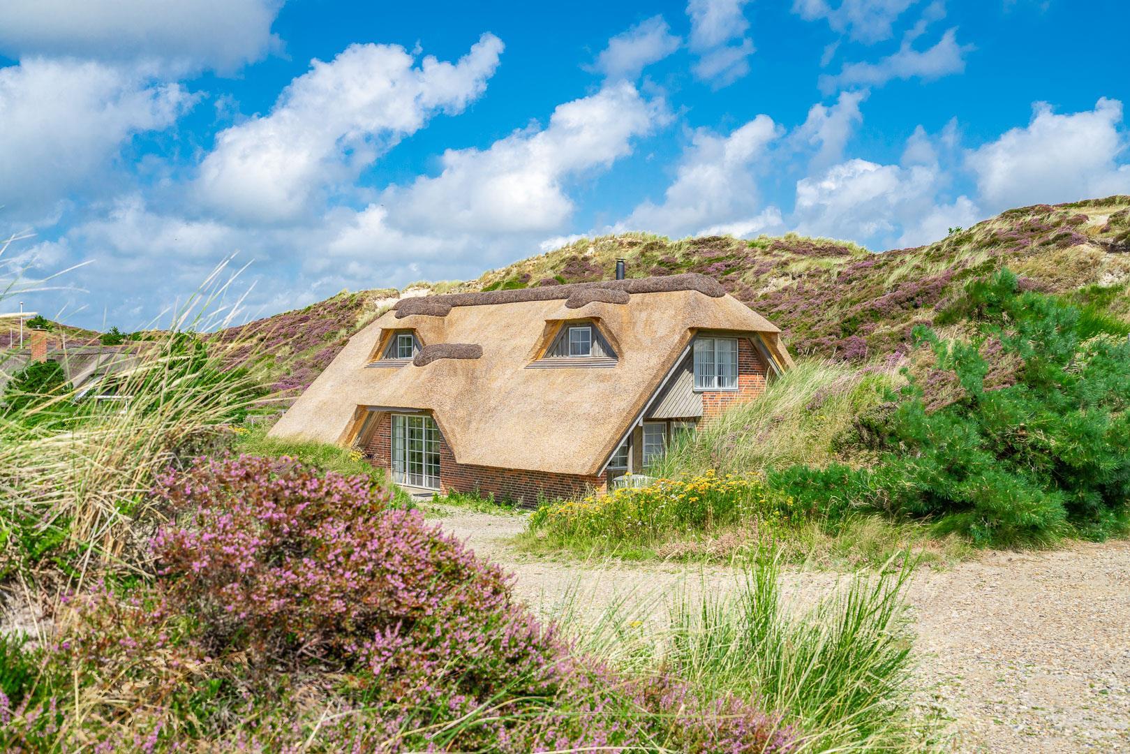 Smagfuldt og rigtig godt indrettet pool hus med stråtag og med en 70 kvm. stor træbelagt terrasse med standvands spa, beliggende på en større ugenert kuperet klitgrund i gåafstand fra Henne Strand by samt den sprudlende Vesterhav. Sommerhuset er praktisk indrettet med rummeligt køkken/alrum med brændeovn samt varmepumpe og herfra er der adgang til 1. salen med ekstra soverum og en unik panoramaudsigt over den flotte og rolige klitområde. Opsat bordfodbold. Pool området ligger i forbindelsen med køkken/alrummet, hvorfra alle aktiviteter i pool rummet kan følges igennem de store panorama vinduer.