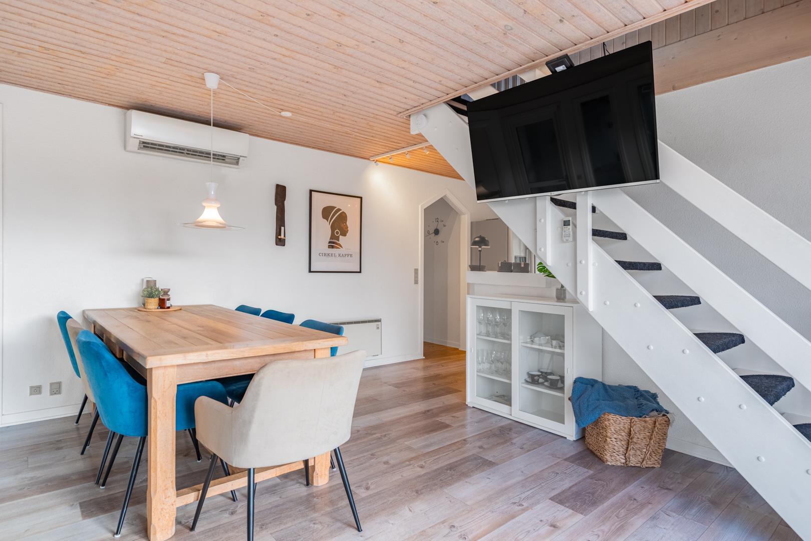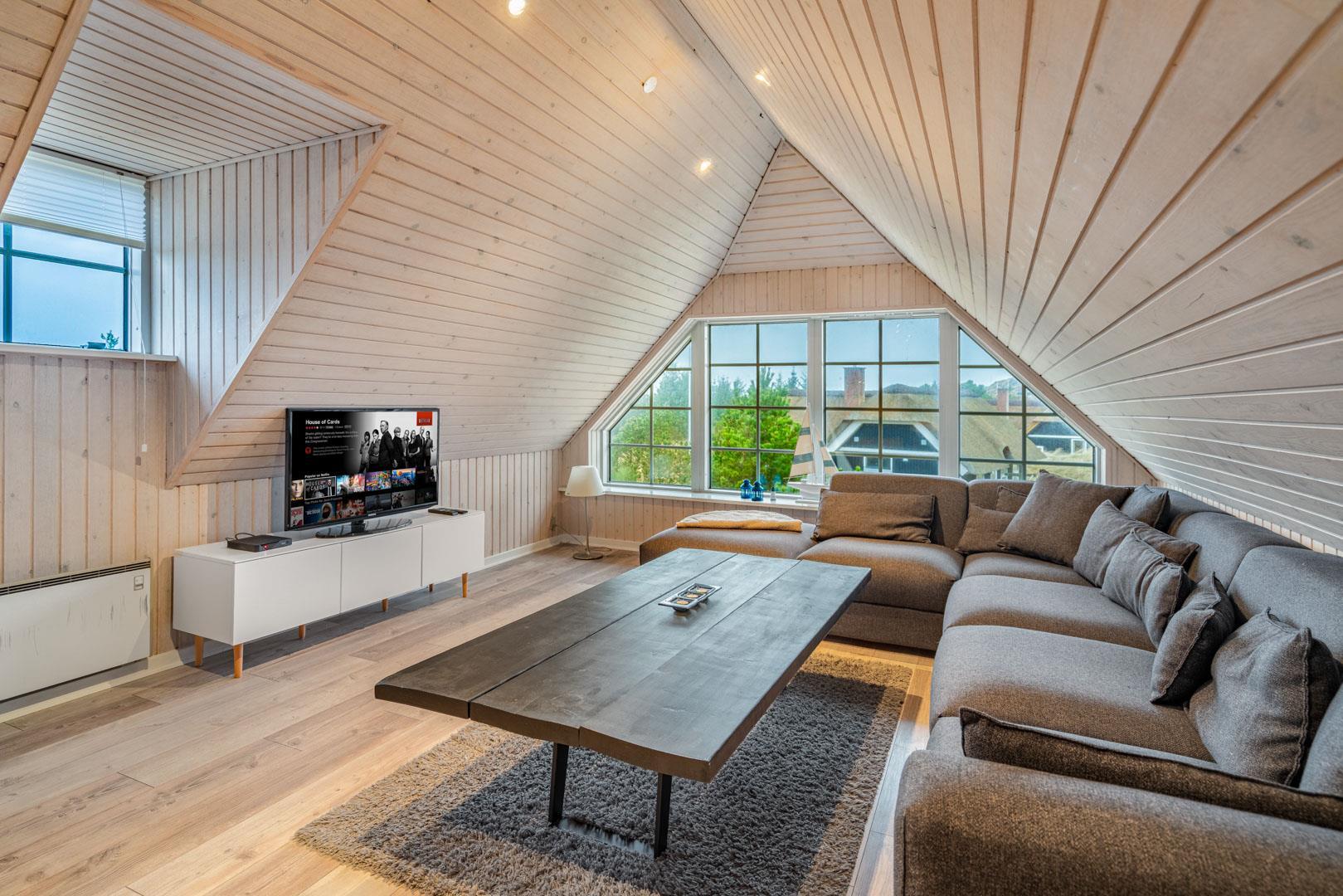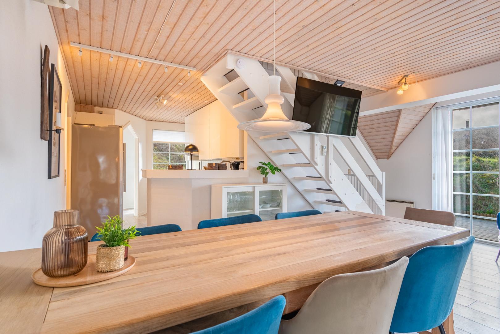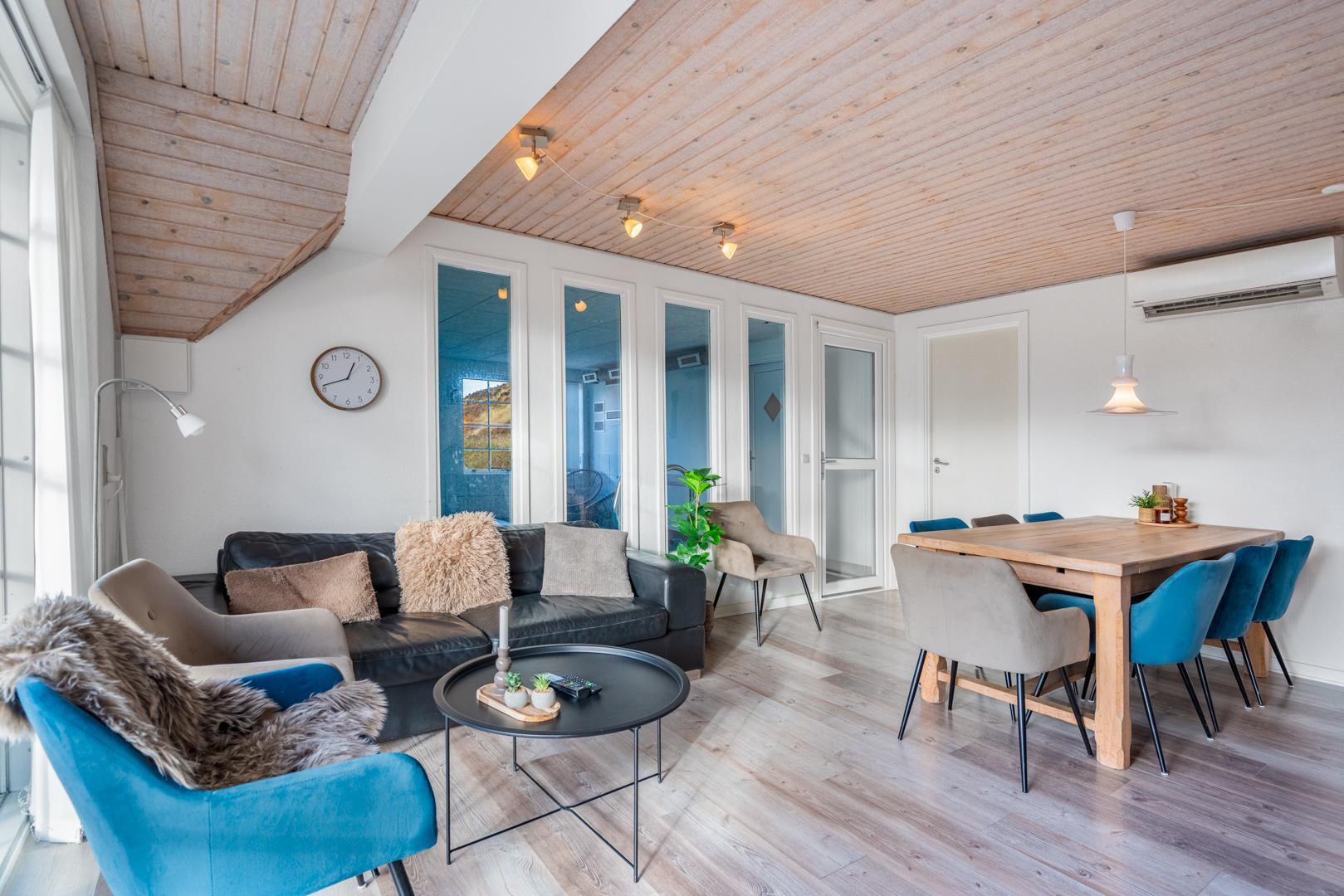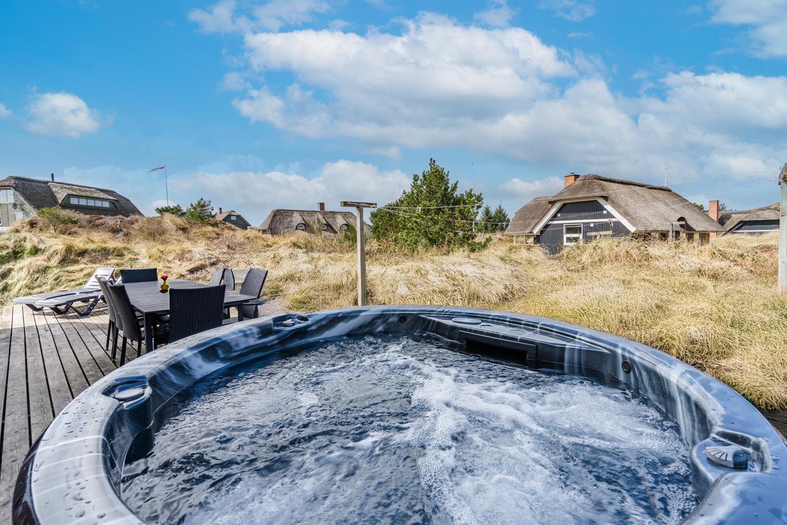 Smagfuldt og rigtig godt indrettet pool hus med stråtag og med en 70 kvm. stor træbelagt terrasse med standvands spa, beliggende på en større ugenert kuperet klitgrund i gåafstand fra Henne Strand by samt den sprudlende Vesterhav. Sommerhuset er praktisk indrettet med rummeligt køkken/alrum med brændeovn samt varmepumpe og herfra er der adgang til 1. salen med ekstra soverum og en unik panoramaudsigt over den flotte og rolige klitområde. Opsat bordfodbold. Pool området ligger i forbindelsen med køkken/alrummet, hvorfra alle aktiviteter i pool rummet kan følges igennem de store panorama vinduer.