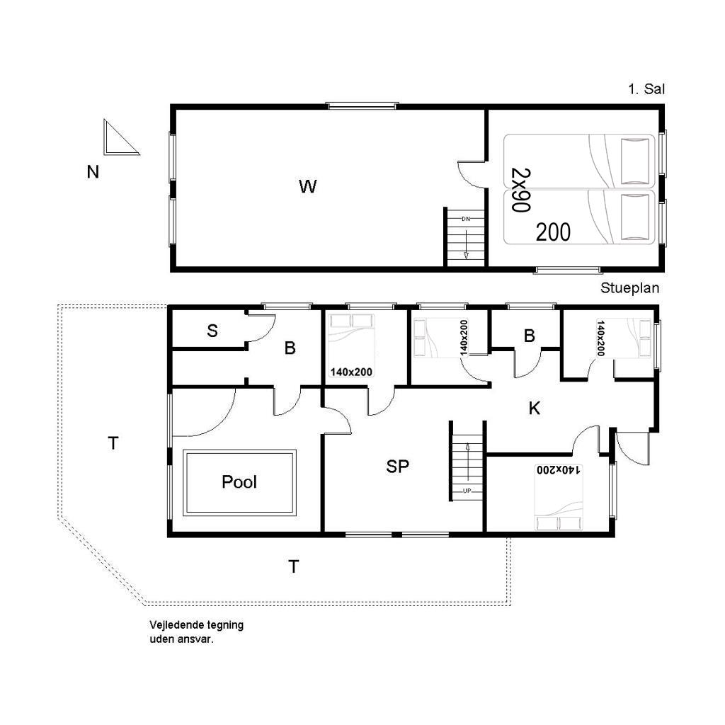 Sengestørrelser: 2 dobbeltsenge med 2 madrasser 90 x 200 cm + 4 dobbeltsenge 140 x 200 cm
