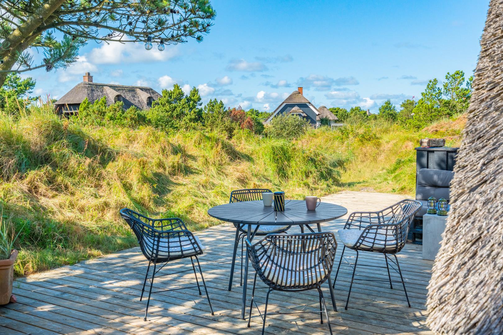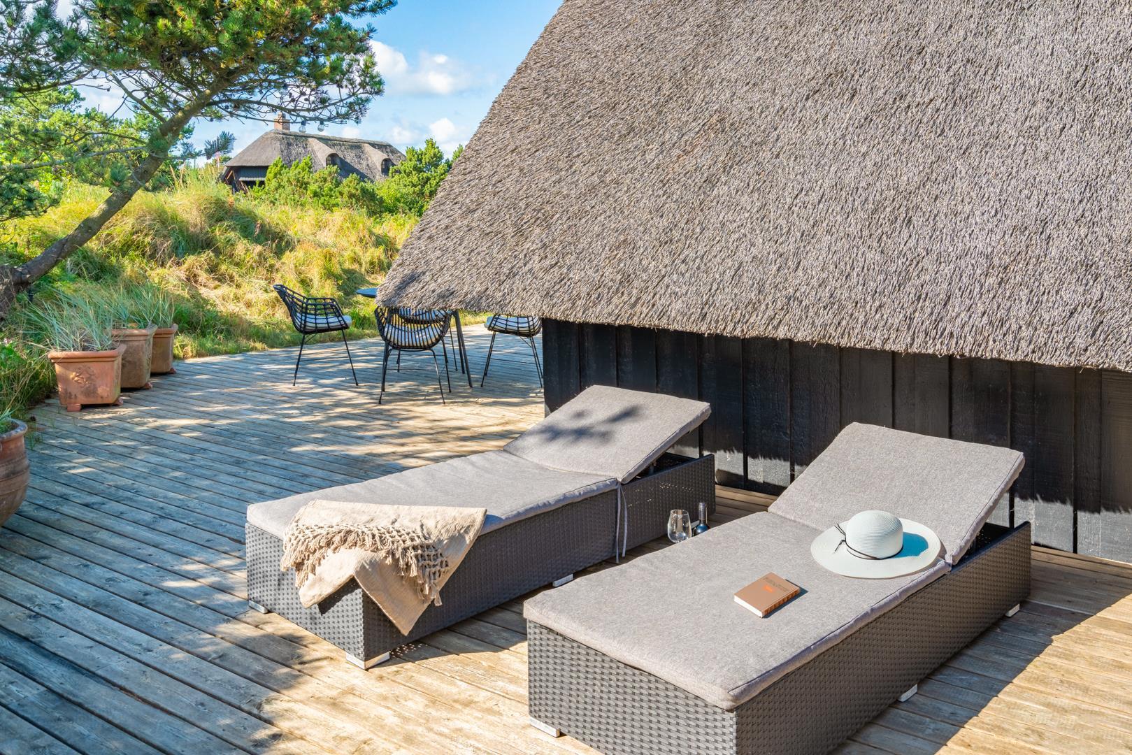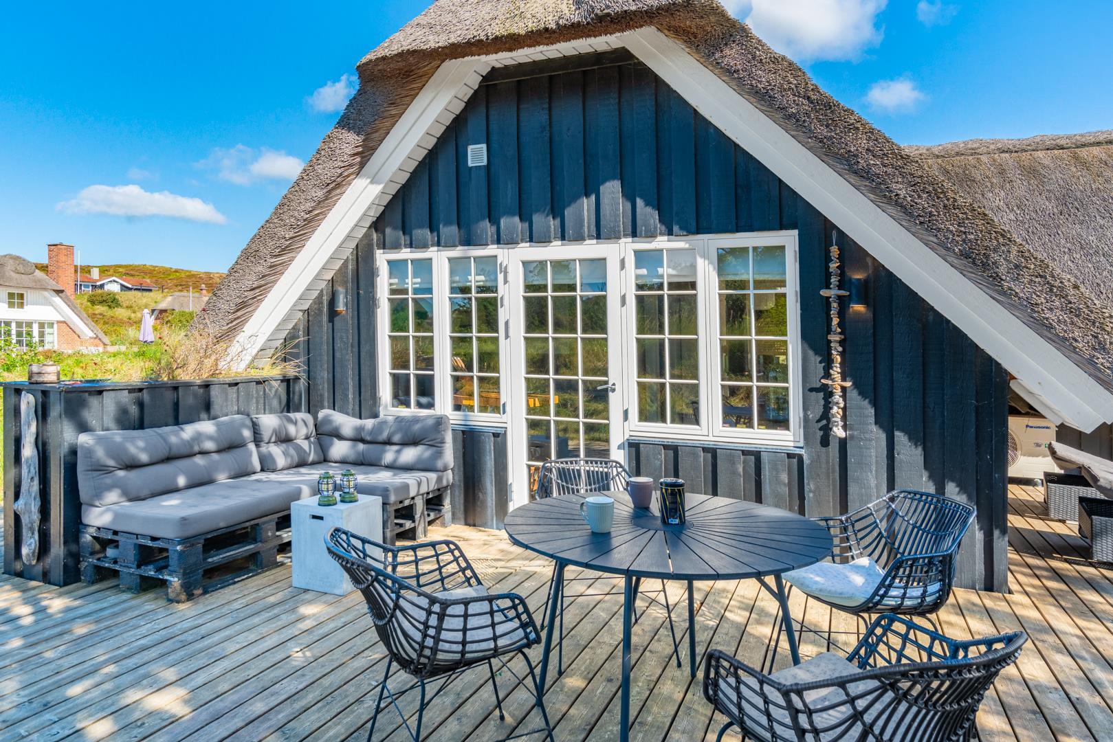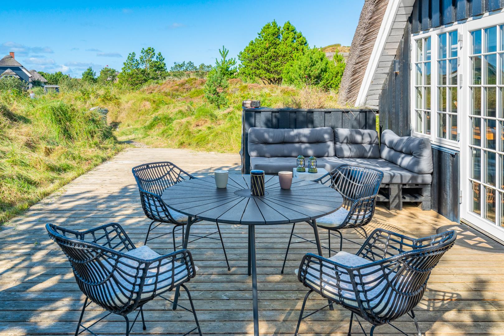 Rundt om huset findes flere dejlige solterrasser, hvor du altid kan finde en læfyldt krog, uanset vindretningen.