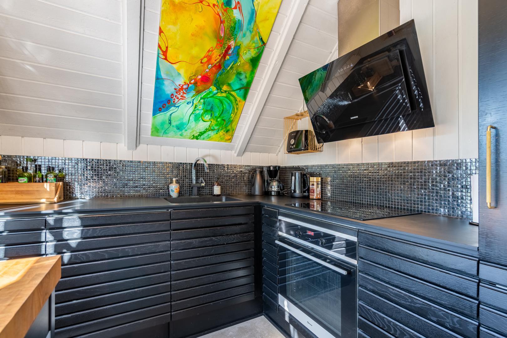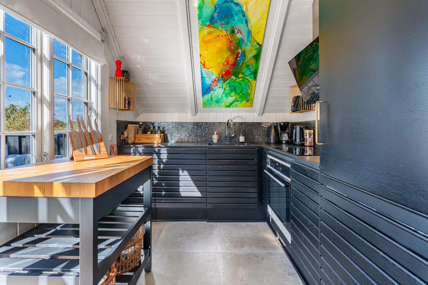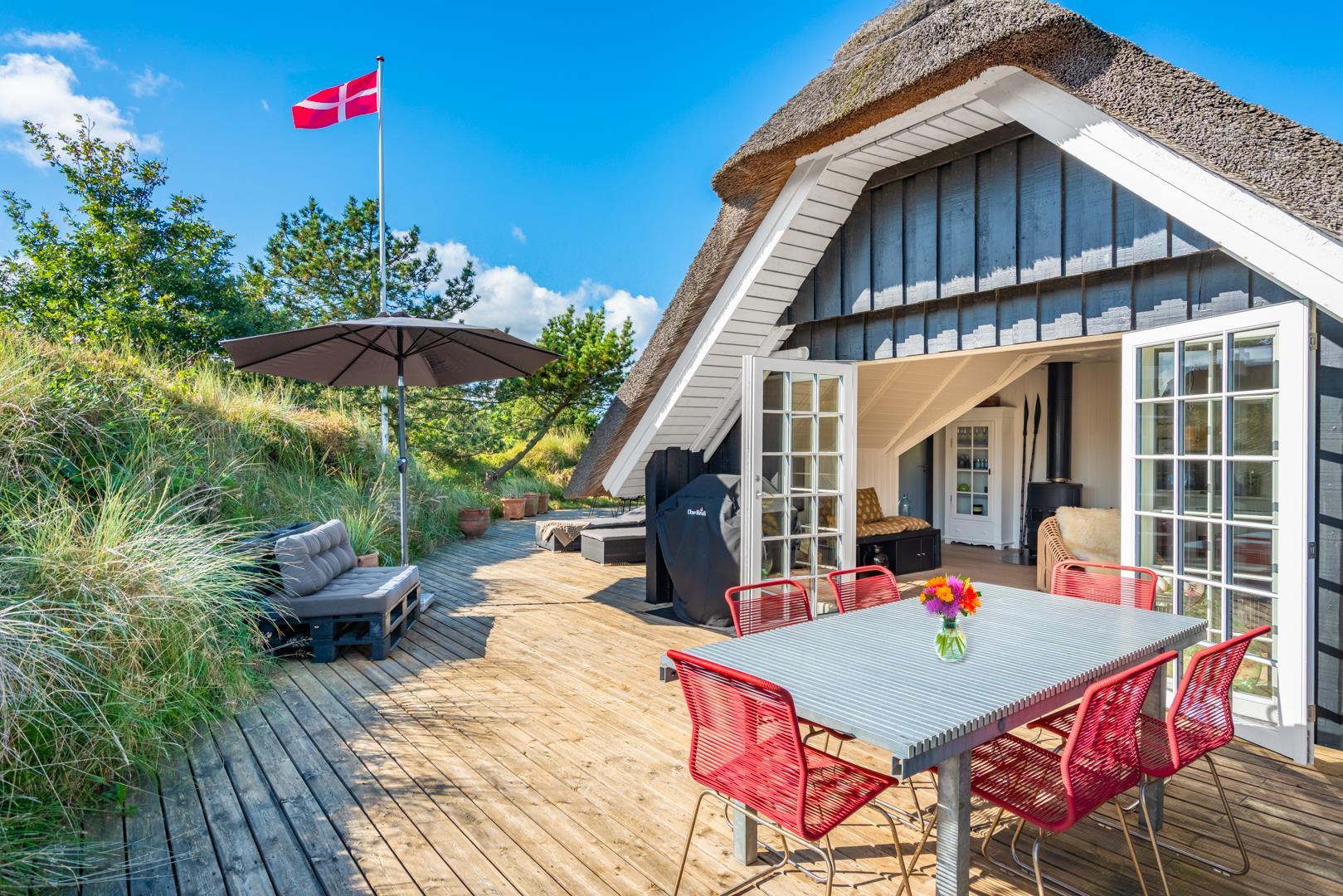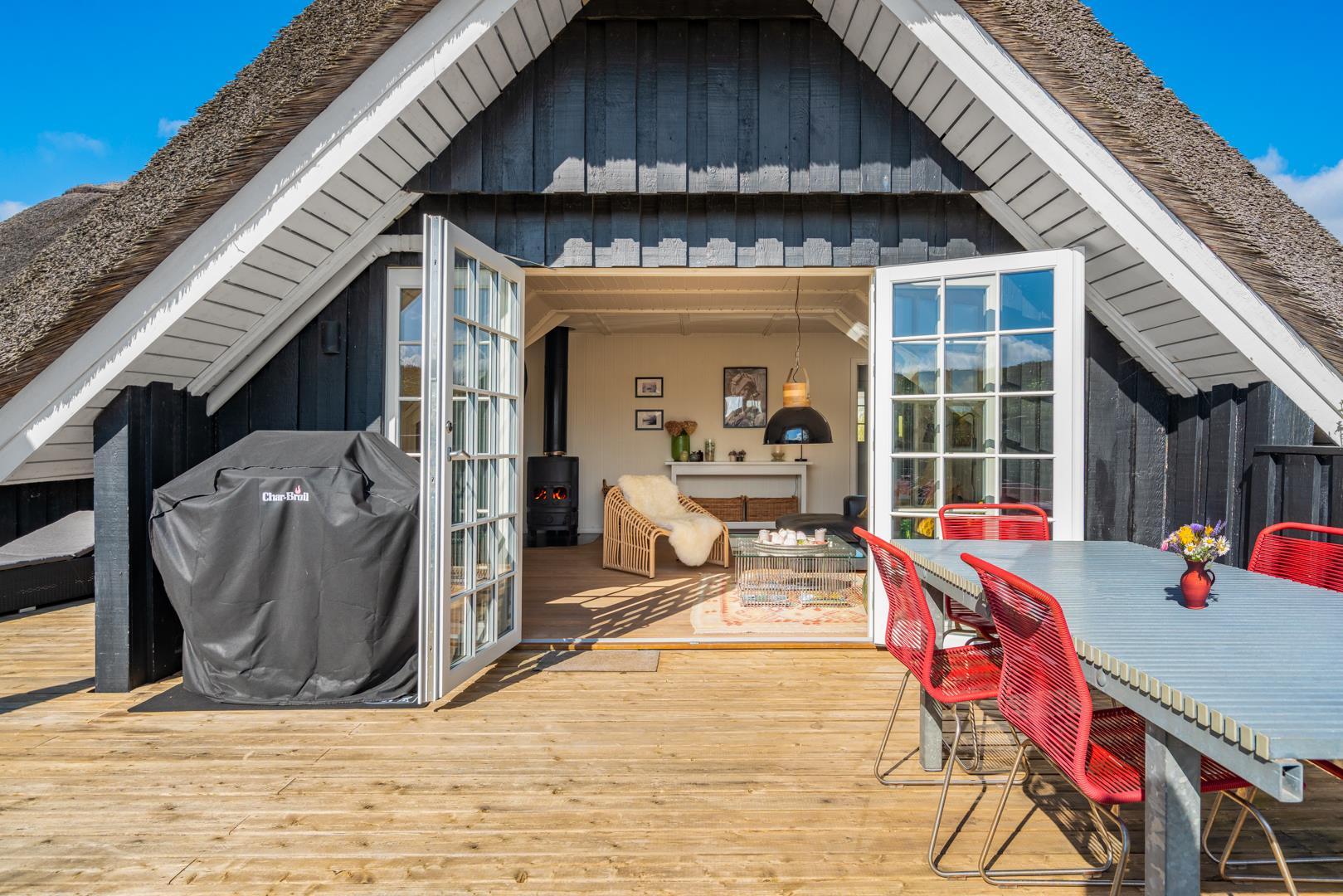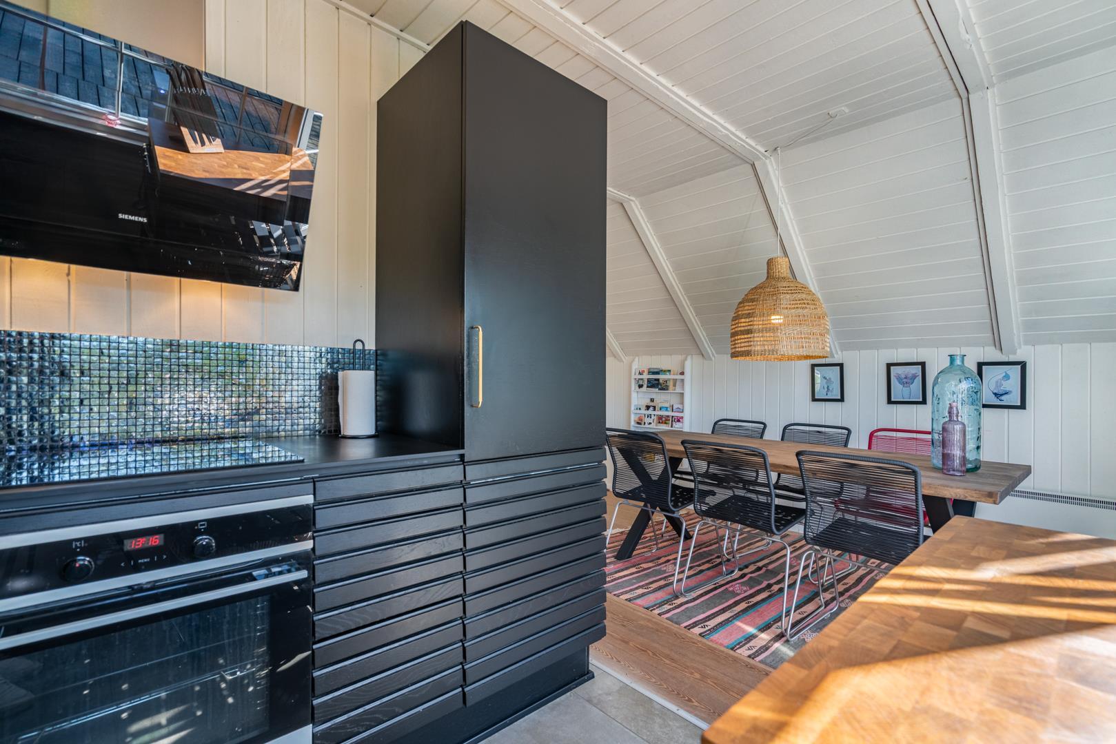 Det åbne køkken og hyggelige spiseområde har direkte udgang til en stor, sydvendt træterrasse – det perfekte sted at nyde morgenkaffen i solen eller lange sommeraftener under åben himmel.