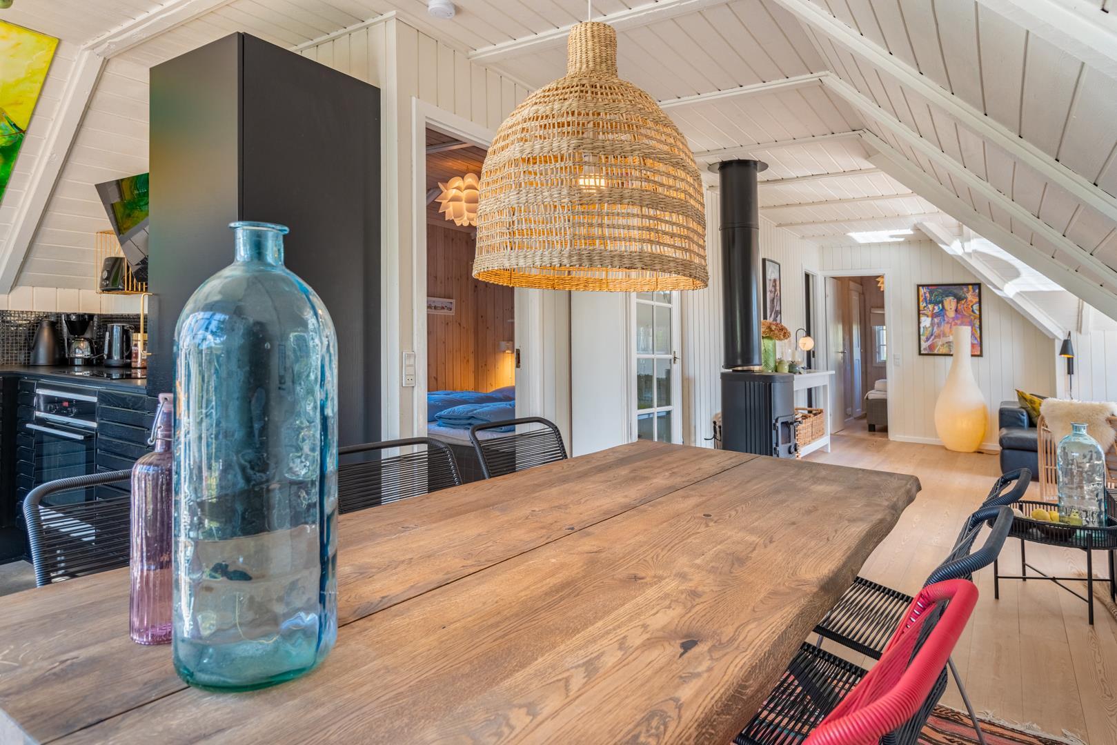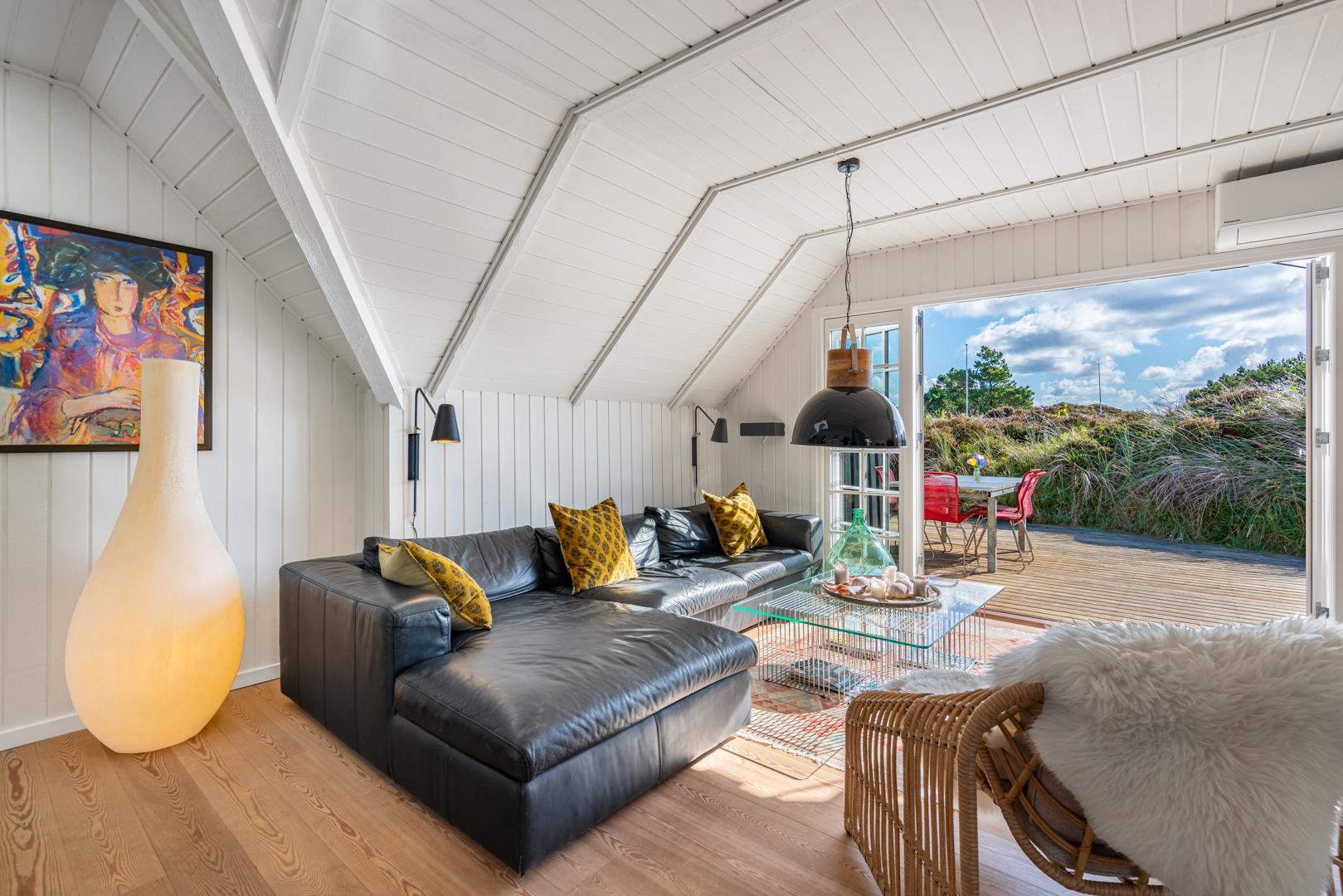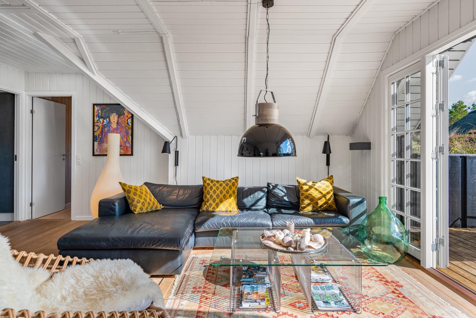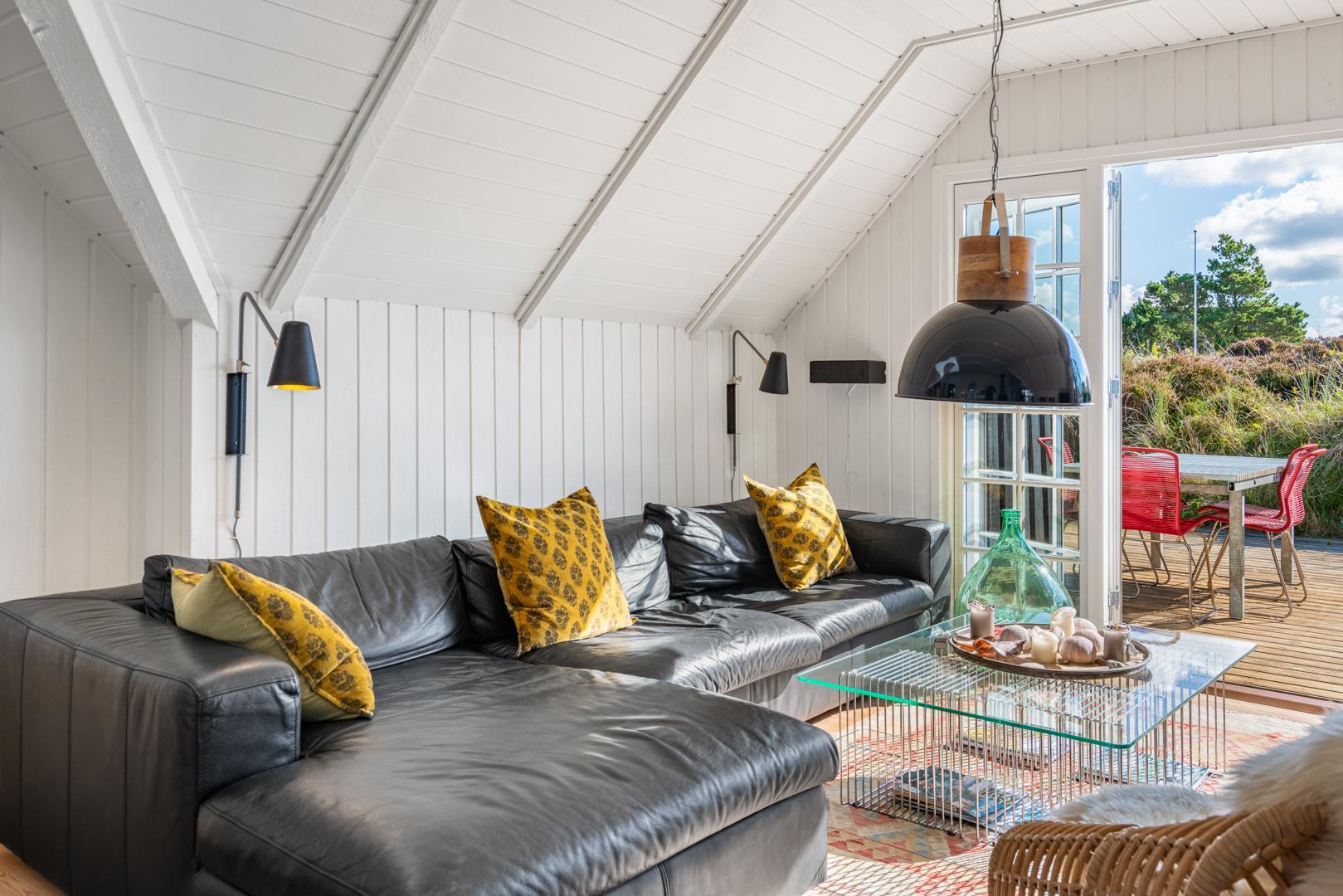 De lyse opholdsrum er indrettet med flotte møbler og fine detaljer, der understreger den autentiske sommerhusstemning.